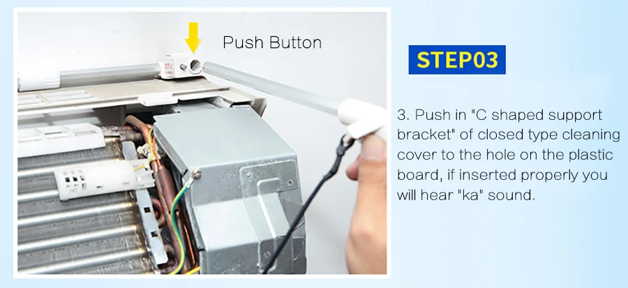 4. Поместите крышку закрытого типа на опорный кронштейн с-образной формы, вставьте эти две маленькие прозрачная пленка с обеих сторон в заднюю часть кондиционера.