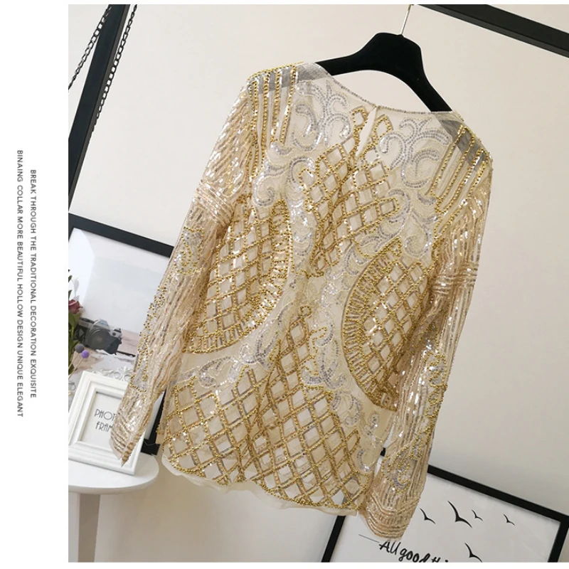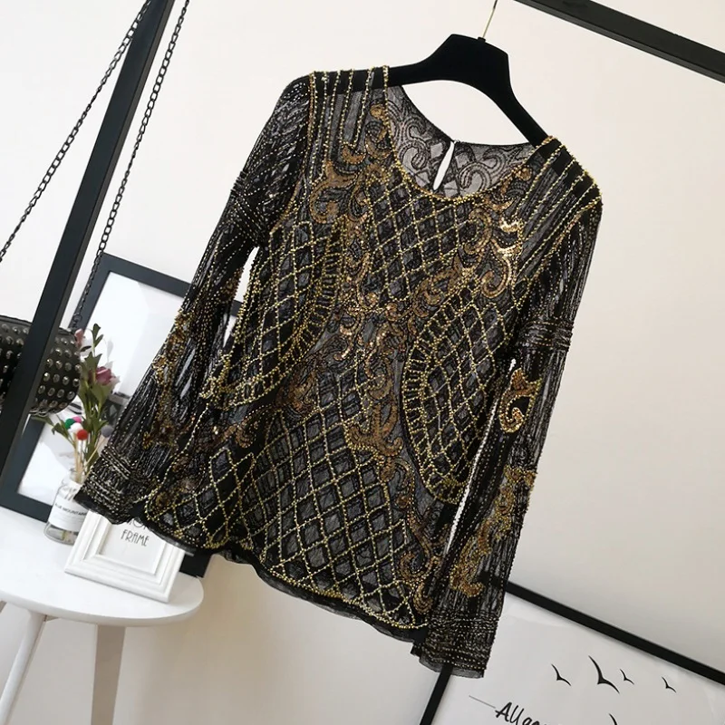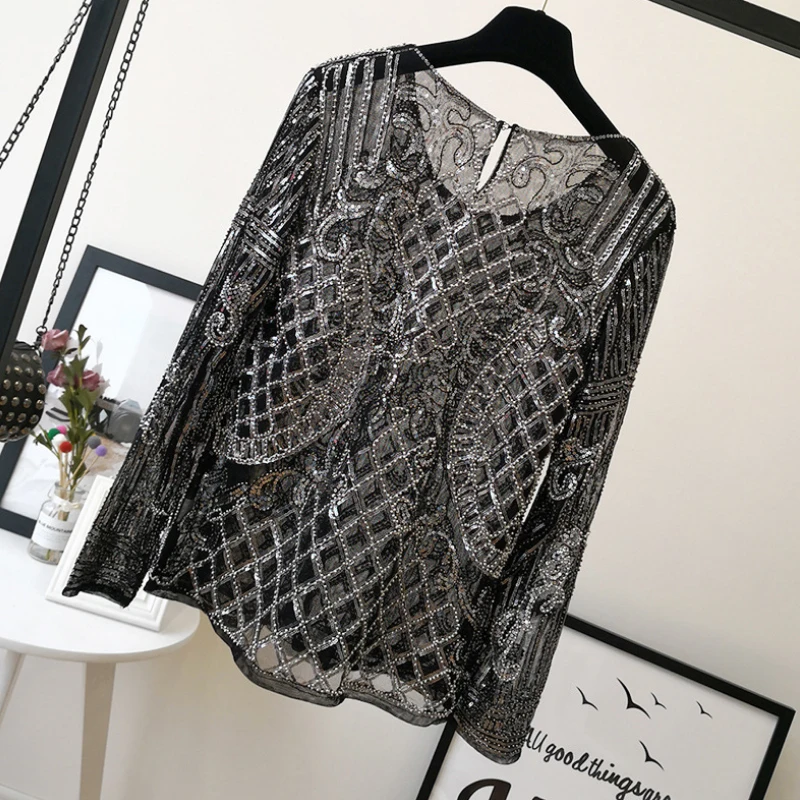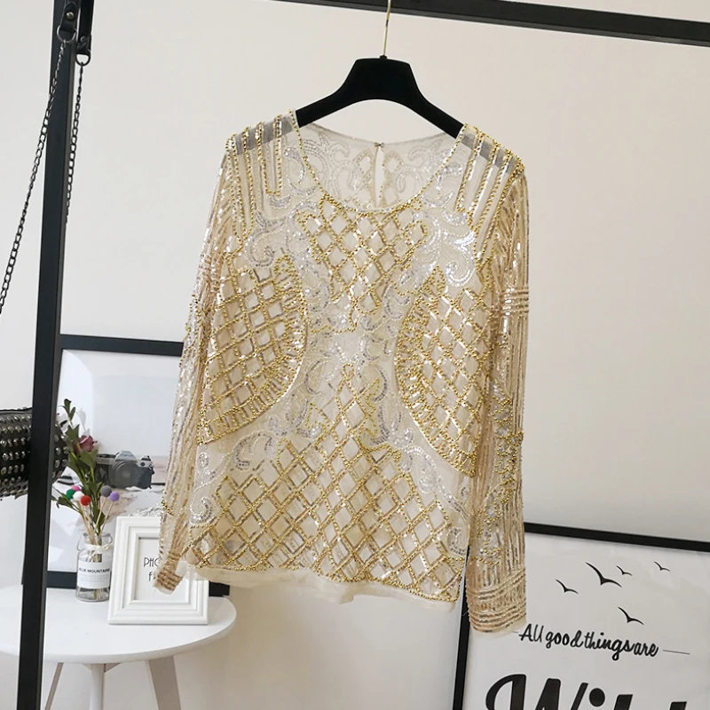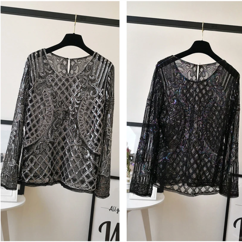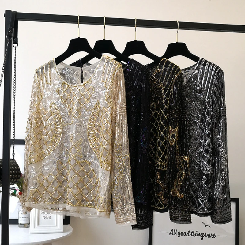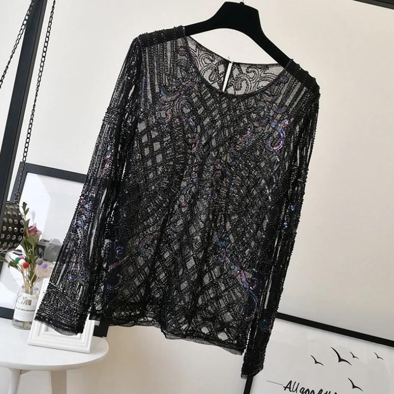 Женская футболка с длинным рукавом, круглым вырезом и блестками