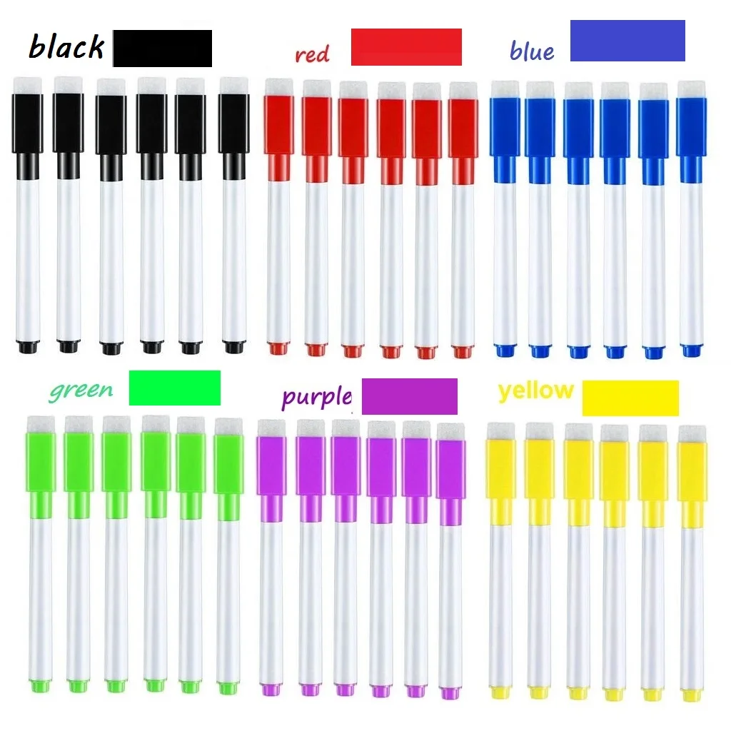 Маркеры для белой доски, 6 шт., стираемые тонкие перьевые ручки с ластиком, магнитные маркеры для письма, черные, синие, красные, фиолетовые
