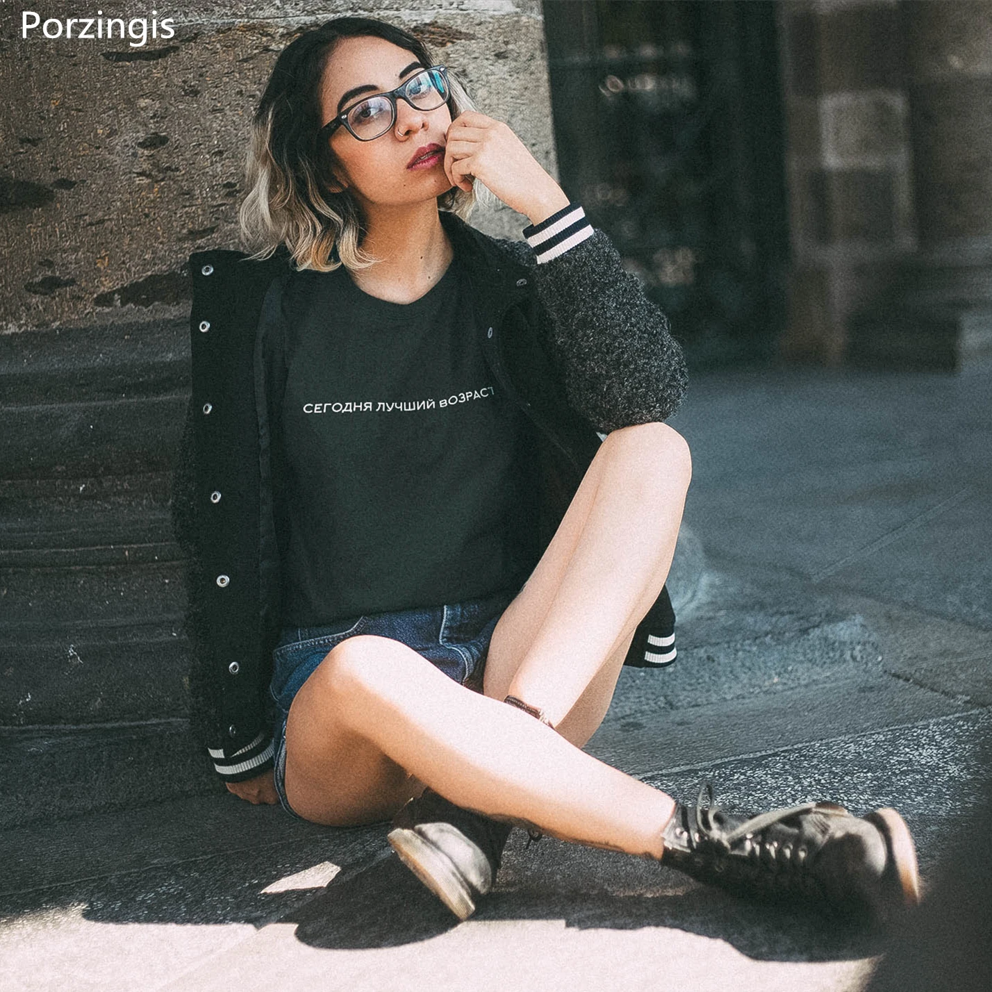 Футболка женская с надписью Today Is The Best Age, хлопковая черная рубашка в русском стиле со слоганом, Повседневная летняя футболка