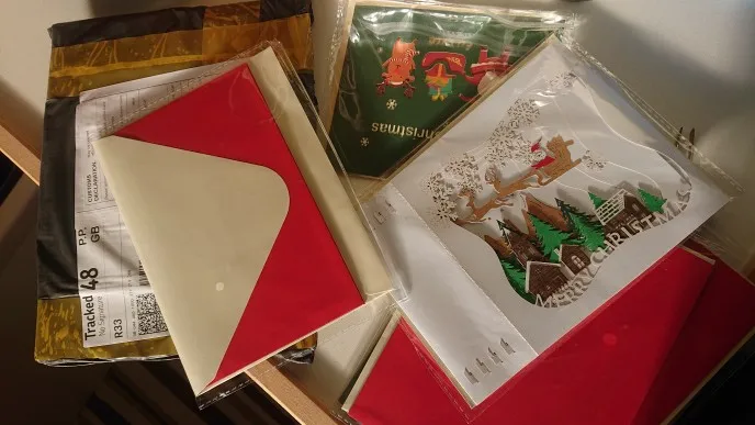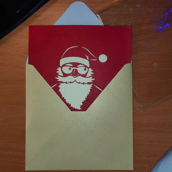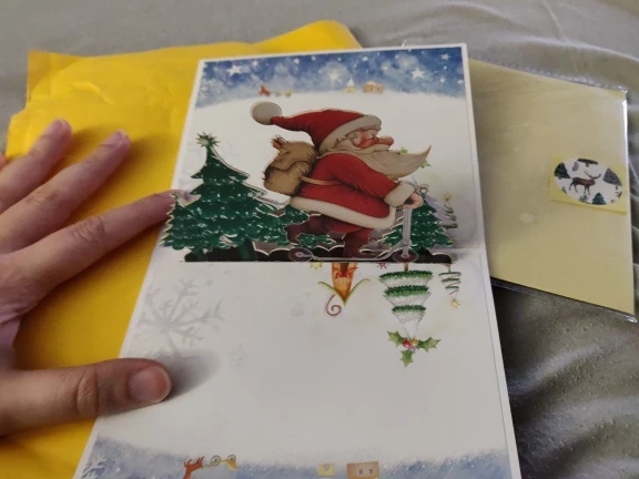 Очень хорошо упаковано, красивый конверт для открытки и ещё бонус наклейка санты ☺️