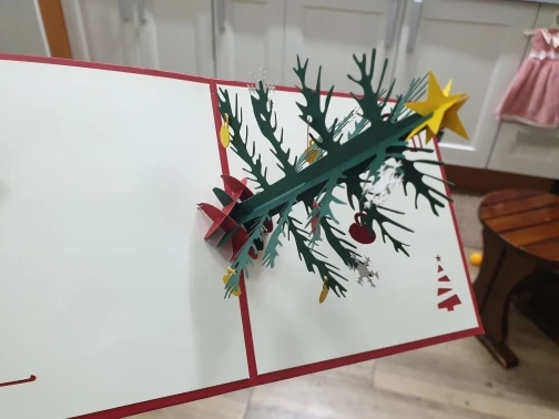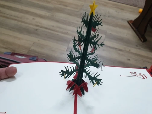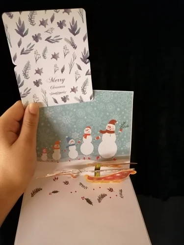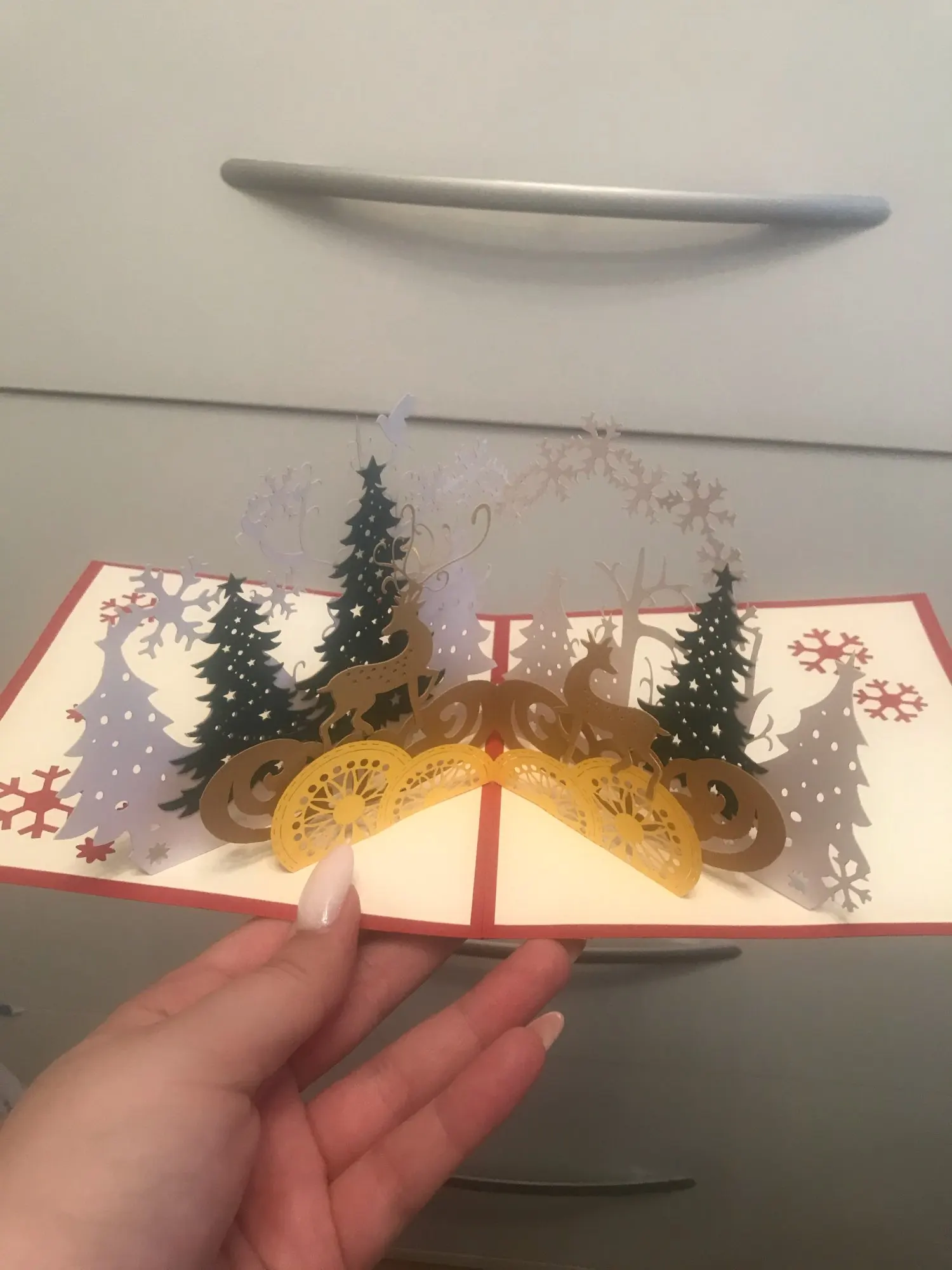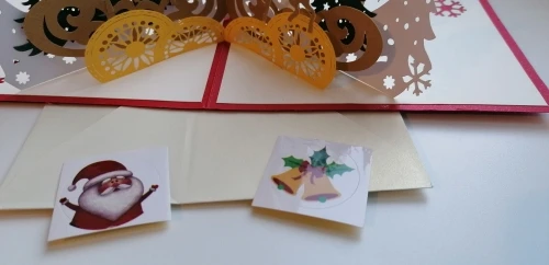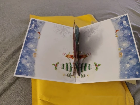 Быстрая доставка, открытка качественная и красивая, идёт вместе с конвертом. Шарики на ёлке сделаны из тонкой бумаги, поэтому надо быть аккуратным, чтобы их случайно не порвать. Внутри карточка вынимается и можно подписать. С обратной стороны рисунок с подарками. Продавец положил стикер-наклейку на конверт.