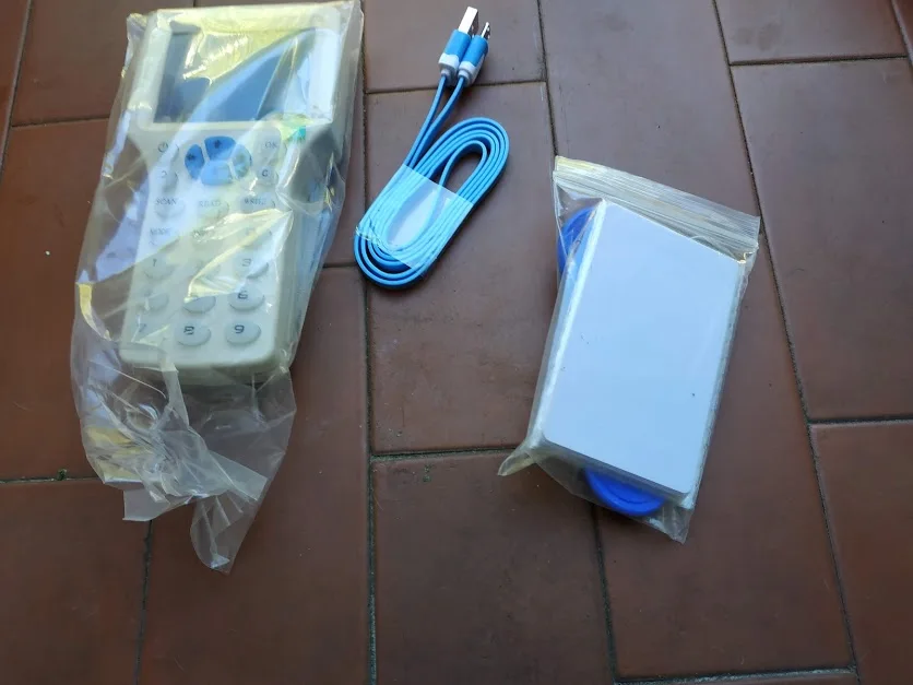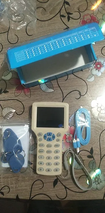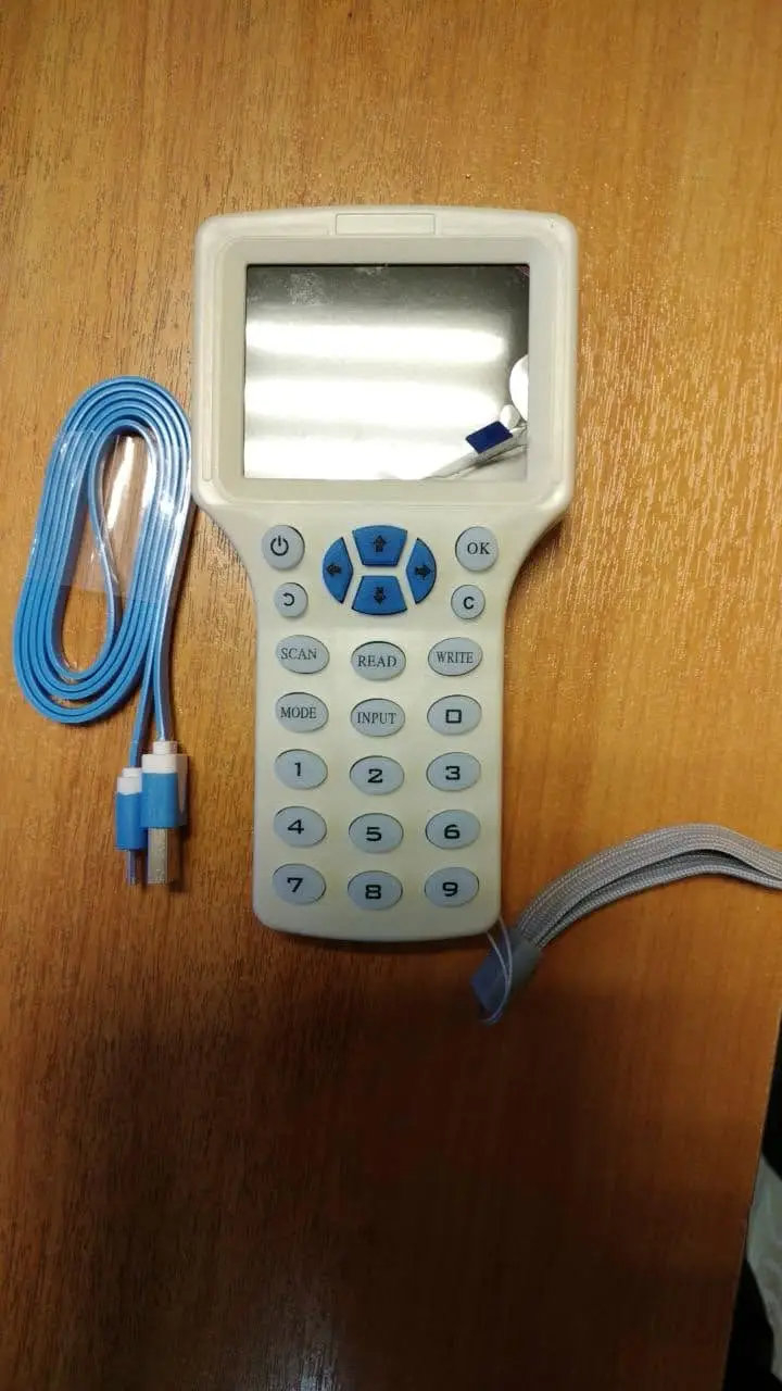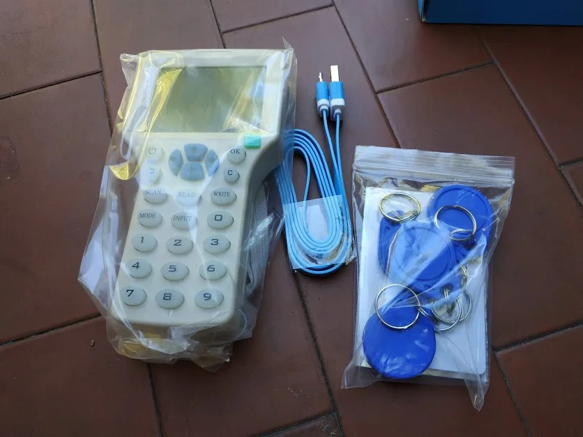 Все работает. Как ни странно, оказалось, что у нас дома в Сочи, домофоны в основном 125 KHz брелки. А в комплекте брелки идут как раз 16, а на 125 только карточки. Так что берите лучше сканер чистый, а уже как получите, сканируйте свой брелок, и уже потом только заказывайте плюшки. Сканер пришел компанией DPD в офис Билайн. Пока все огонь, все работает. Нужны 4 батарейки мезинчиковые. Есть USB кабель. В устройстве есть своя память и программа для вскрытия шифрованных карт. Подключаем к ПК и копируем.