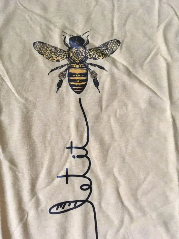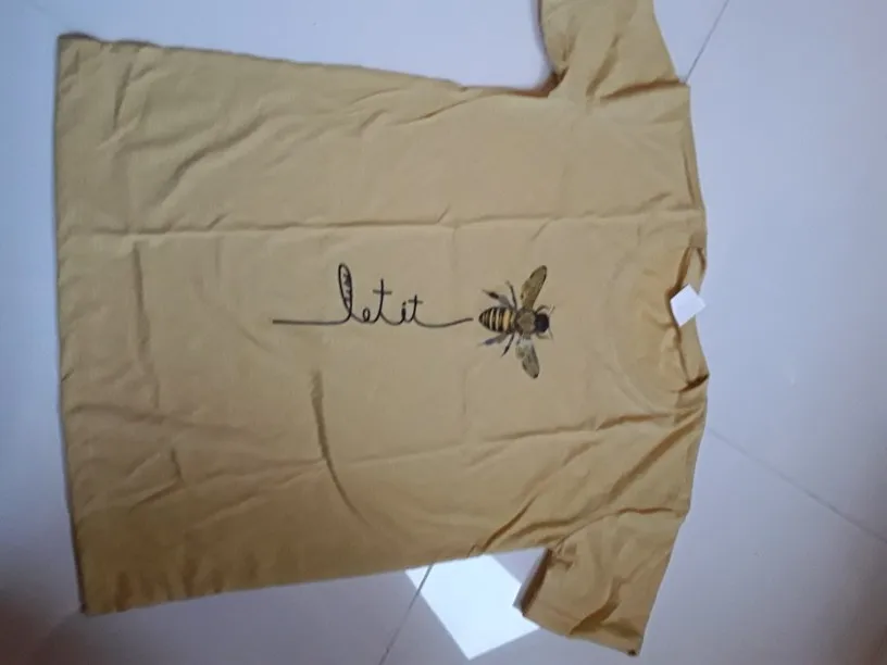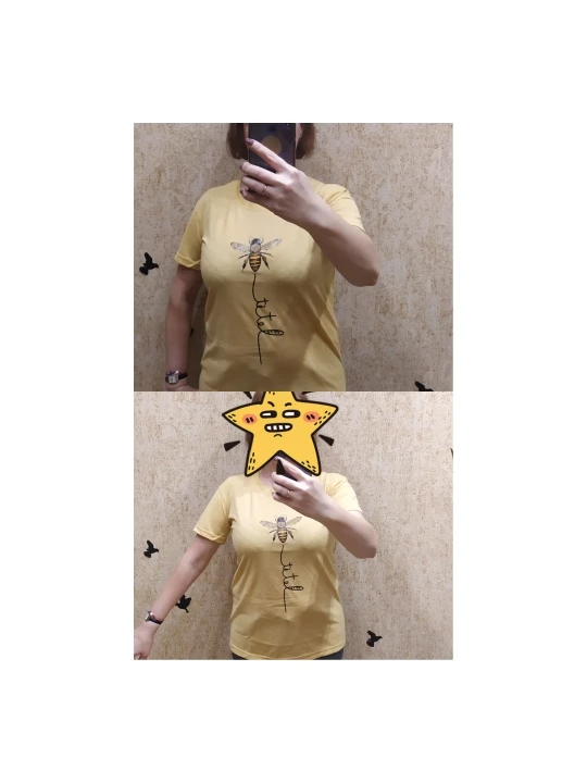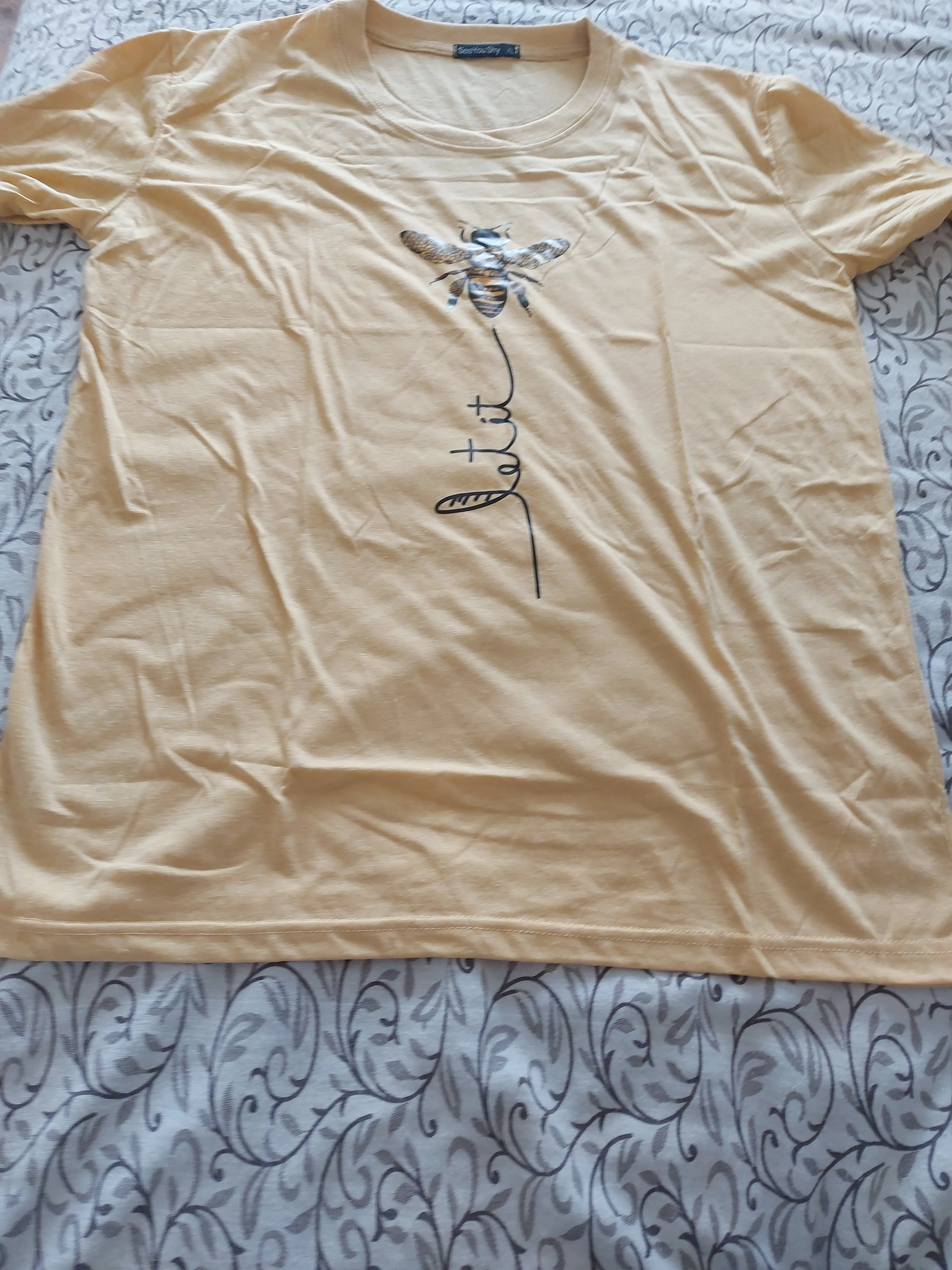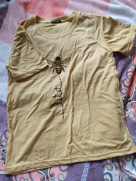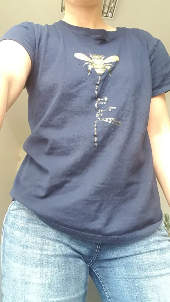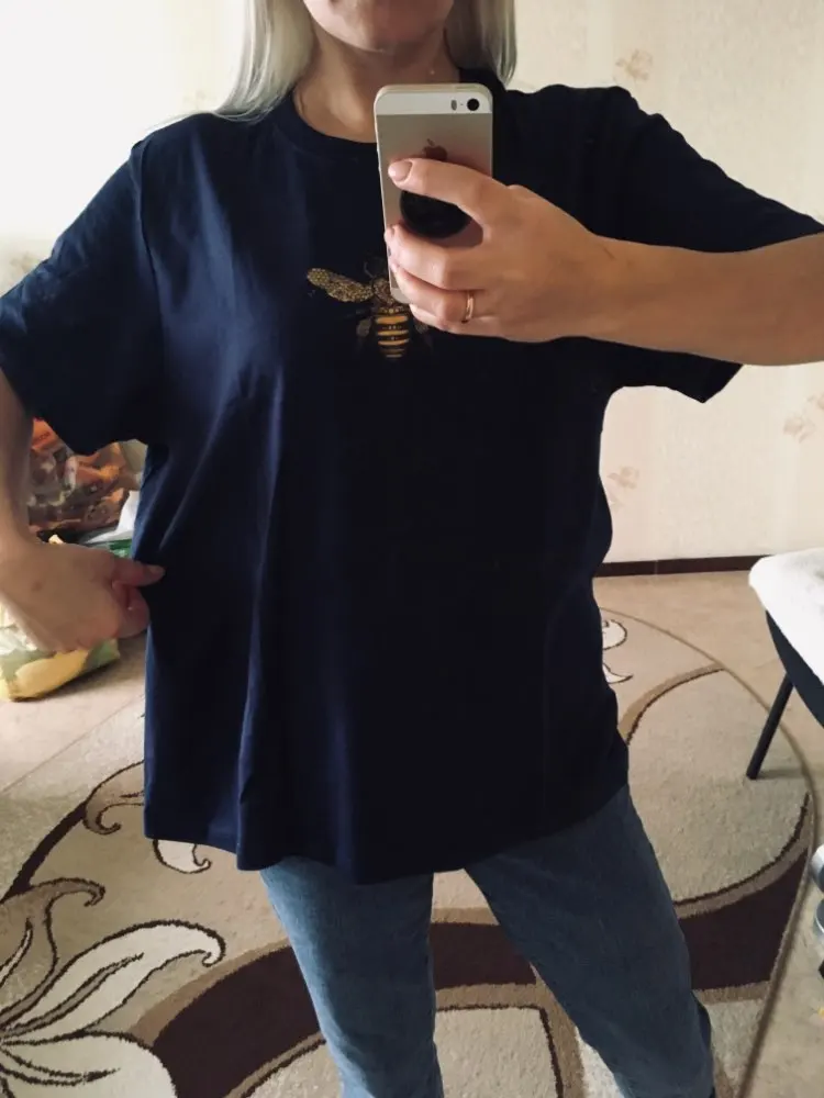 Купила несколько разных футболок у разных продавцов, так эта больше всего понравилась.И пошив, и материал, и размер, цвет, и пчёлка, и доставка - всё супер!
