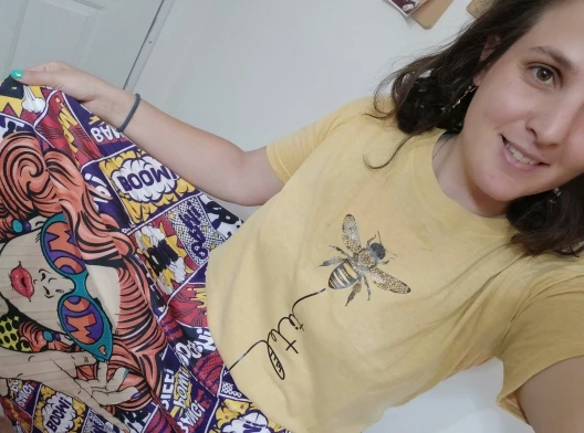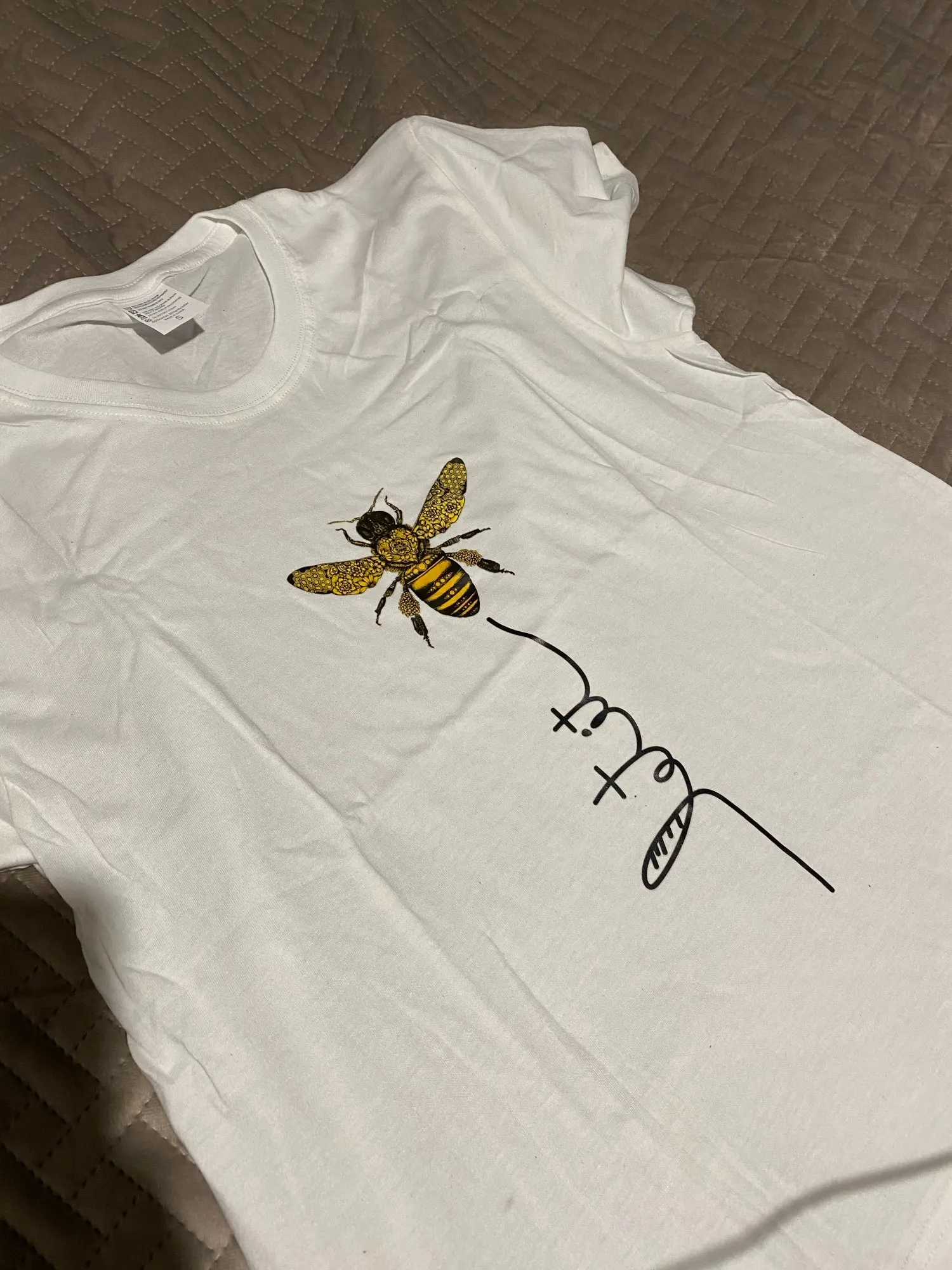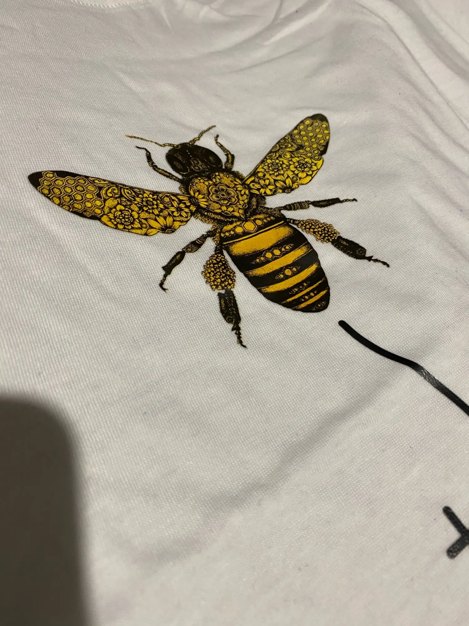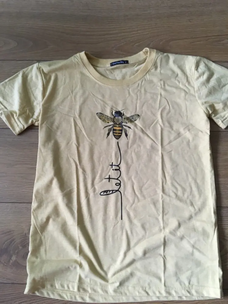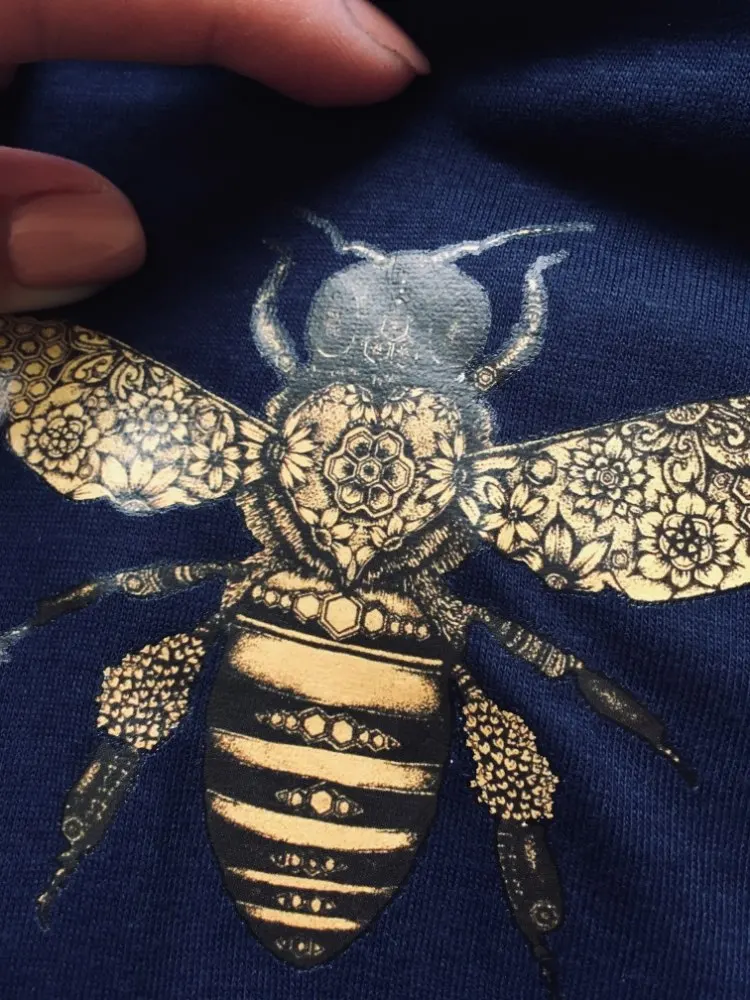 Купила несколько разных футболок у разных продавцов, так эта больше всего понравилась.И пошив, и материал, и размер, цвет, и пчёлка, и доставка - всё супер!
