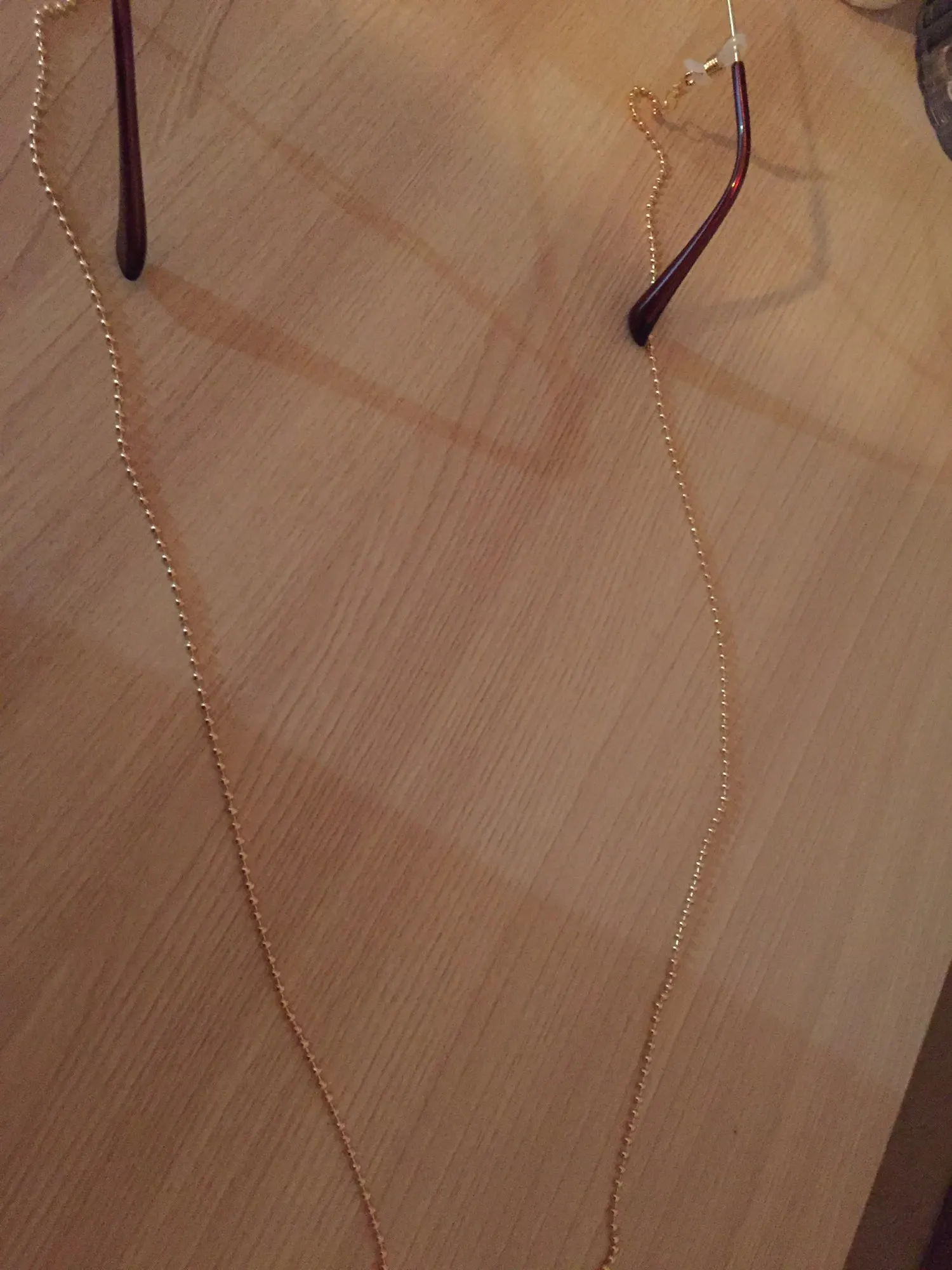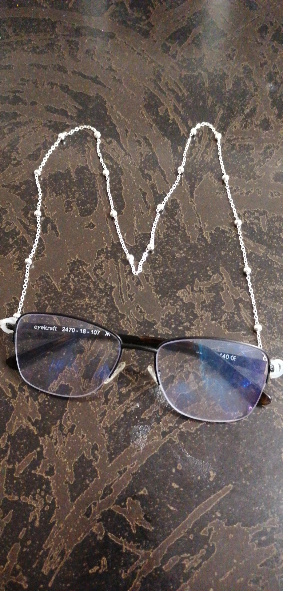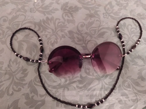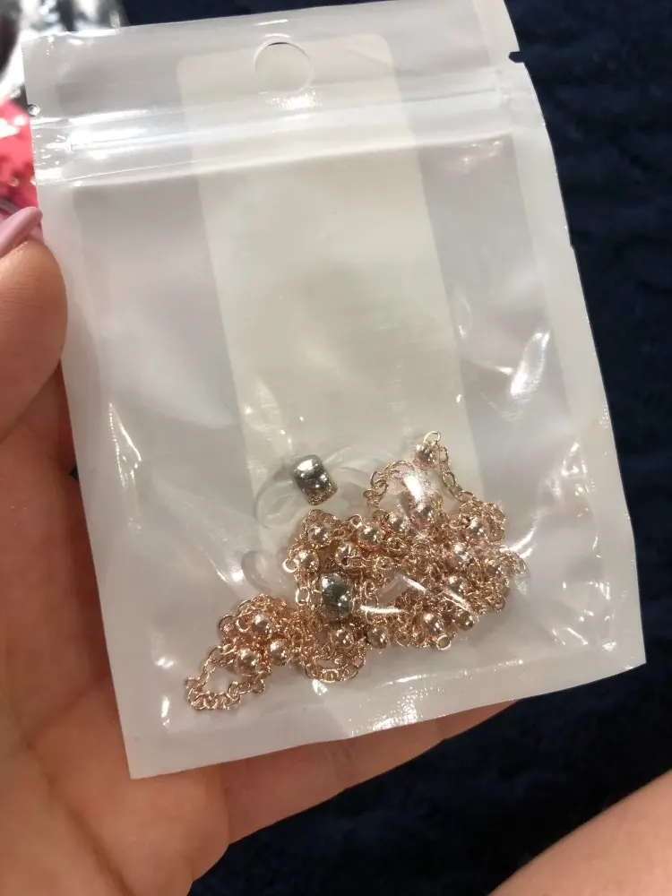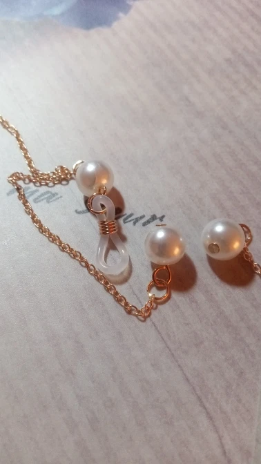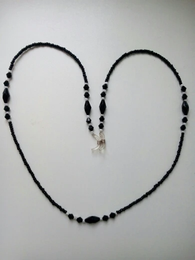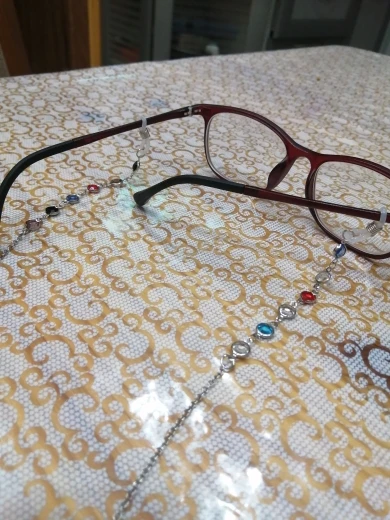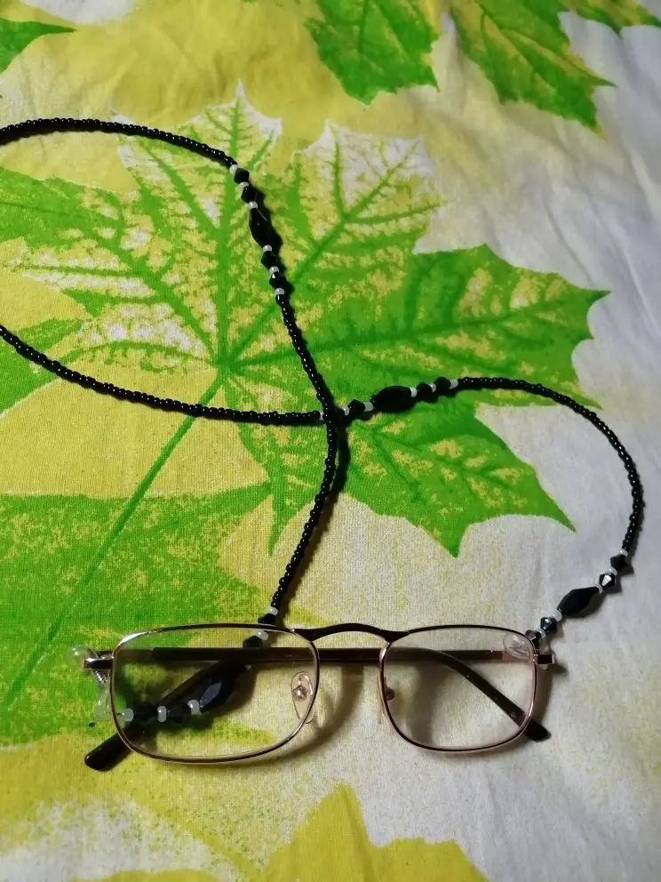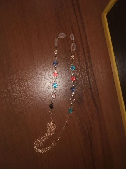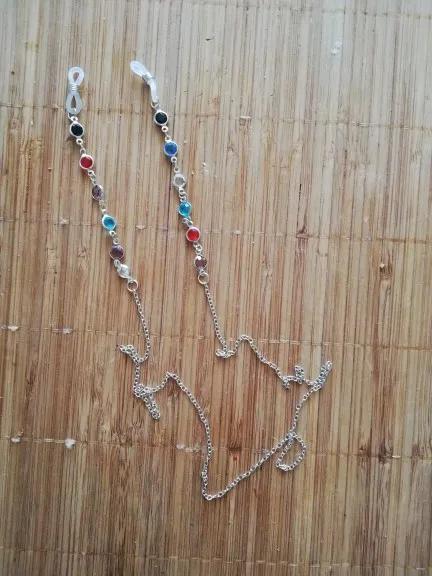 Цепь сделана из бусин с маленькими бусинами, для довольно жесткой ножвы, длина как на предложение. Силиконовый держатель для очков, металлические оправы на обоих концах цепи. Выглядит хорошо. Время доставки-приемлемо. Рекомендуется.