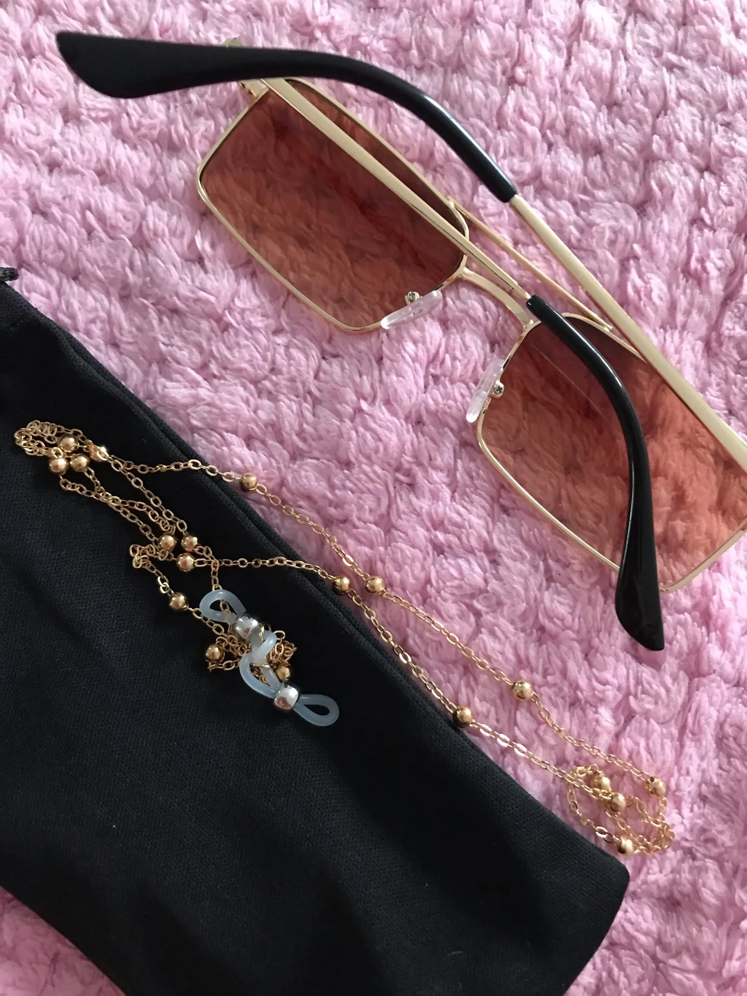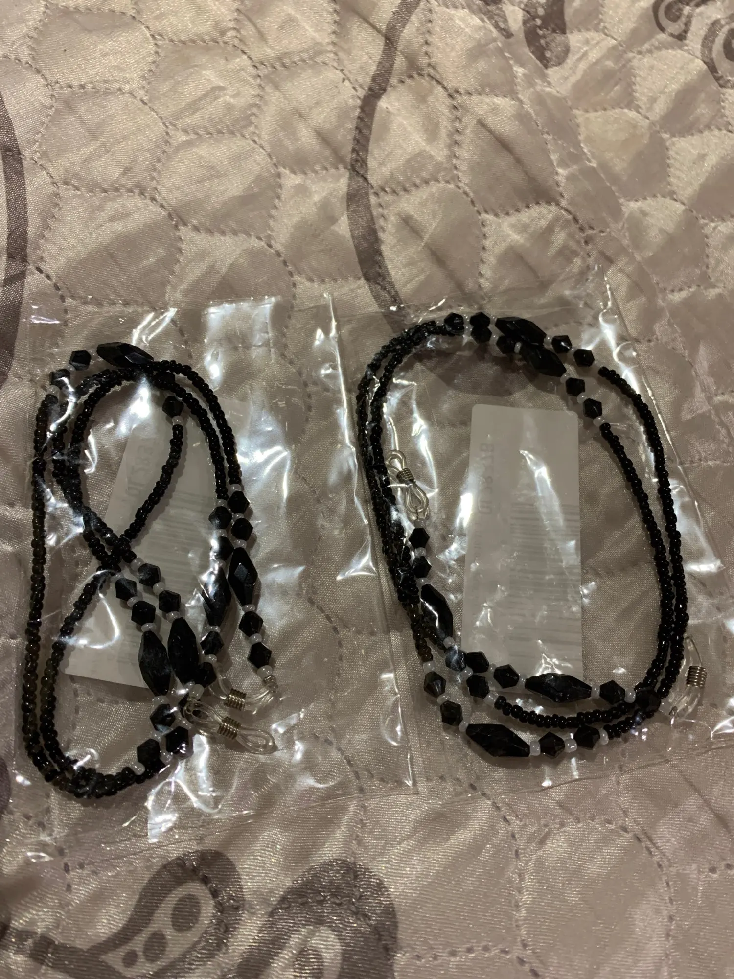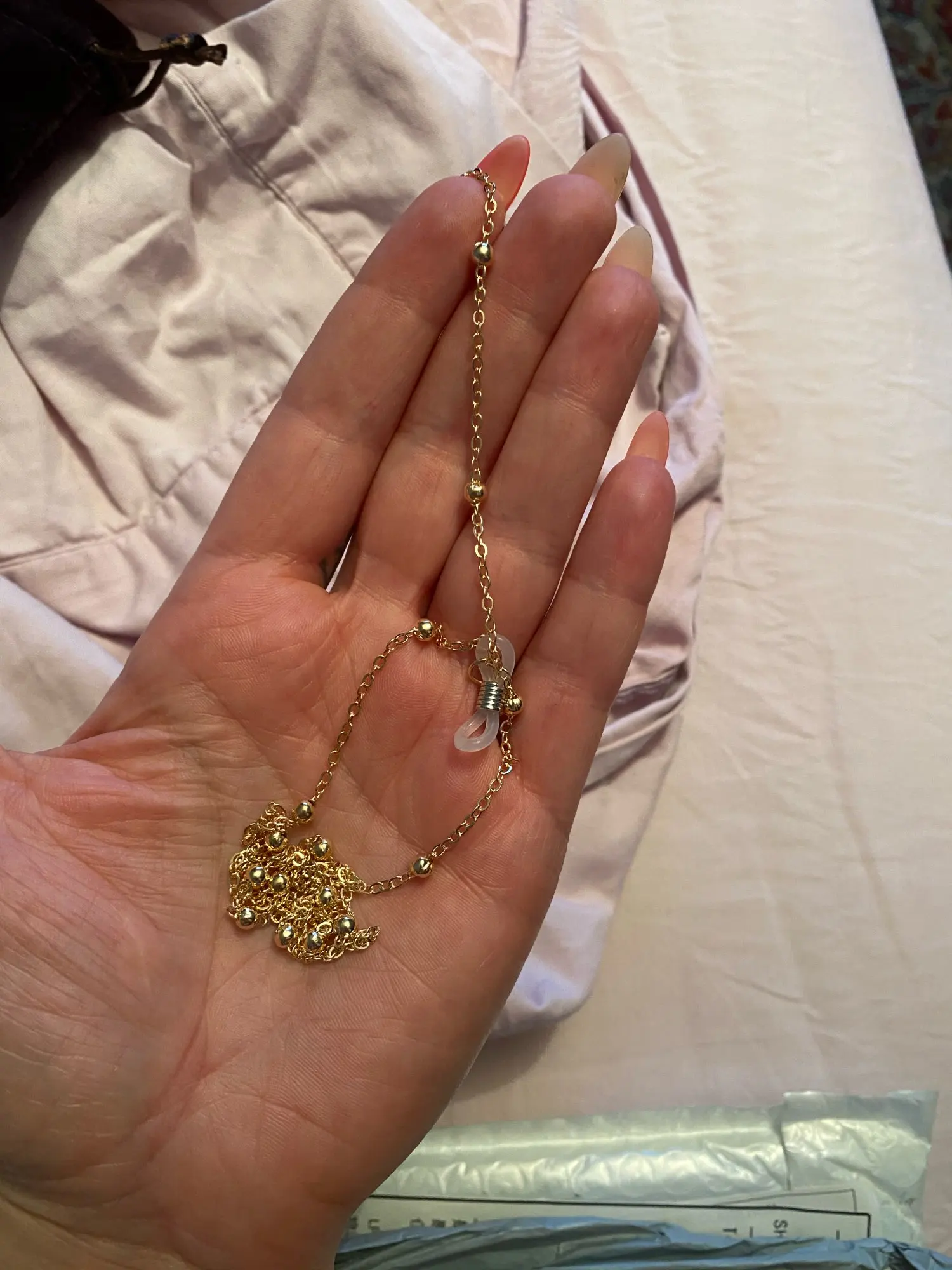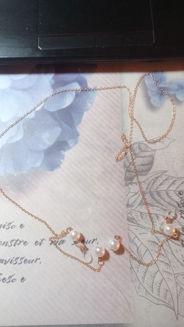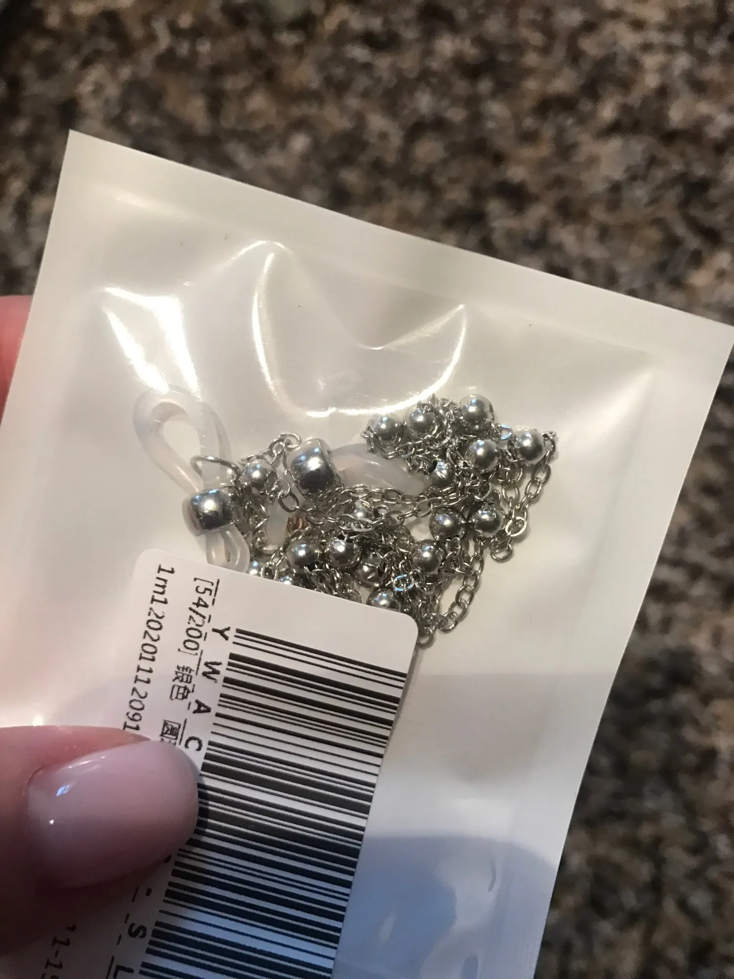 Цепь сделана из бусин с маленькими бусинами, для довольно жесткой ножвы, длина как на предложение. Силиконовый держатель для очков, металлические оправы на обоих концах цепи. Выглядит хорошо. Время доставки-приемлемо. Рекомендуется.