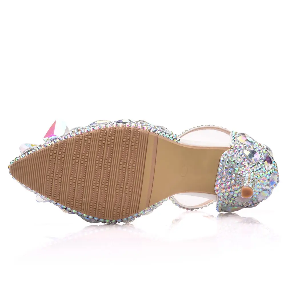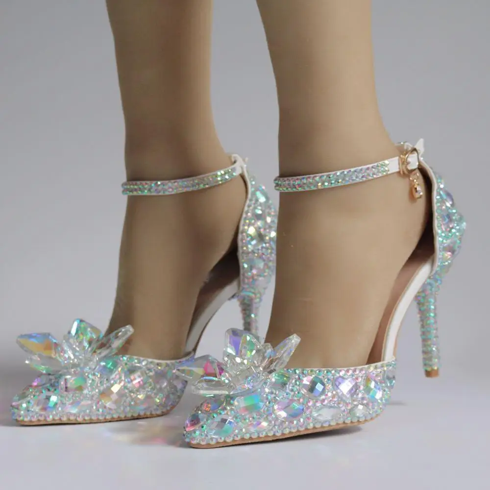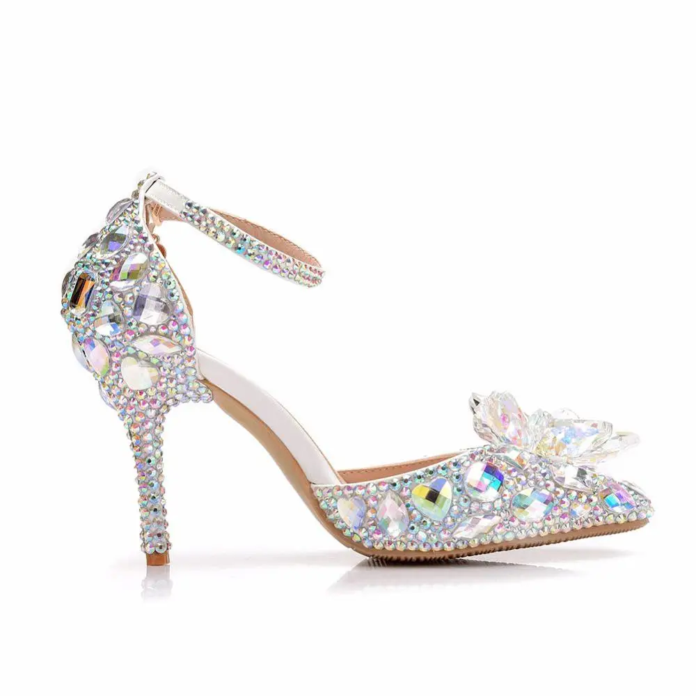 Женские свадебные туфли в европейском стиле со стразами; Белые босоножки-стразы с острым носком; Туфли-лодочки для невесты на высоком каблуке