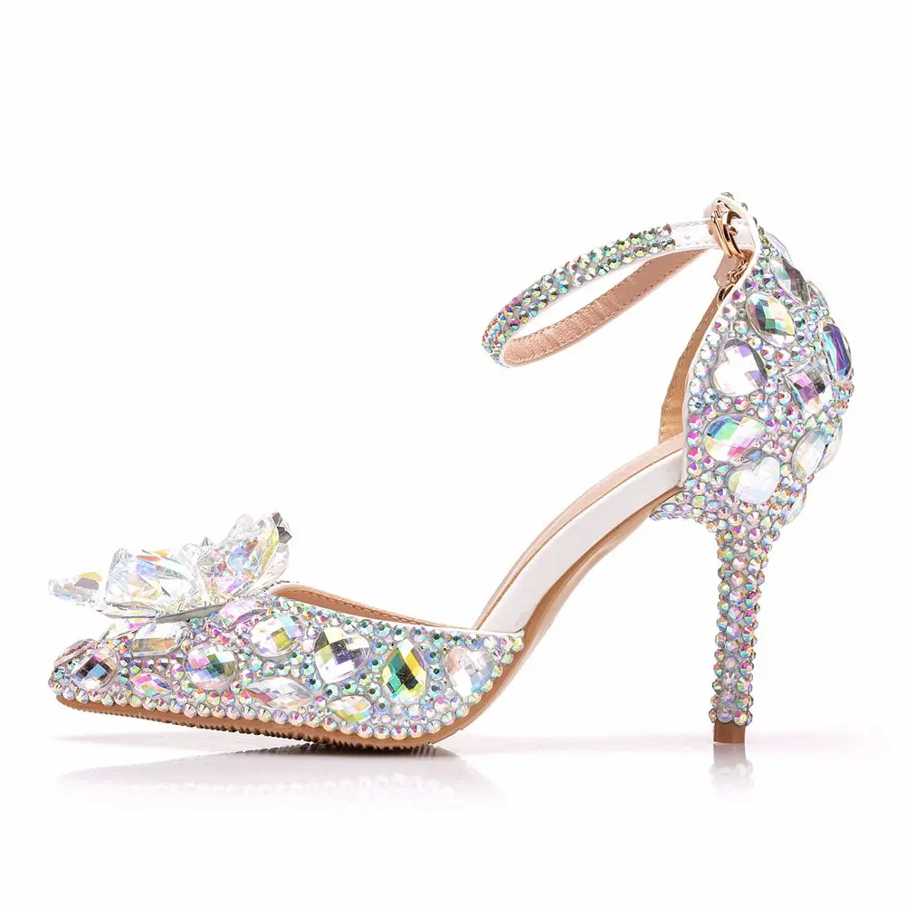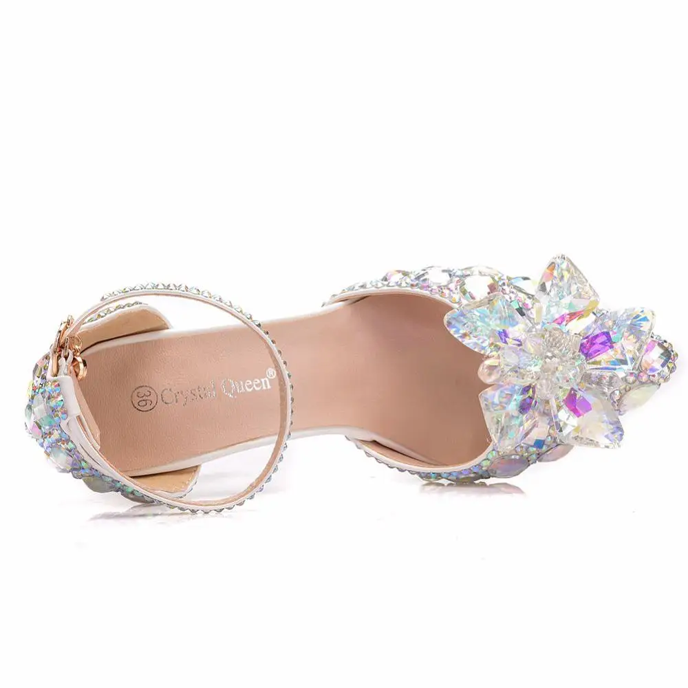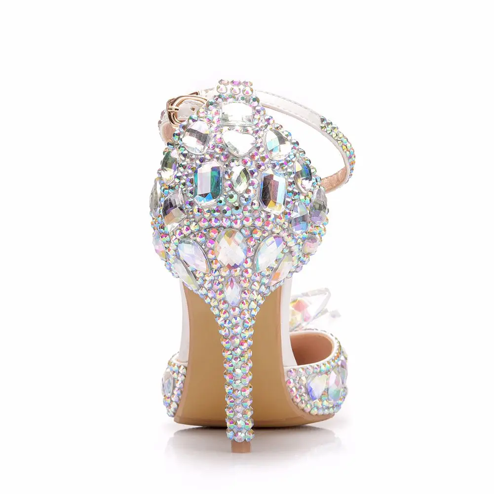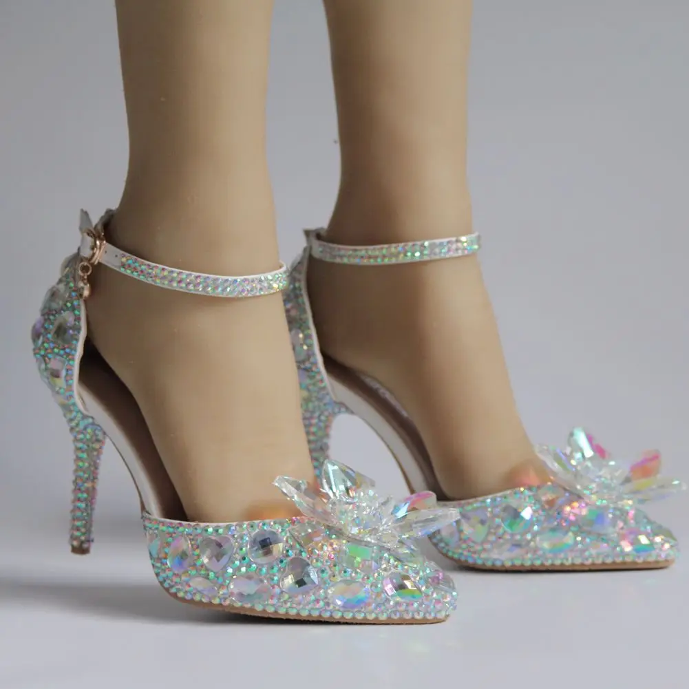 Женские свадебные туфли в европейском стиле со стразами; Белые босоножки-стразы с острым носком; Туфли-лодочки для невесты на высоком каблуке