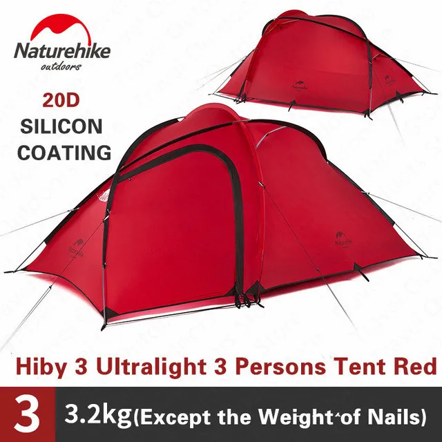 Вес палатки Hiby 3: силикон с нейлоновым покрытием 20D, 3,2 кг (включая упаковку)/полиэфирная ткань 210T, 2,88 кг (без гвоздей)