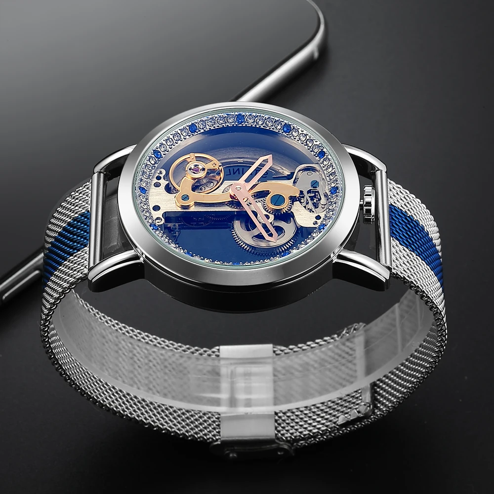 Часы-скелетоны SH Мужские механические Автоматические с турбийоном, роскошные прозрачные со стразами, стальные сетчатые с автоподзаводом