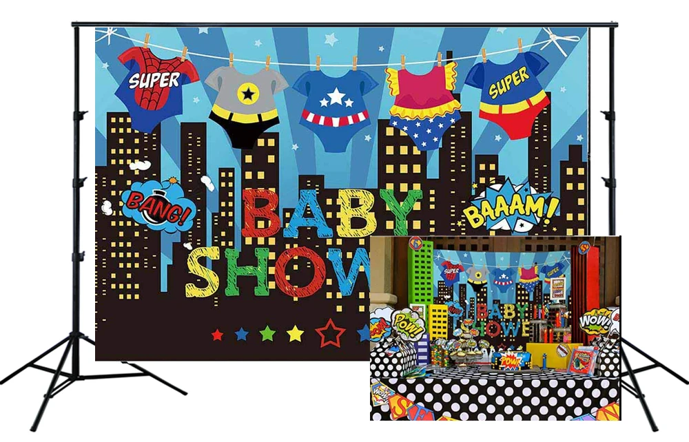 Супергерои тема детский душ фон город взрыв бум Вечеринка баннеры фото фон торт стол сцены установить стены украшения