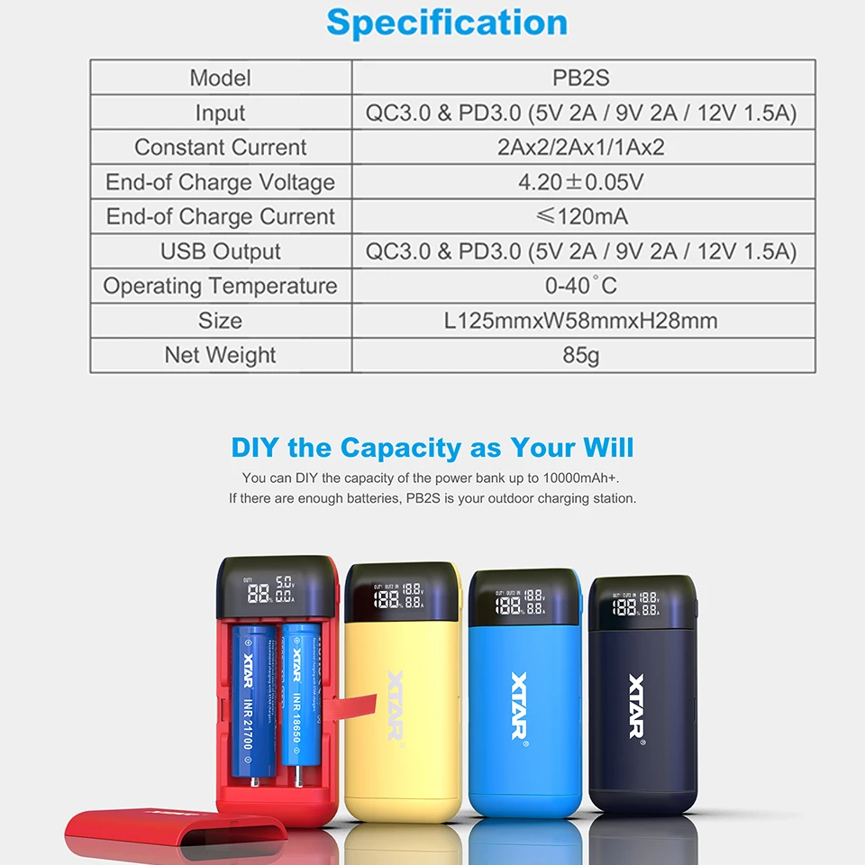 XTAR, портативное быстрое зарядное устройство 18650, внешний аккумулятор Type C, вход QC3.0, зарядка 18700, 20700, 21700, аккумулятор PB2S 18650, зарядное устройство