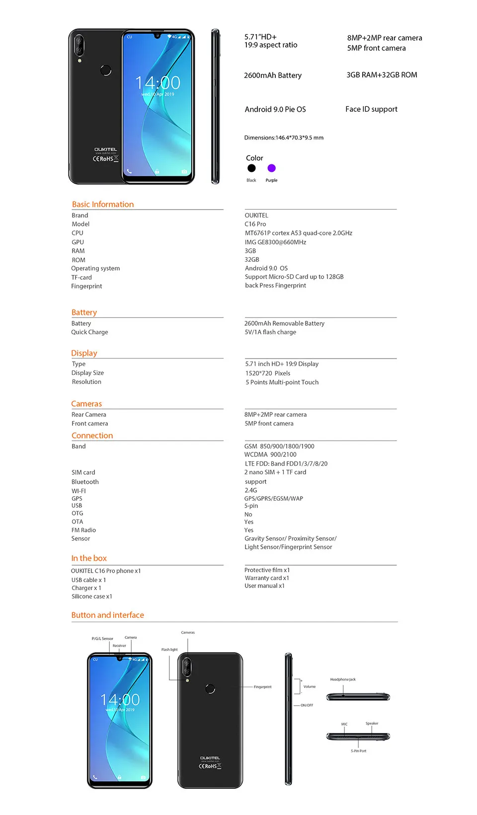 Бренд OUKITEL модель C16 Pro дата выпуска 2019/6/7 дизайн разблокировка телефонов да Операционная система Android 9,0 процессор MT6761P Количество ядер четырехъядерный частота до 2,0 ГГц SIM две sim-карты двойной режим ожидания связь сотовая связь GSM/WCDMA/LTE частота сети 2 g: GSM 850/900/1800/1900 МГц 3g: WCDMA 900/2100 MHz 4G: FDD LTE диапазон 1/3/7/8/20 Экран Дисплей 5,71" Разрешение 720*1520 HD + Тип Емкостный сенсорный экран объем памяти ОЗУ 3 Гб ПЗУ 32 Гб Расширение карты Micro SD максимальное расширение 128 ГБ функция камеры фронтальная камера 5,0 Мп задняя камера 8,0 МП + 2,0 МП передача WLAN поддержка, 802.11b/g/n Поддержка точки доступа WLAN Поддержка bluetooth Поддержка gps Поддержка отпечатков пальцев другие Емкость батареи (махр) 2600 мАч Тип батареи съемный USB слот Micro USB посылка содержимое смартфона (включая батарею) X1; Зарядное устройство x1; USB кабель x1; Руководство пользователя x1; Извлечение Pin x1; силиконовый чехол x1