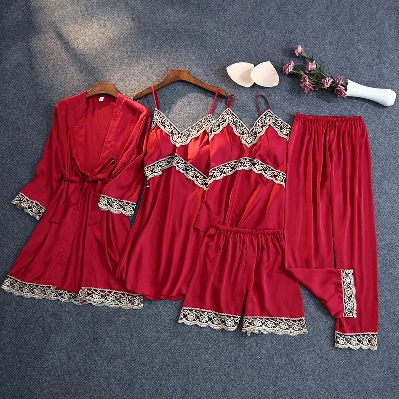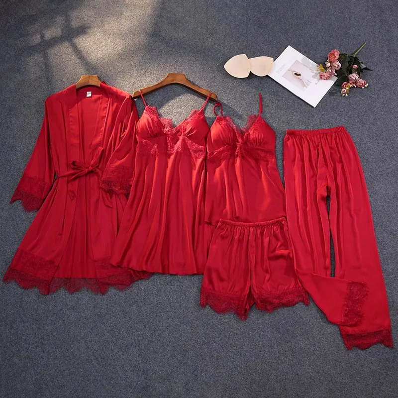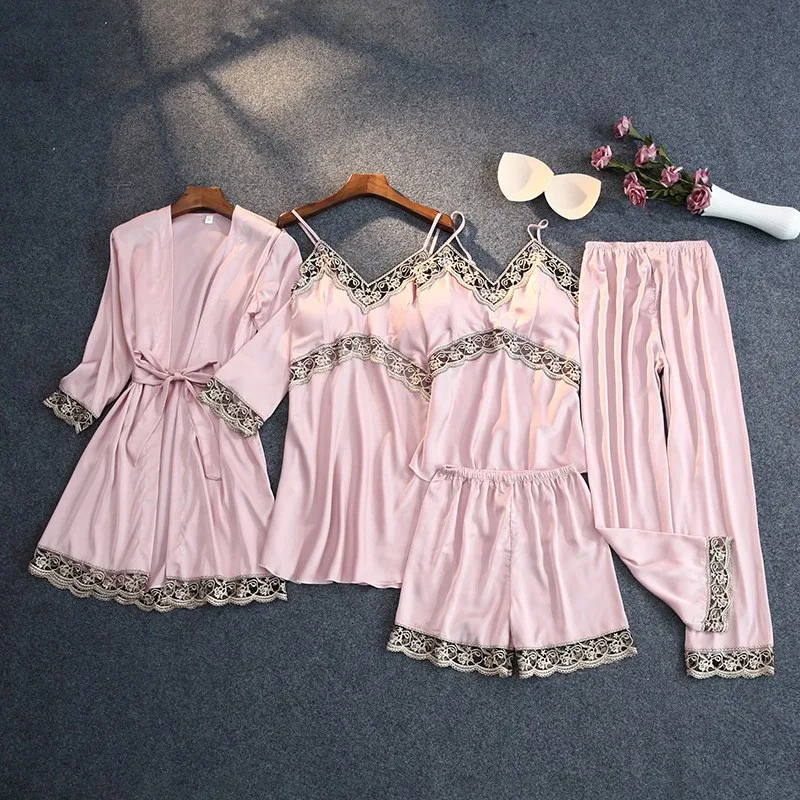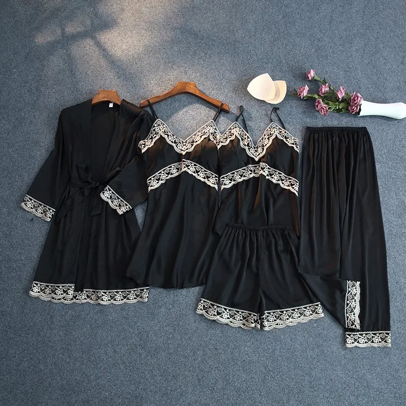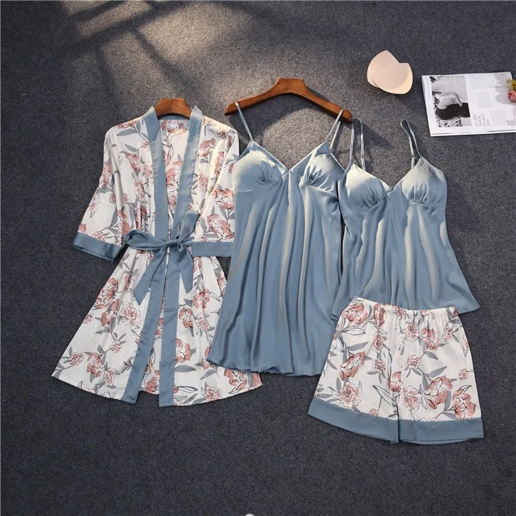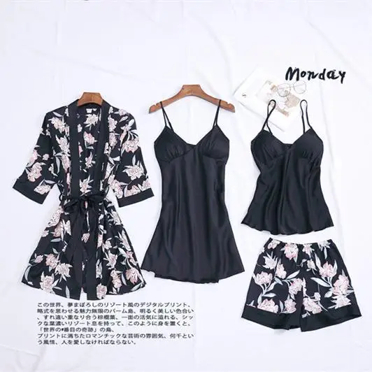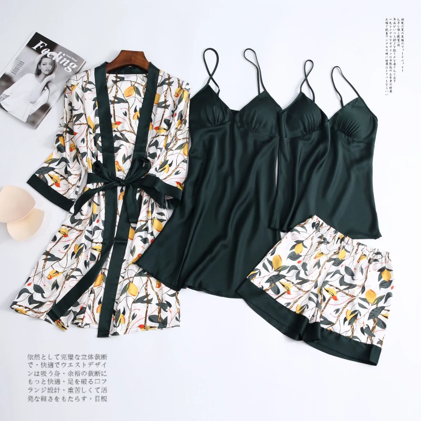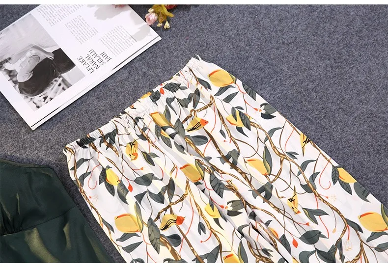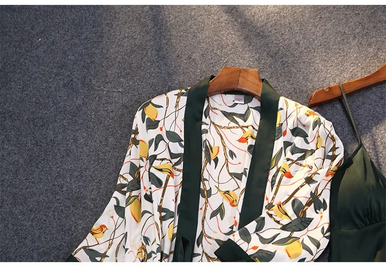 Зеленая пижама, одежда для сна, пижамы для атласные женские кимоно Банный халат для малышей с цветочным рисунком; Платье одежда для сна сексуальное интимное белье на бретельках со штанами костюмы с открытыми плечами