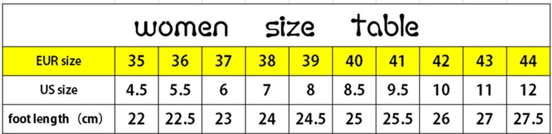 Примечание: Если у вас широкая или Толстая стопа, мы рекомендуем вам выбрать обувь на один размер больше! Пожалуйста, выбирайте американский размер в соответствии с длиной Вашей стопы. Американский размер только для справки. Мы отправляем европейский размер.