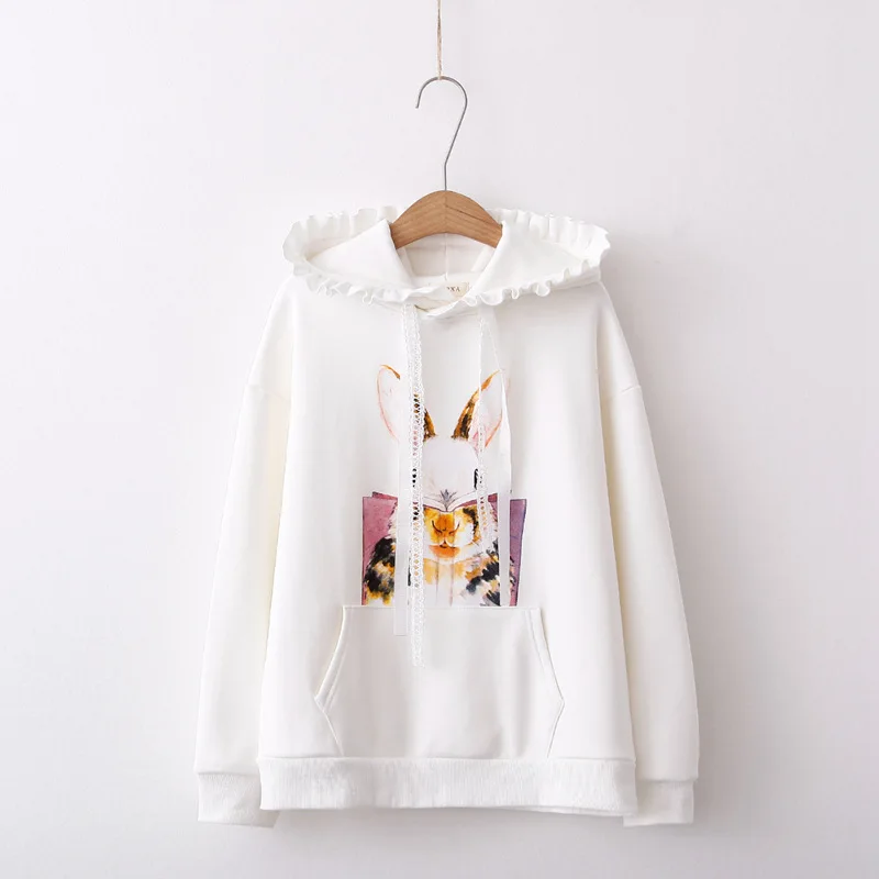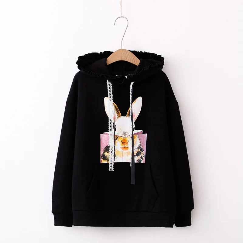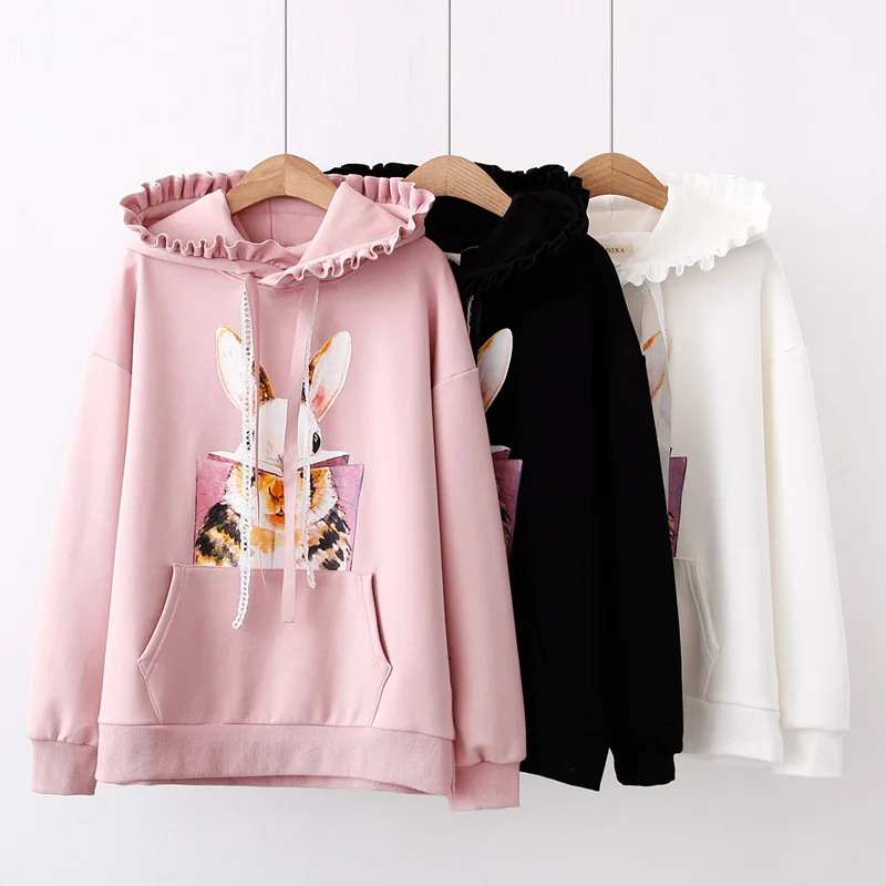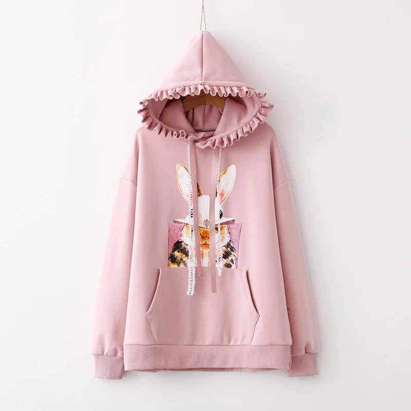 Корейские хлопковые флисовые толстовки Kawaii для женщин, девочек-подростков, в стиле Харадзюку, с принтом розового кролика, пуловер с длинными рукавами и лентой