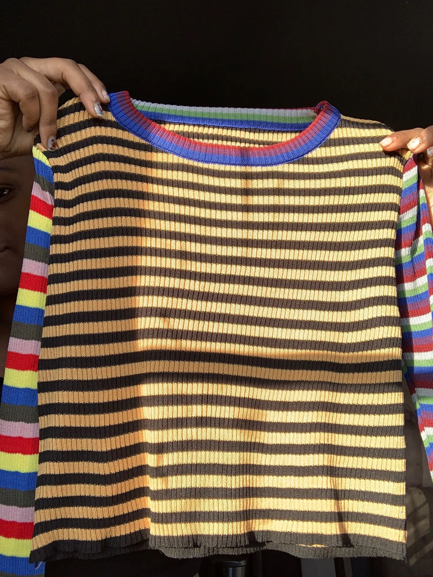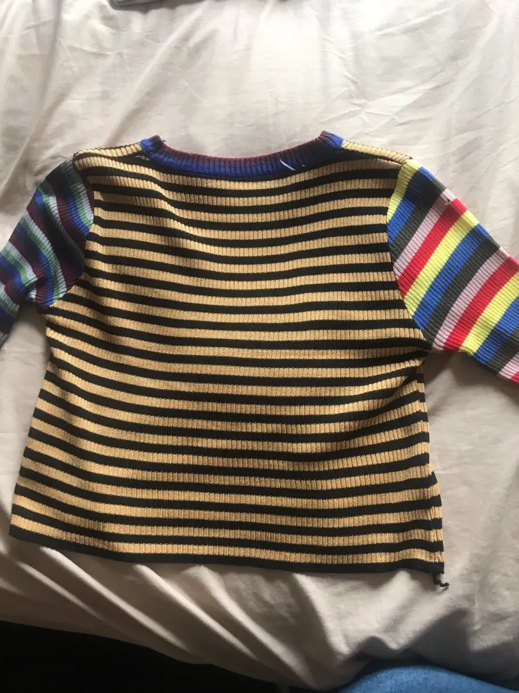 Я ожидала связанную из обычных нитей кофту, но честно, материал, который похож на тот, из чего делают шторы, даже лучше, в тёплую погоду самое оно. Но из-за её ну очень маленького размера ношу только под футболки или подобное, а то совсем стыдоба ахахахха
