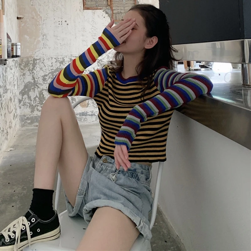 Полосатая трикотажная футболка, осенняя Женская, повседневная, приталенная, короткая футболка, женские топы, футболки с длинным рукавом
