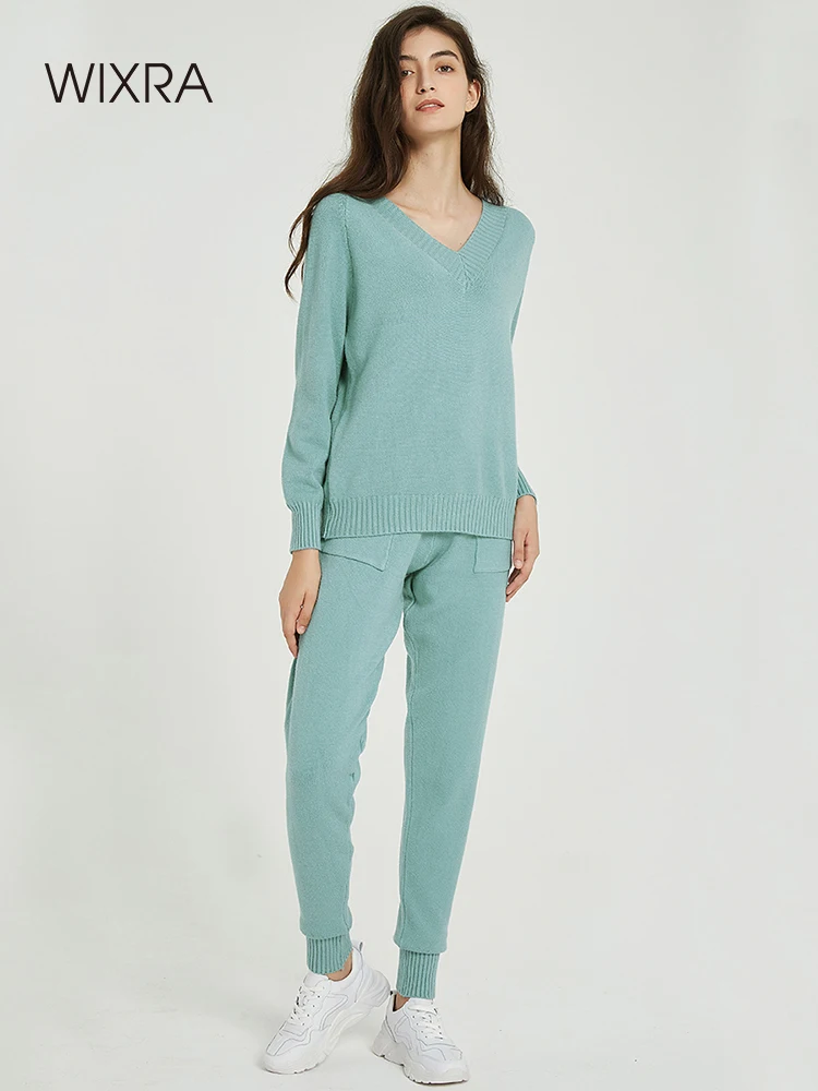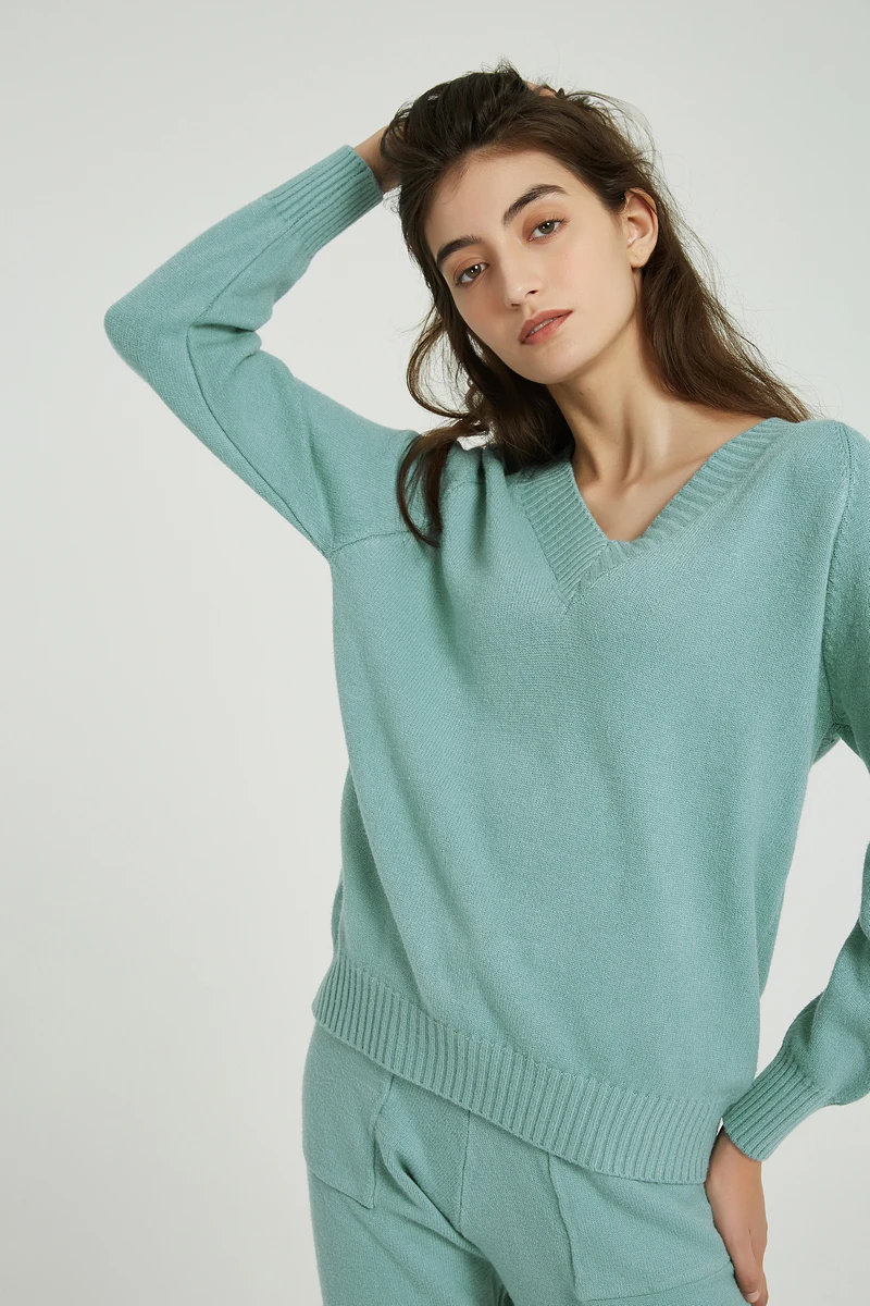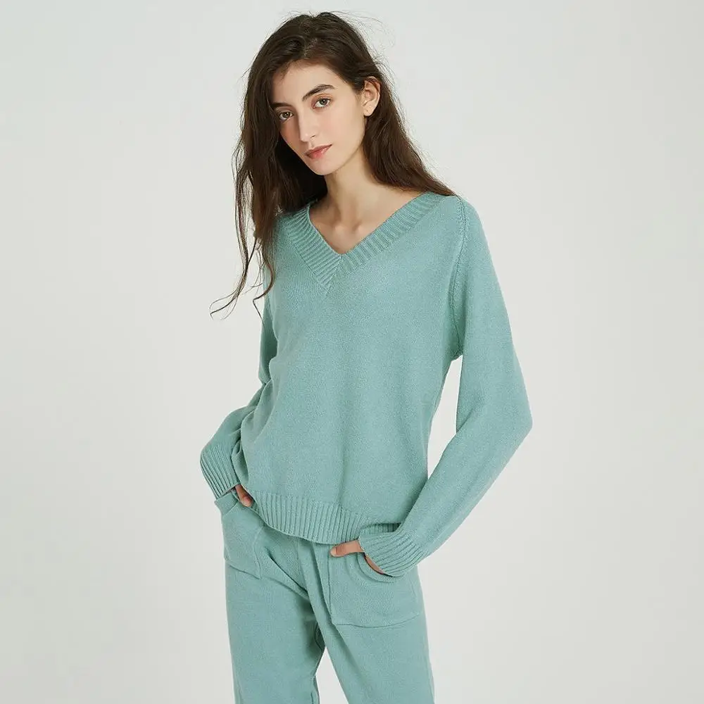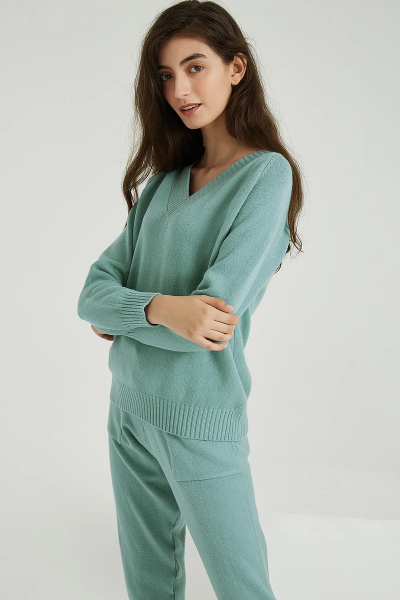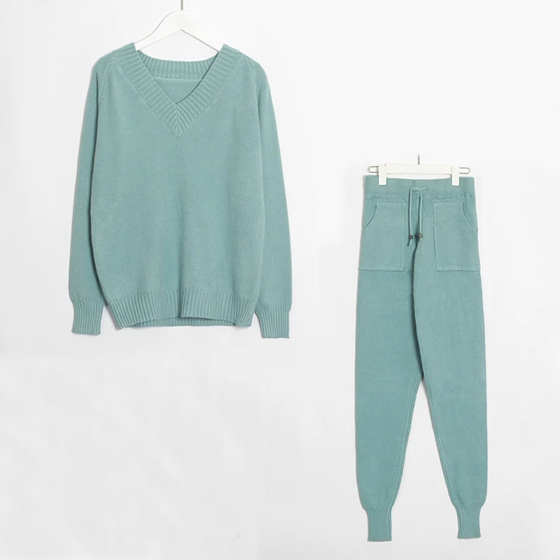 Костюм-двойка женский из свитера с V-образным вырезом и длинных брюк с карманами на осень и зиму