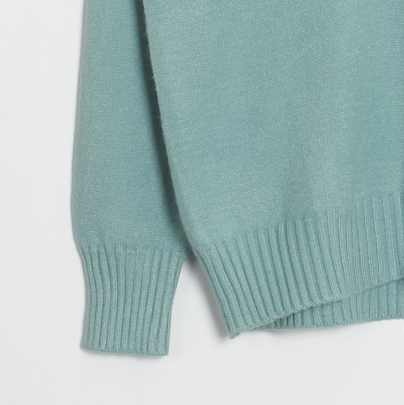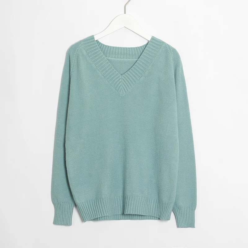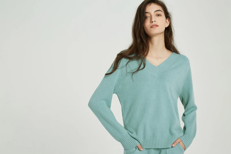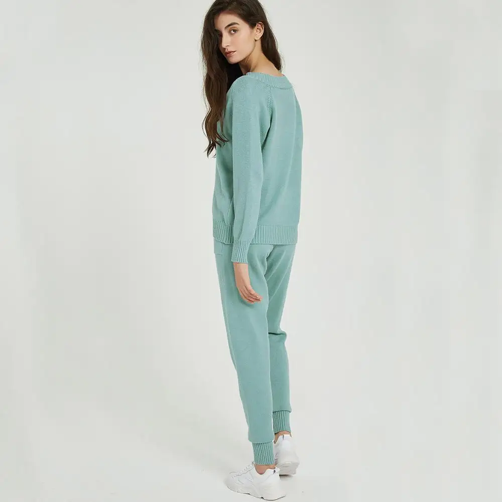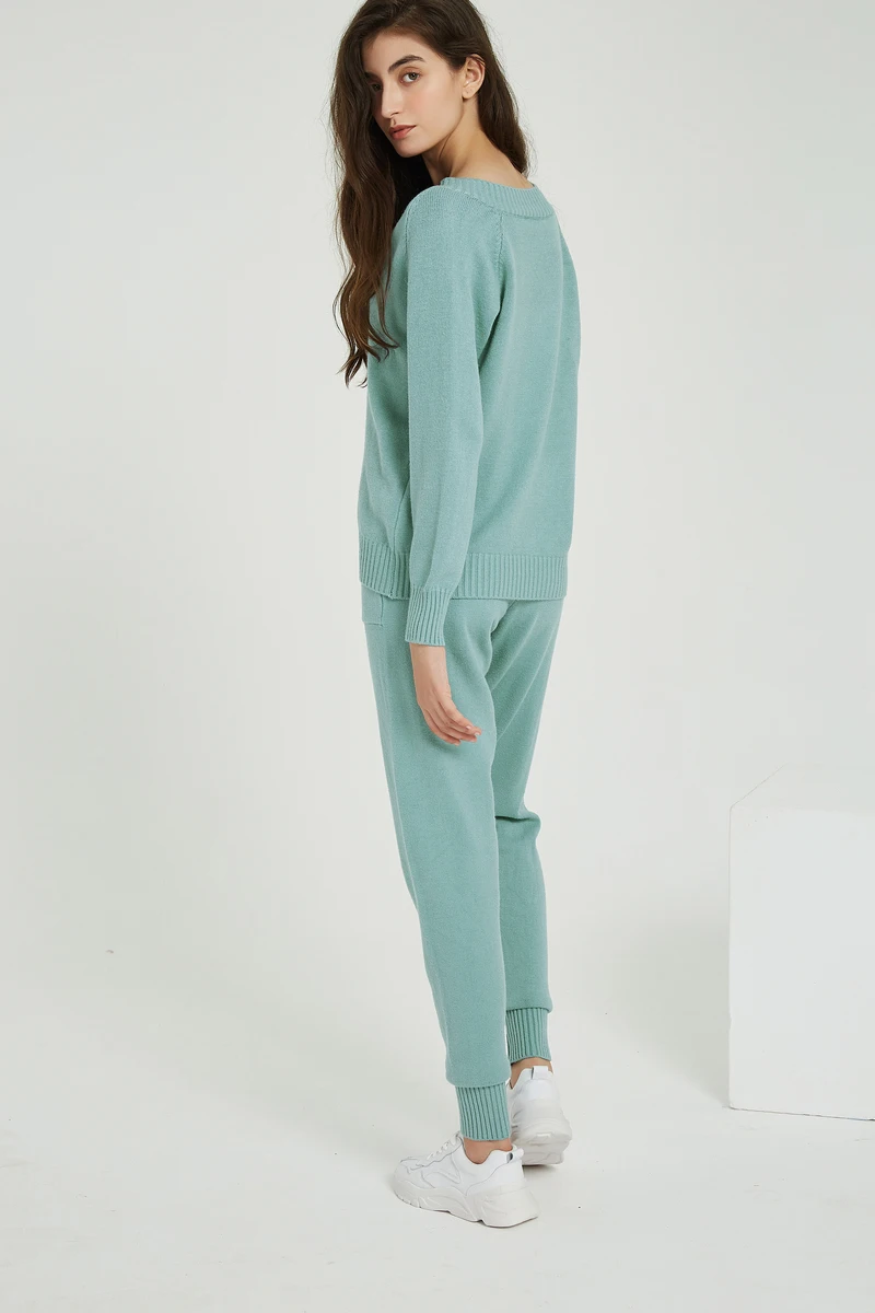 Костюм-двойка женский из свитера с V-образным вырезом и длинных брюк с карманами на осень и зиму