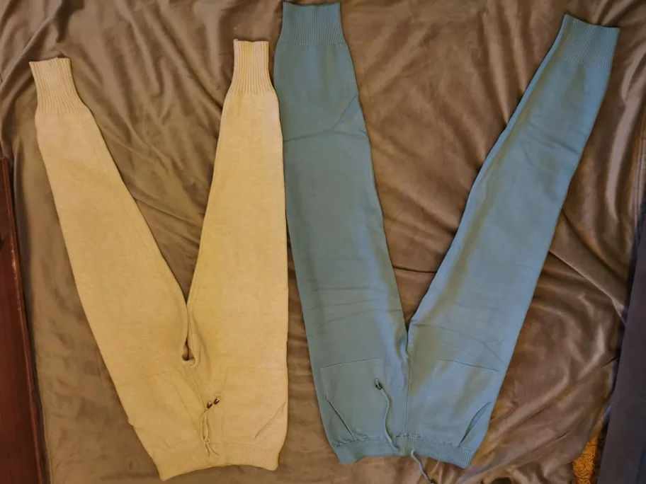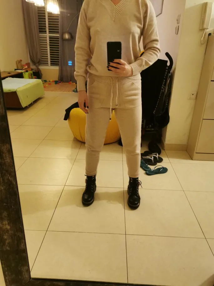 В целом костюм не плохой. Но оставила как домашний. Плотный, тяжёлый трикотаж, слегка колется. Смутили только брюки, точнее это лосины. Мой размер М. Я не представляю насколько худенькие нужно иметь ножки, чтобы брюки были как на модели. В общем на работу в нем не пойду, а дома, за городом или к подруге на чай забежать самое то)