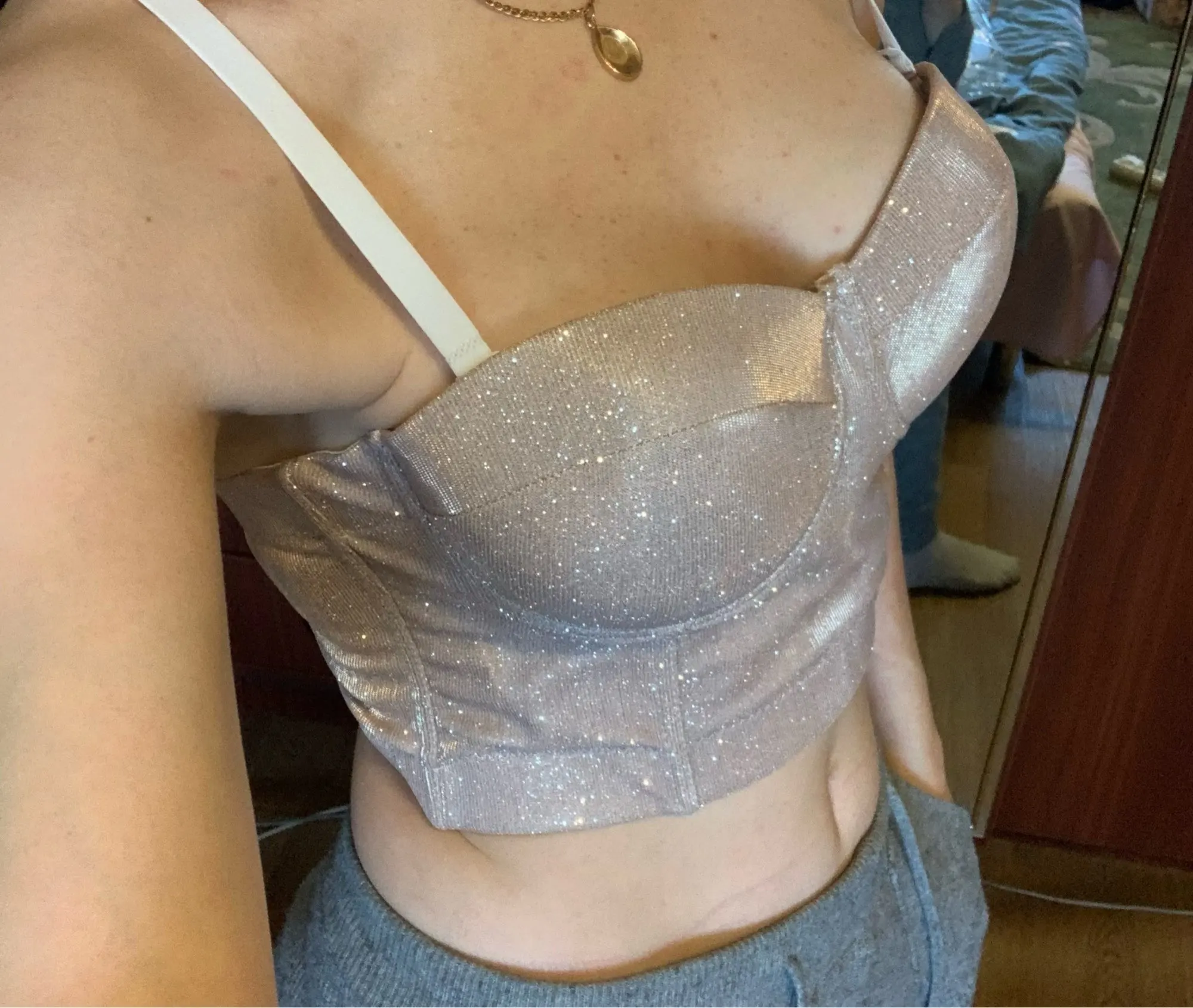 ОЧЕНЬ красивый. Внешняя ткань с люрексом, плюс микро блестки. После стирки вручную топ выглядит так же , размер не изменил. Блестки сыпятся. Но на эффект от топа это не влияет. На ог 96см, третий размер, от 70 см подошло замечательно!