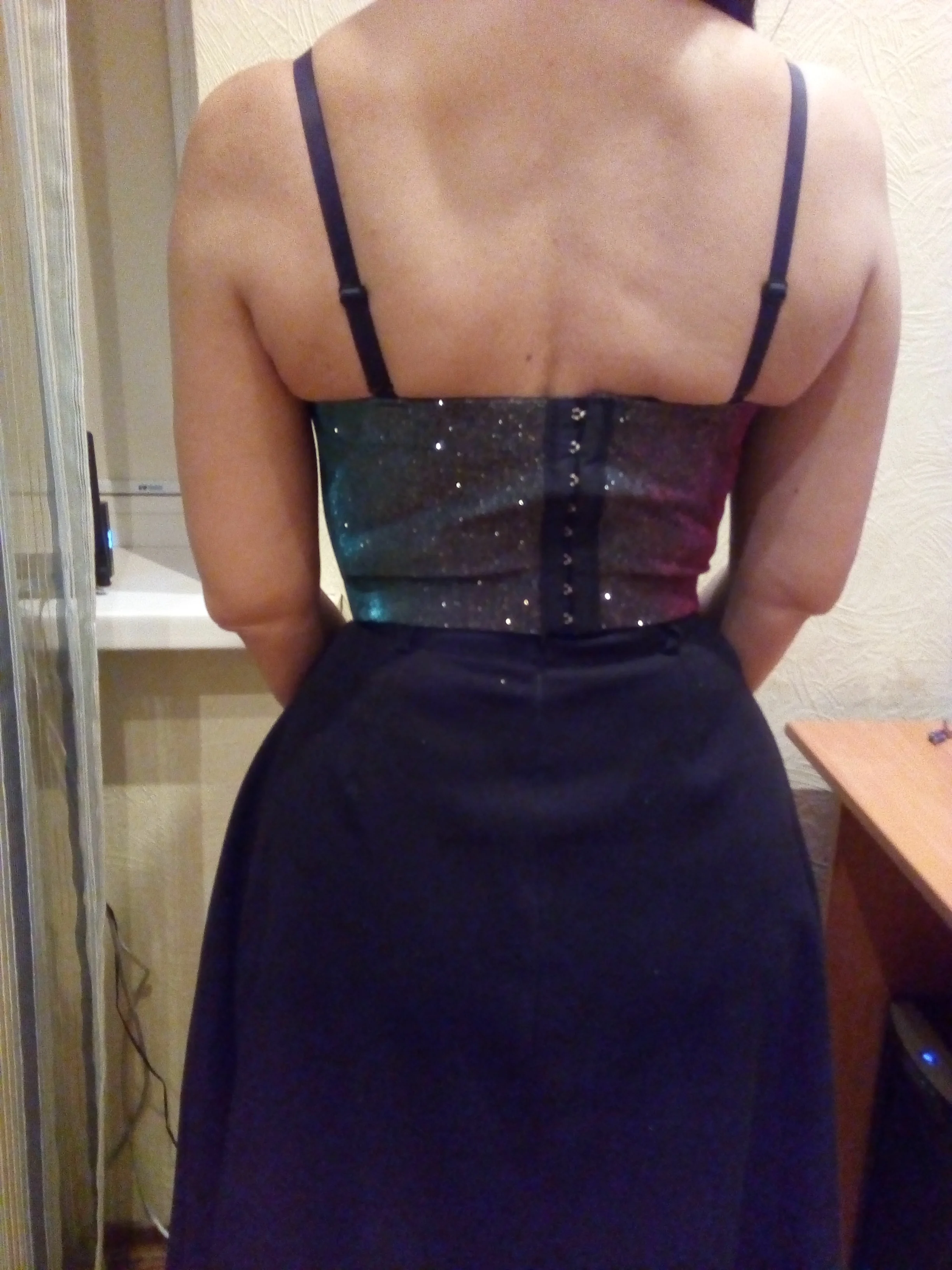 Очень класный топ, хорошо сшит, выглядит аккуратно и красиво. Ношу S (36) размер, смогла застегнуть на самые дальние крючки (всего их 3). Если буду брать ещё, то возму на размер больше. Доставка быстрая- около 3х недель до Латвии.