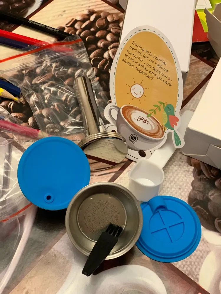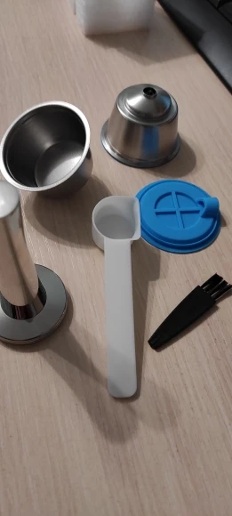 Доставка очень быстрая. Продавца рекомендую,быстро отвечает на вопросы и дополнил капсулу ложкой. К сожалению голубая капсула по качеству не оправдала ожиданий (кофе забивается, нижнее сито оказалось низкого качества, пенка не образуется, увы). Для кофеманов рекомендую зелёную (получается отличный кофе с достойной пенкой) . Голубая капсула дешевле зелёной, но экономия оказалась не оправданной.
