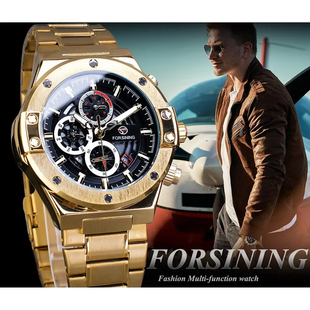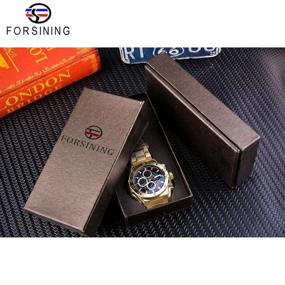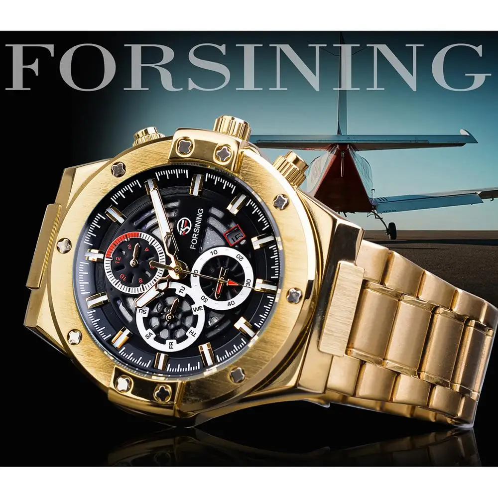 Часы наручные Forsining Мужские механические, автоматические золотистые деловые спортивные в стиле милитари, с календарем из стали