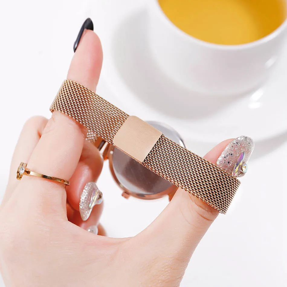 Женские кварцевые часы из розового золота, звездное небо, светящаяся магнитная сетка, ремешок с геометрическим кристаллом, индивидуальность, Relogio Feminino, повседневный подарок
