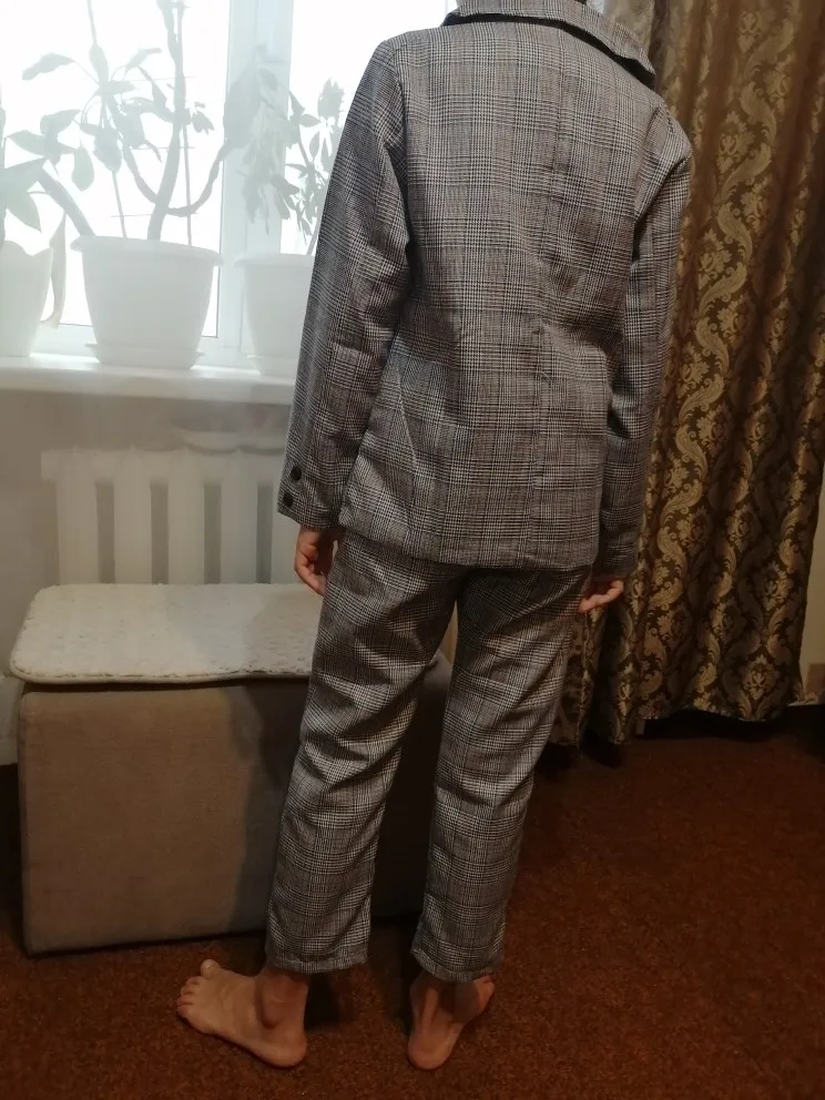 Отличный костюм! Для худенькой девочки 10 лет, рост 145см подошёл размер 13. Есть запас 2-3 см по длине рукавов и штанин. Смотрится очень стильно! Покупала на распродаже за 1017₽. Приятная ткань, мягкая резинка на брючках, подойдёт идеально для школы на весну/осень. Можно сочетать со многими другими вещами по отдельности брюки и пиджак. Все швы ровные, пиджак со светло-серым подкладом. Было несколько лишних ниток. Постирала на 30С, прогладила без проблем. Рекомендую костюм и продавца!