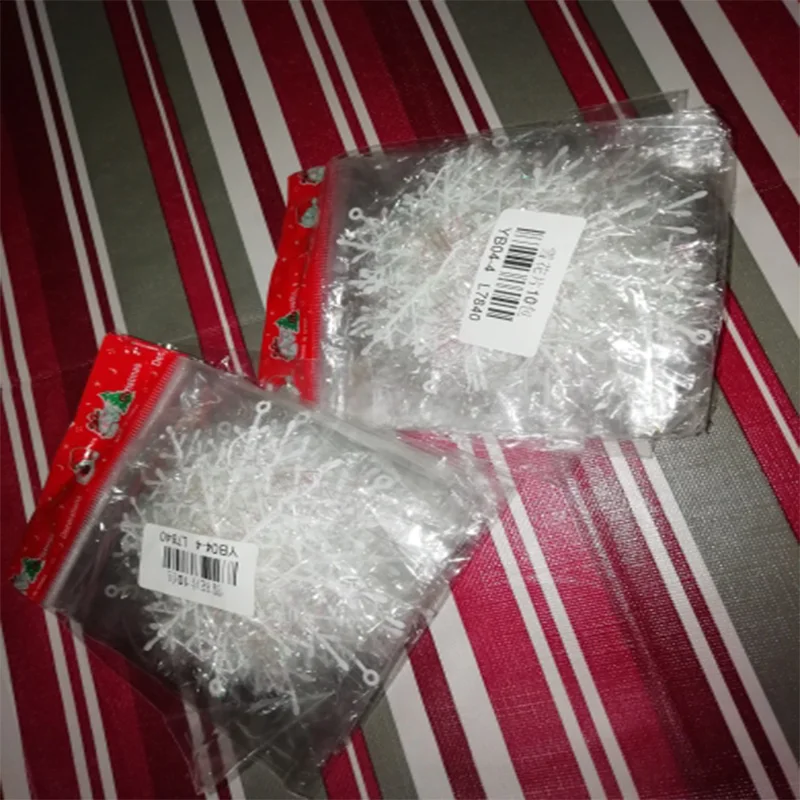 Хорошие снежинки. В одном пакетике лежат три снежинки, то есть если вы покупаете 30 штук, то придет 10 пакетиков по 3 штучки в каждом. Их можно как вешать, продев нитку, так и просто насаживать на ветки (я использую второй метод).
