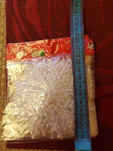 Пришли десять упаковок по три снежинки в каждой. Быстрая доставка- три недели. Симпатичные снежинки, с петелькой для подвеса. Размер можно посмотреть на фото. Хороший товар и продавец, рекомендую этот магазин.
