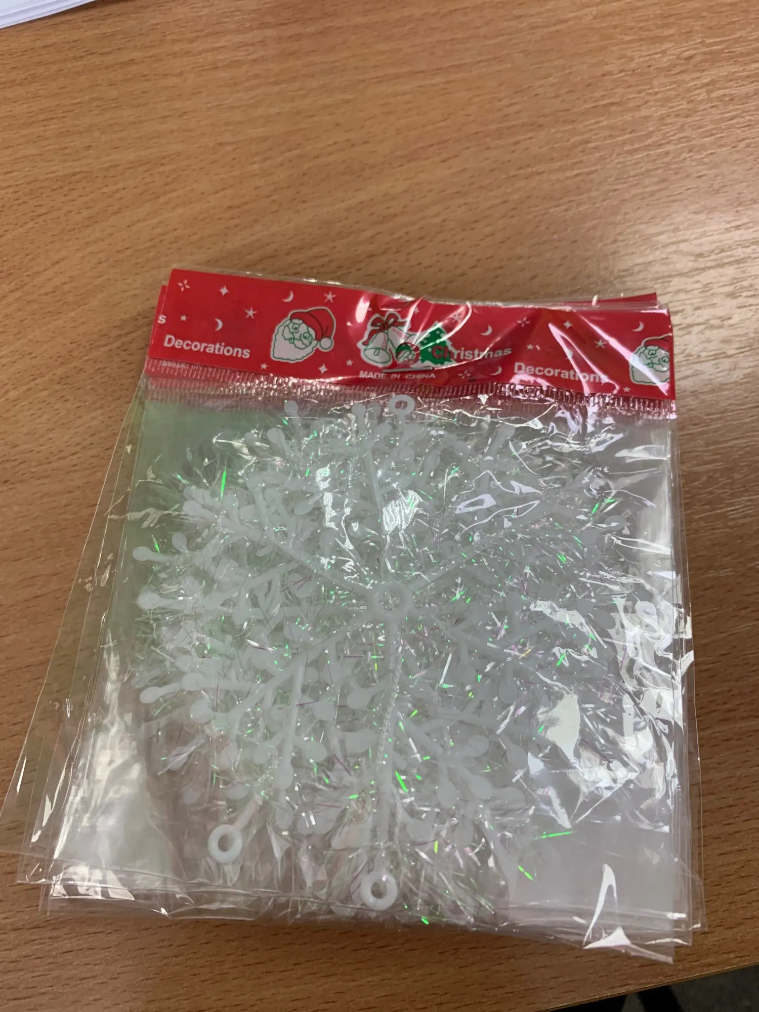 Доставили менее месяца. Очень красивые снежинки, пластик, опутанный переливающейся мишурой. красивые.