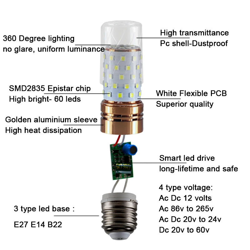 Светодиодная лампа E14, E27, B22, 12 Вт, 110 В, 220 В, 12 В, 24 В, 36 В, 48 В, 60 в