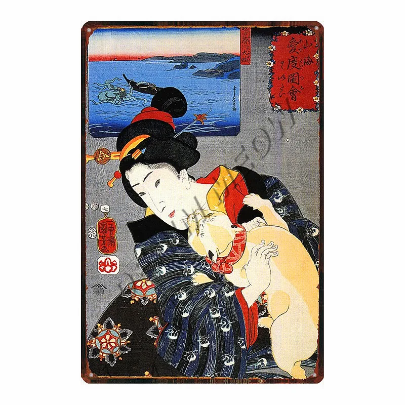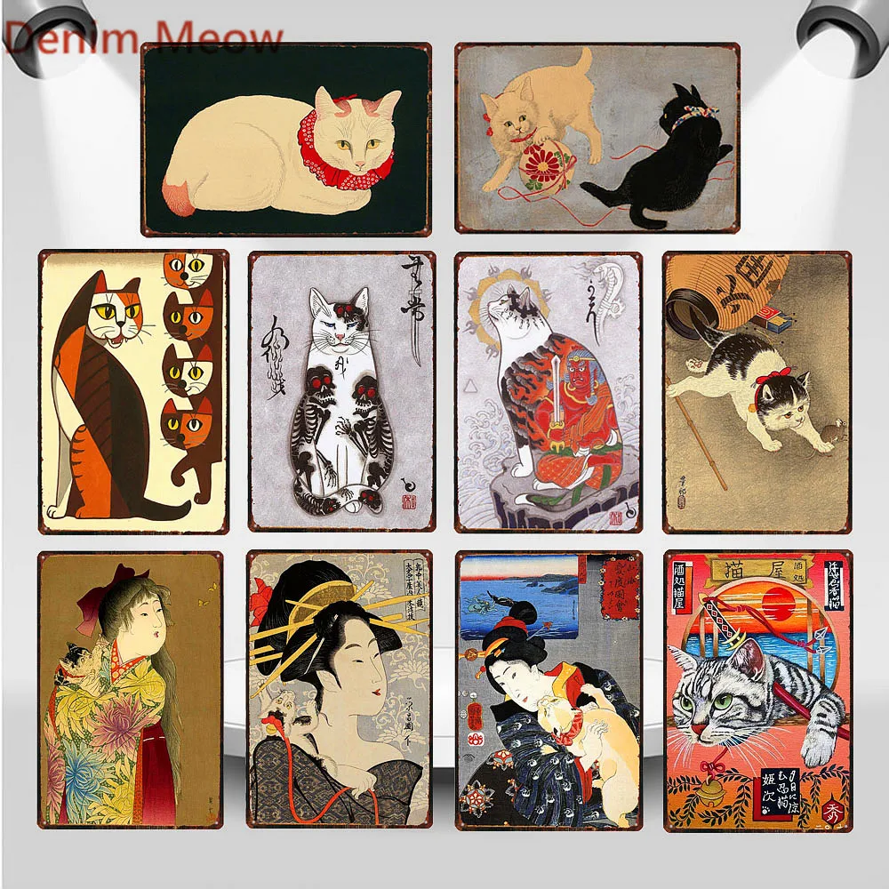 Японский самурайский Кот, металлическая жестяная вывеска, японская леди, Металлический Настенный декор, постер с животными, потертый шик, кошка ниндзя, паб, кафе, домашний декор WY87