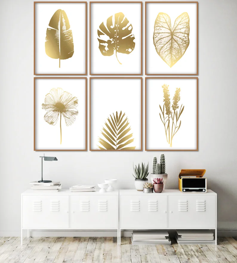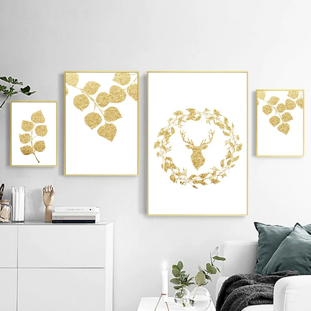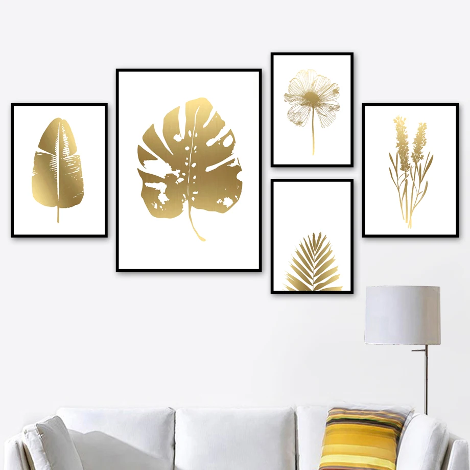 Модульный домашний декор, скандинавский Простой Холст, картина с золотыми листьями, растение, постеры и принты, декоративные картины для спальни, столовой