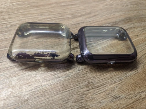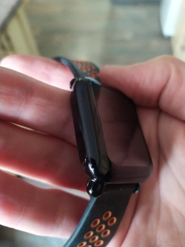 Экран чуточку стал темнее, крапинка заметна, но не критично. Часики приобрели новый вид. В массе и габаритах особо не прибавили. Сенсор отзывчив как и прежде. Влага попадает при обильном мытье рук, как писали в других отзывах, проблем нет, чтобы снять чехол и протереть его.