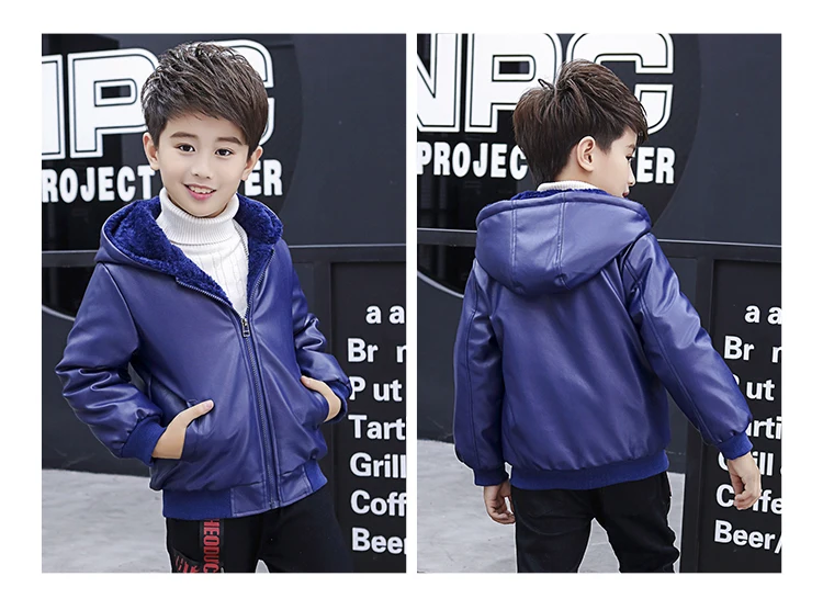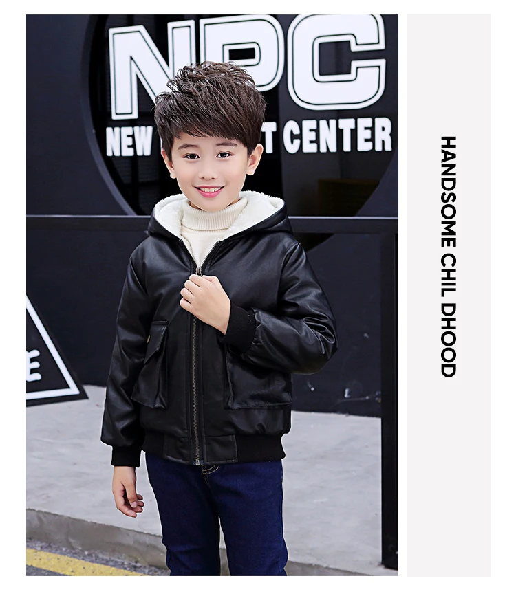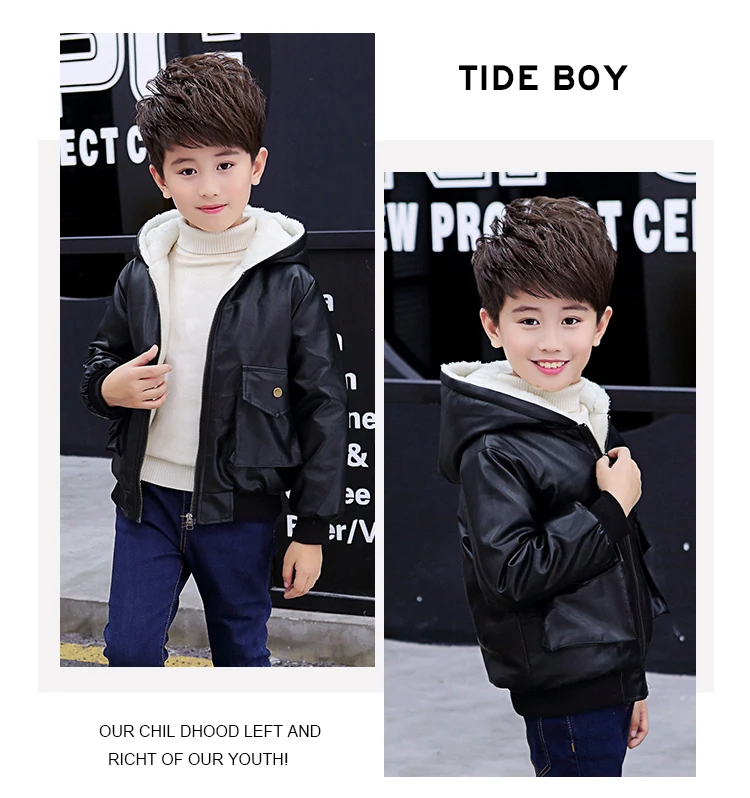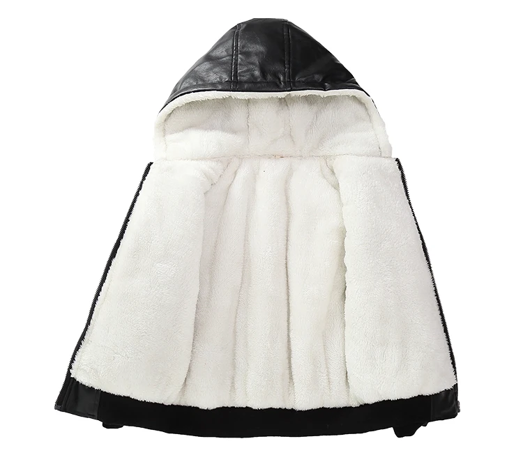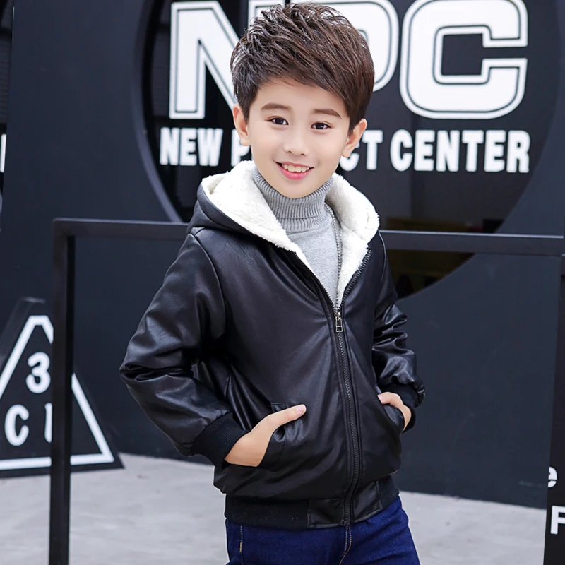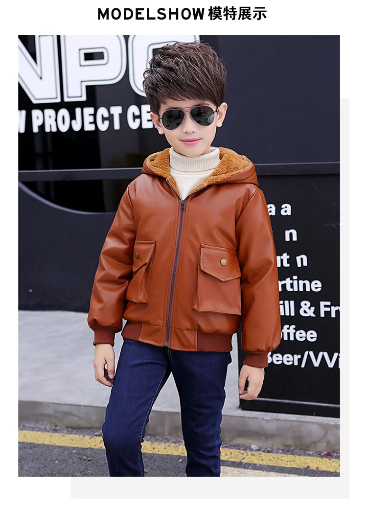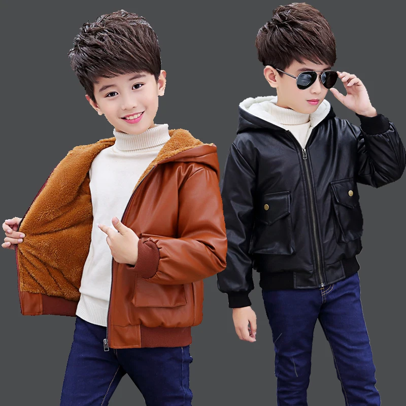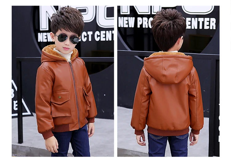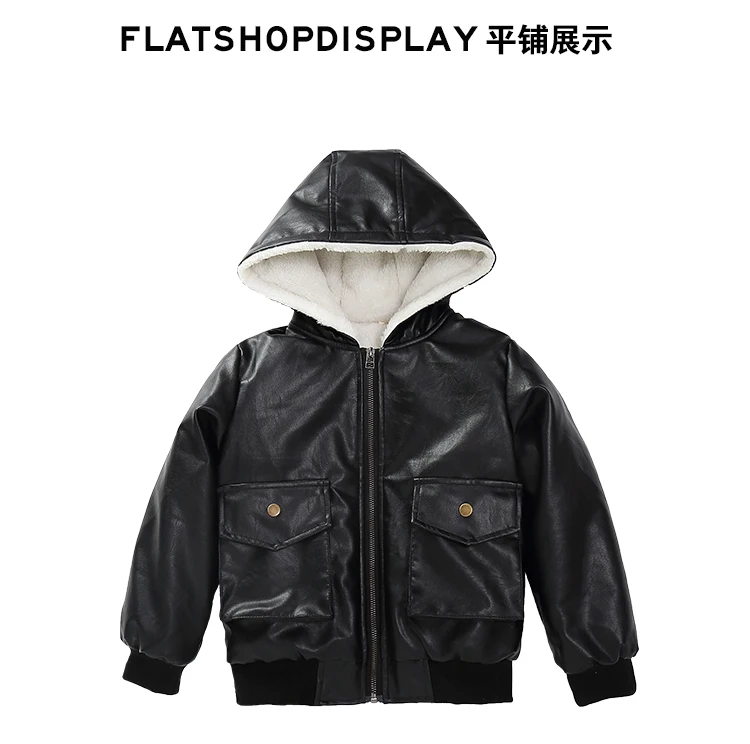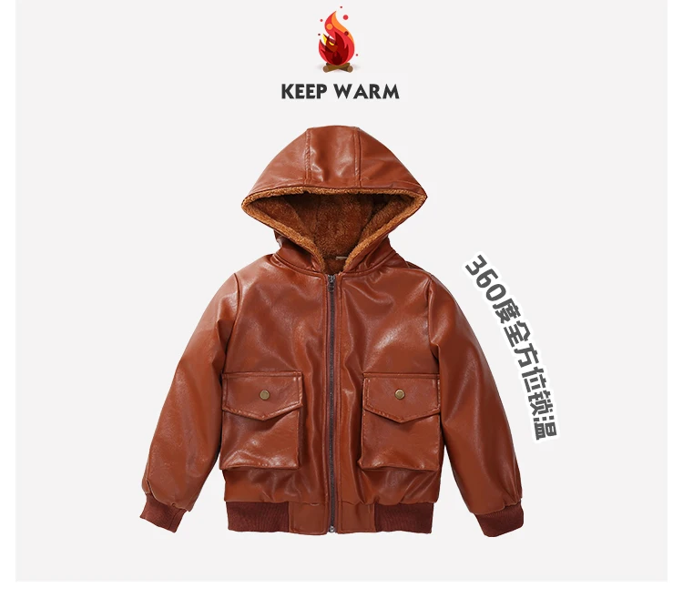 Куртка из искусственной кожи с капюшоном для мальчиков, куртка из искусственной кожи на бархатной подкладке, с большими карманами, 2021