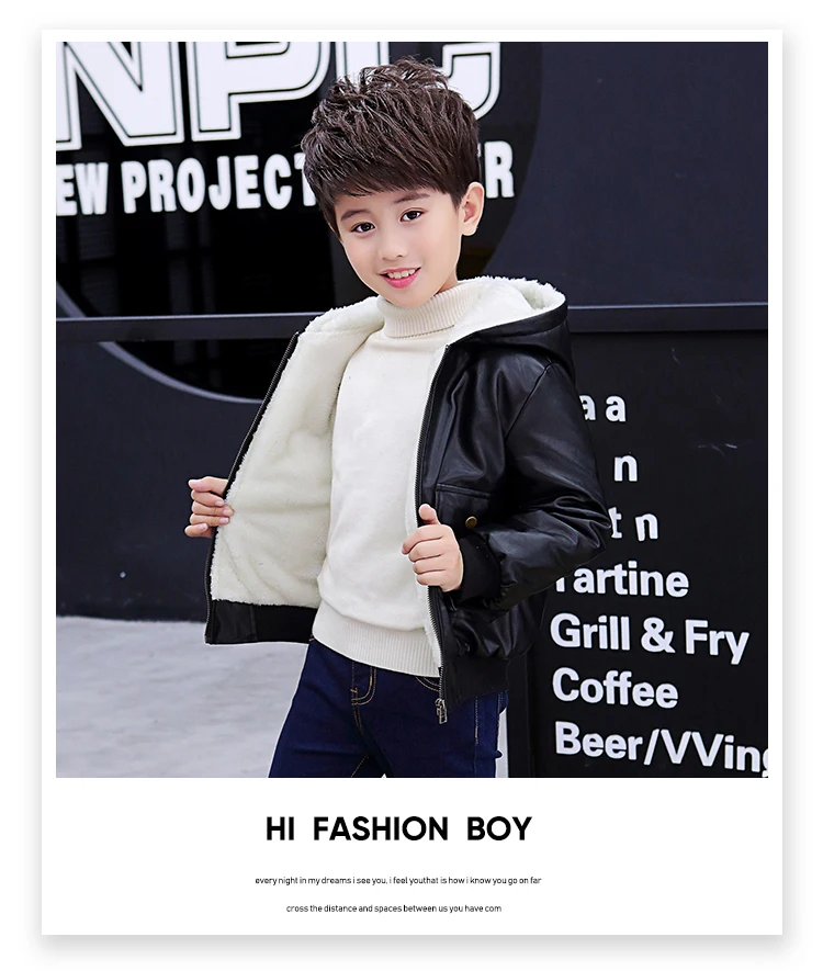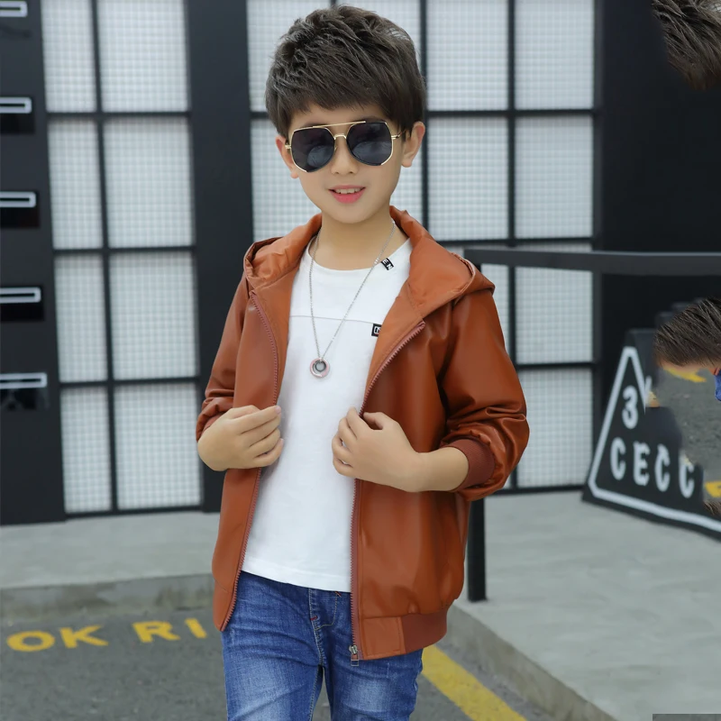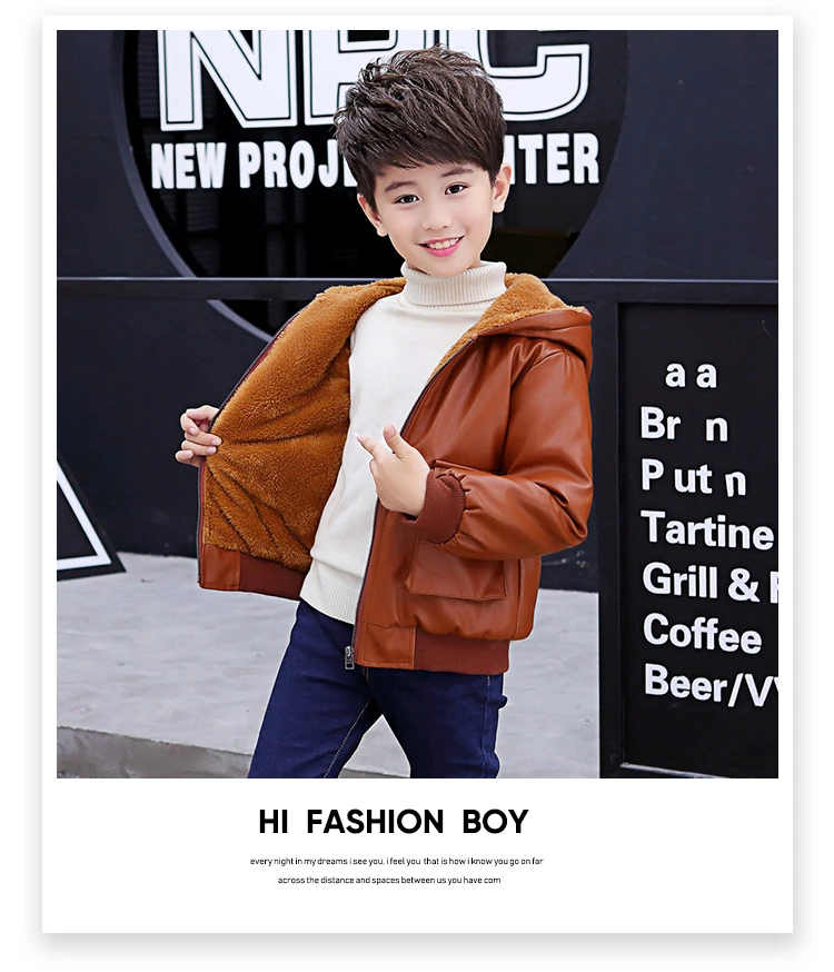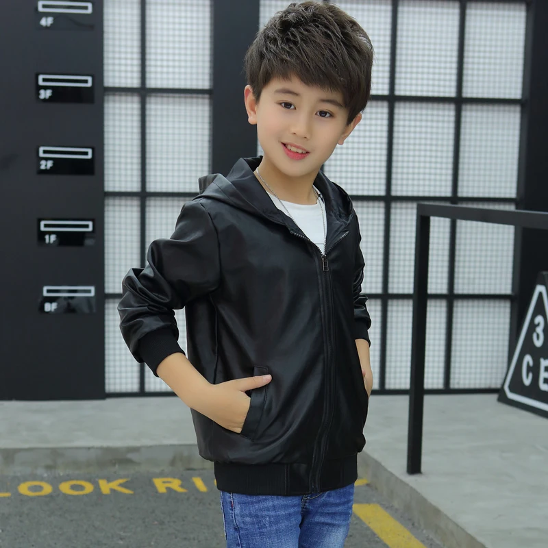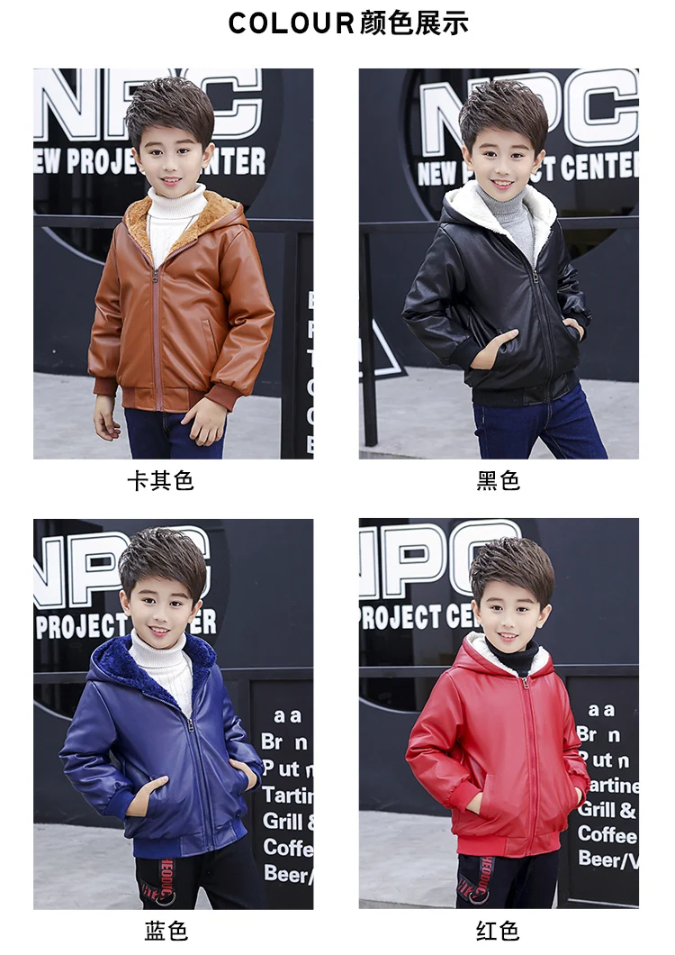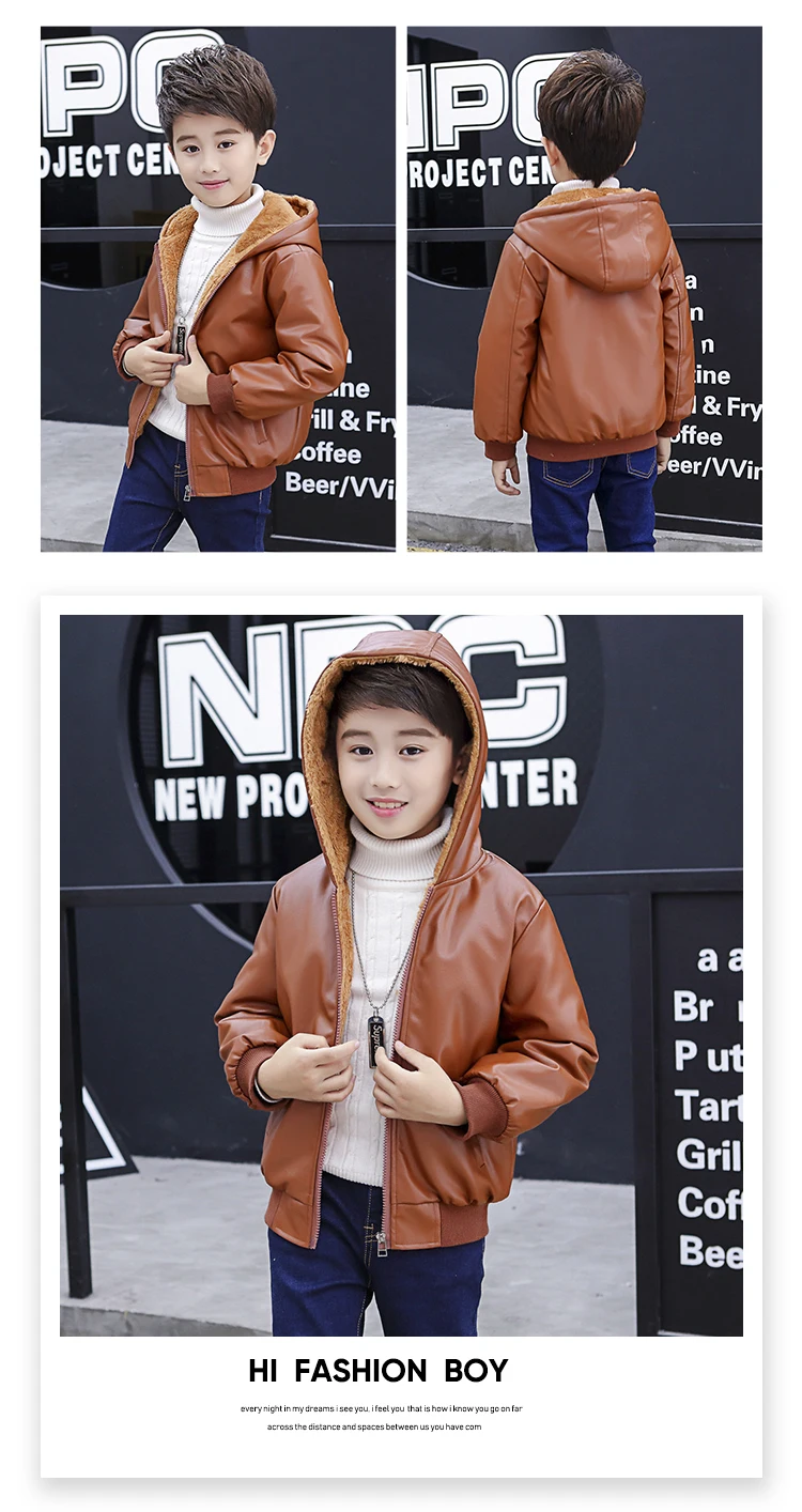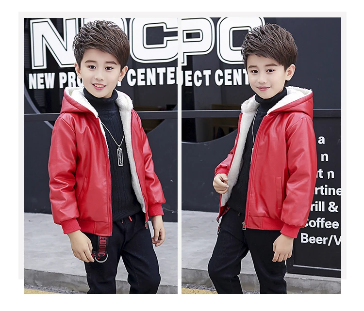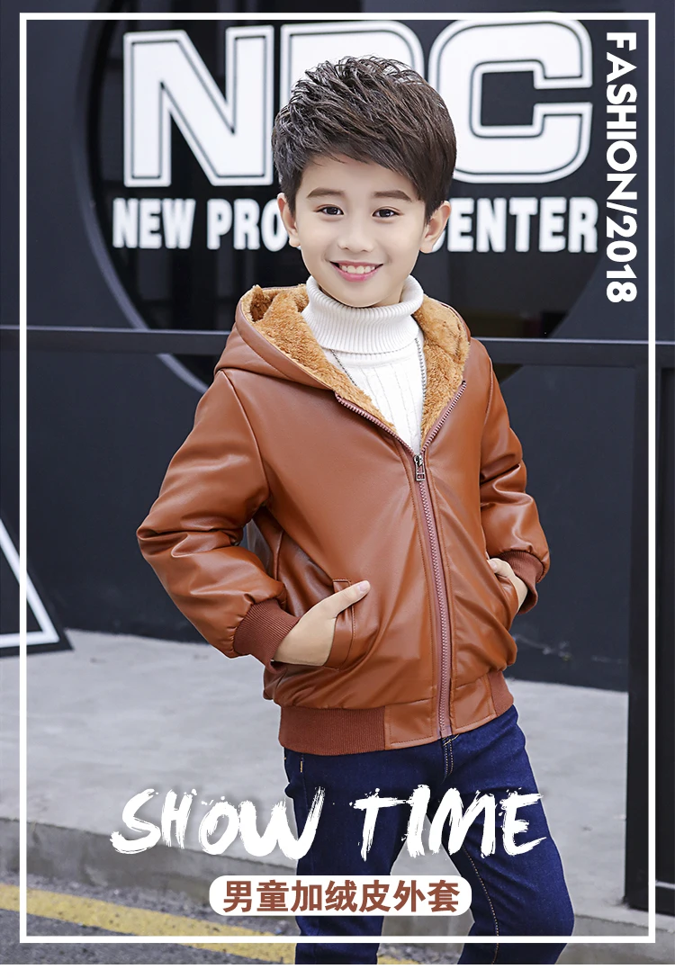 Куртка из искусственной кожи с капюшоном для мальчиков, куртка из искусственной кожи на бархатной подкладке, с большими карманами, 2021
