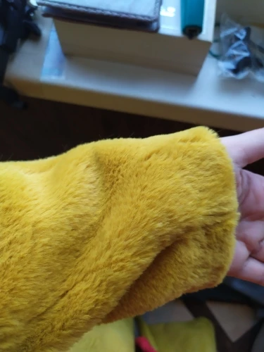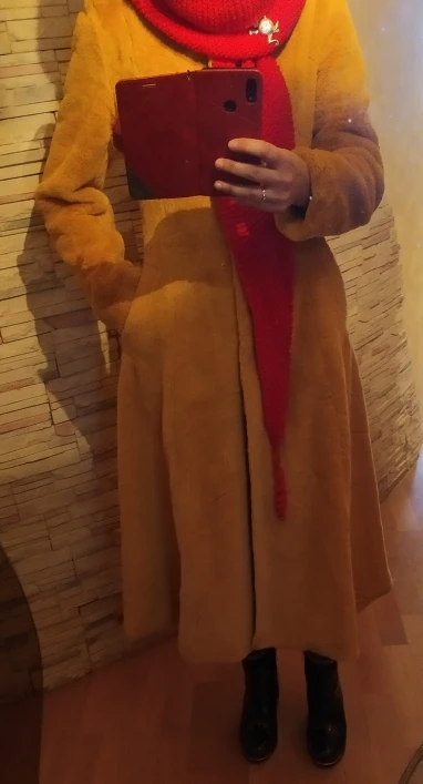 Посылка доехала довольно быстро для новогодних праздников. Шуба хорошая, на первый взгляд сшита качественно, посмотрю как будет в носке. Рукава по длине в самый раз. Единственное, что не совсем совпало - цвет. На картинке он ярко-желтый, а по факту скорее горчичный или грязно-желтый. На фото не получилось передать фактический цвет. И ещё мне показалось, что застежек маловато - 4 штуки всего, нижняя часть не фиксируется, а полы довольно длинные. Я бы еще одну добавила. А так для своей цены вполне качественный продукт.