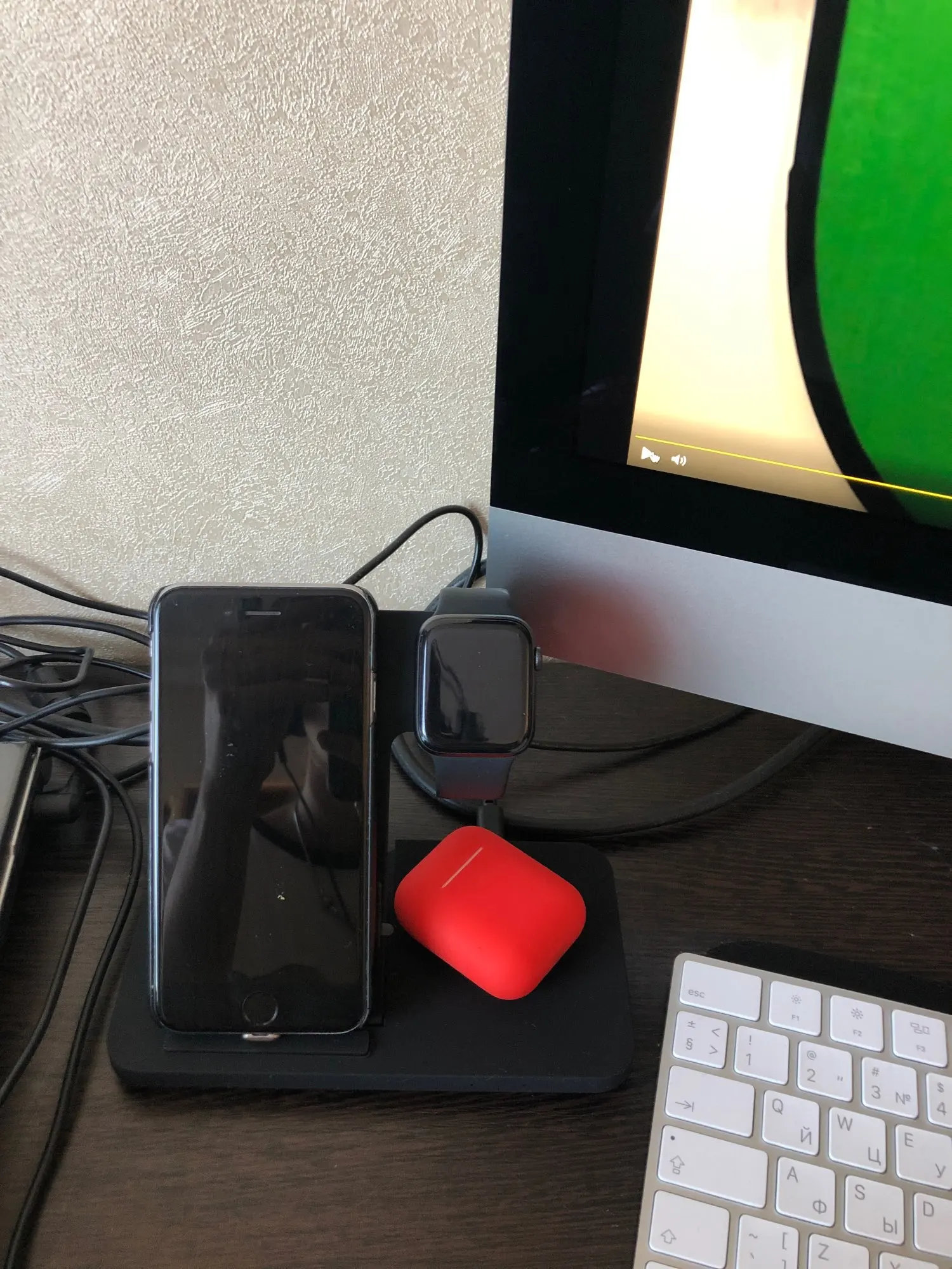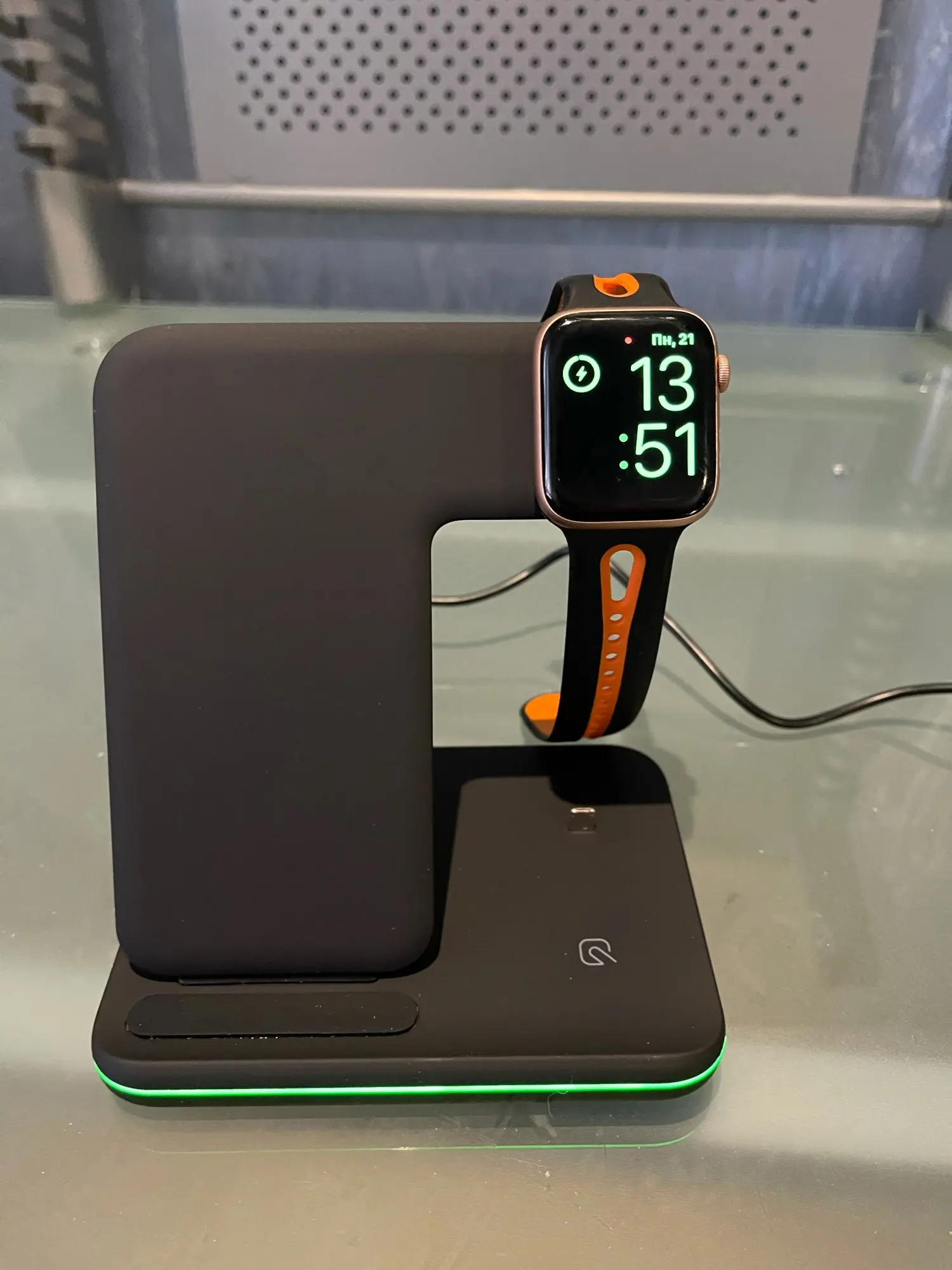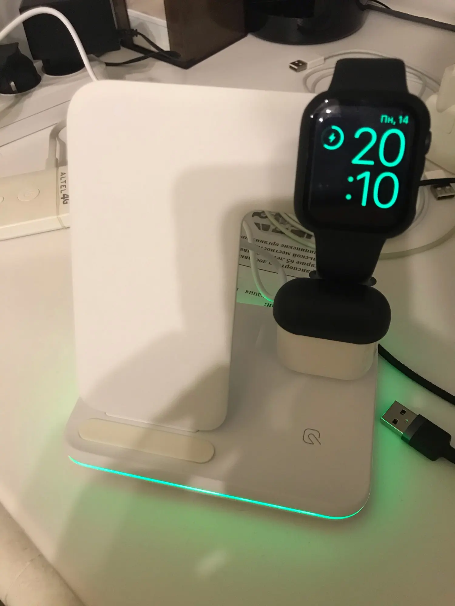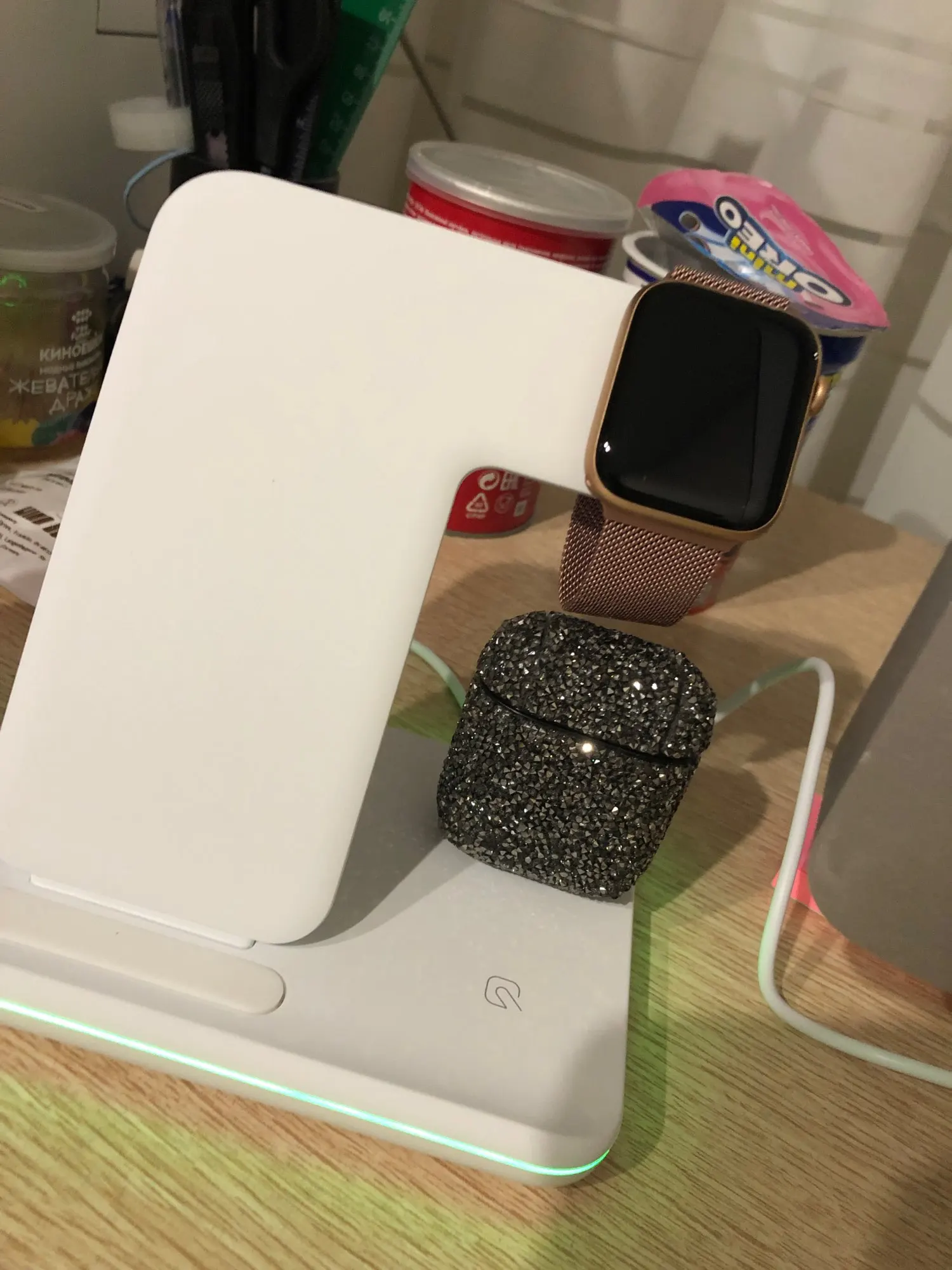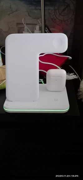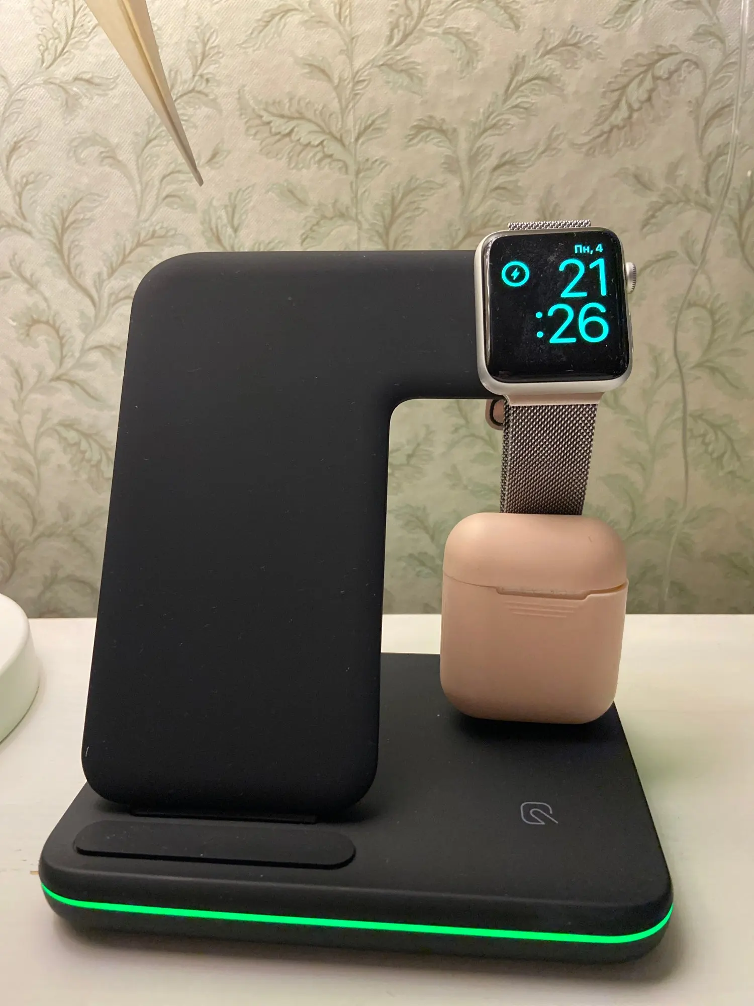 Заказ был доставлен всего за 2 недели, качество самой станции приятное на ощупь, чёрный цвет впишется в любой интерьер! Подсветка в режиме ожидания горит зелёным цветом, во время зарядки синим, можно также отключить полностью. Наушники заряжаются только вертикально контактным способом через маленький разъём. Apple Watch заряжаются медленно с частым отключением, живут своей жизнью (Видимо магнит слабый). В целом очень доволен!