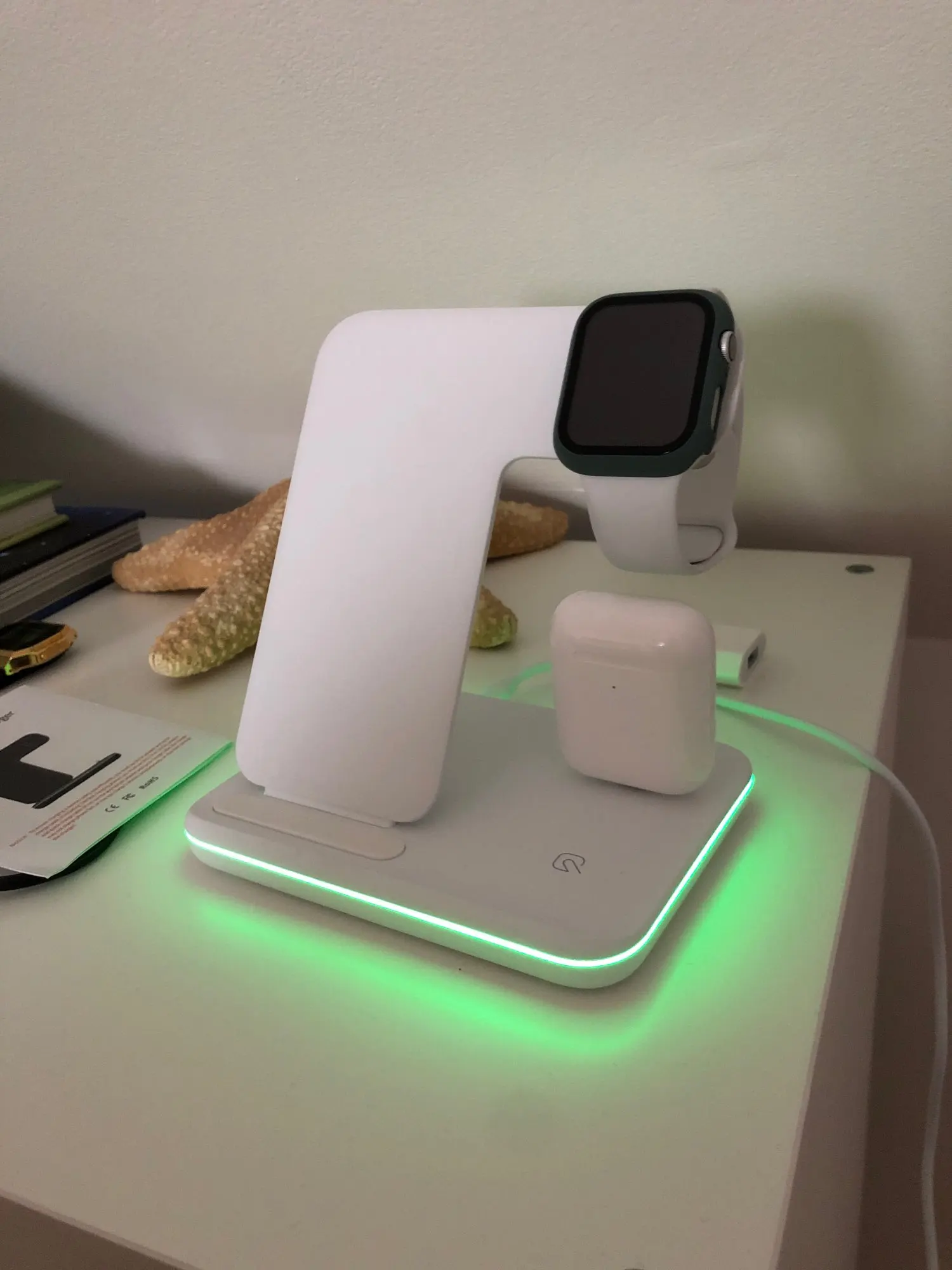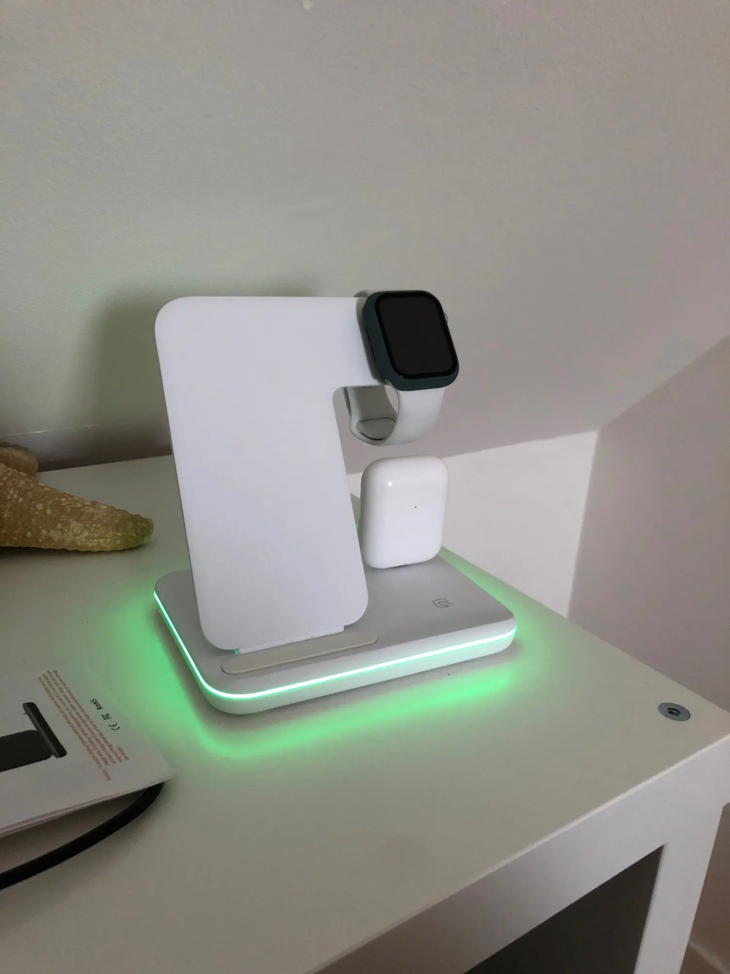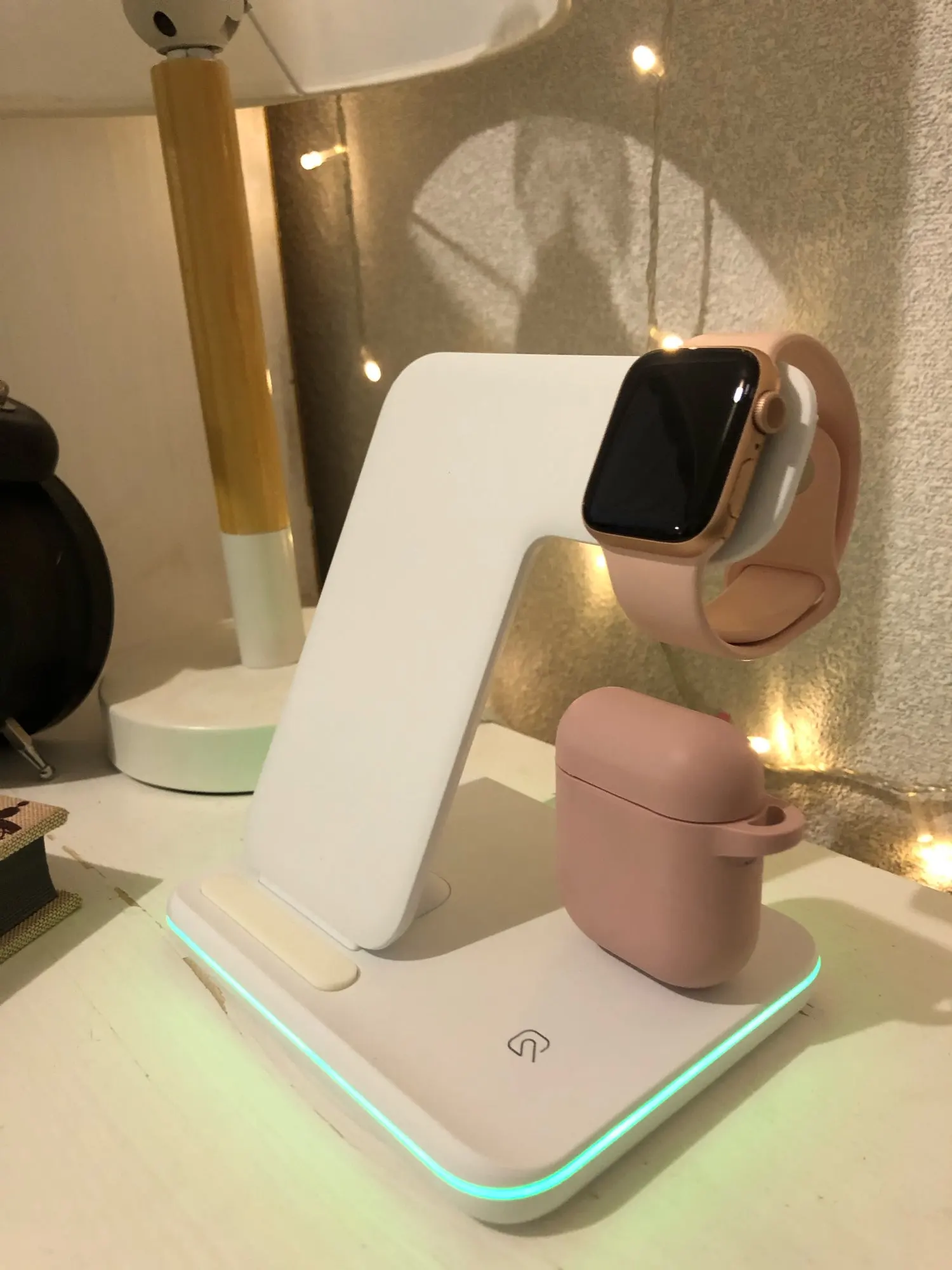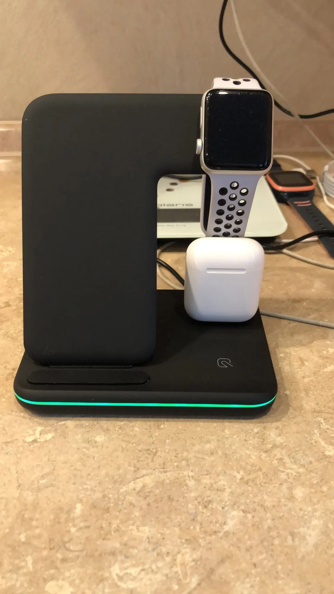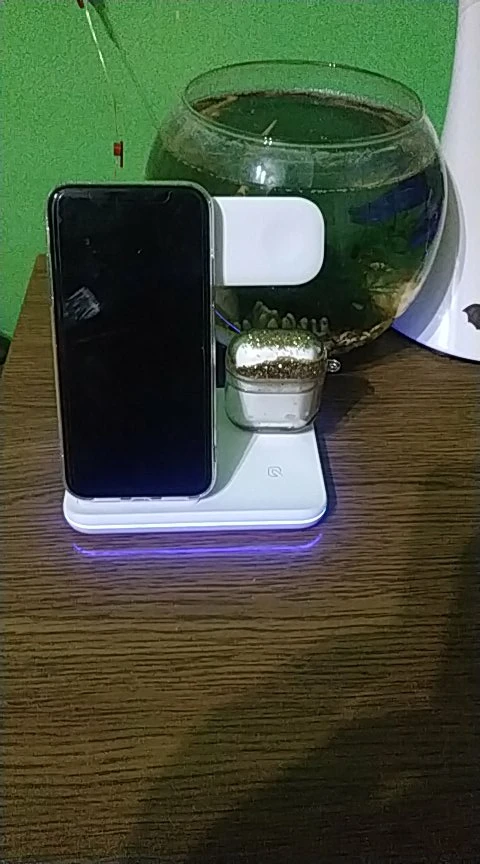Заказ был доставлен всего за 2 недели, качество самой станции приятное на ощупь, чёрный цвет впишется в любой интерьер! Подсветка в режиме ожидания горит зелёным цветом, во время зарядки синим, можно также отключить полностью. Наушники заряжаются только вертикально контактным способом через маленький разъём. Apple Watch заряжаются медленно с частым отключением, живут своей жизнью (Видимо магнит слабый). В целом очень доволен!