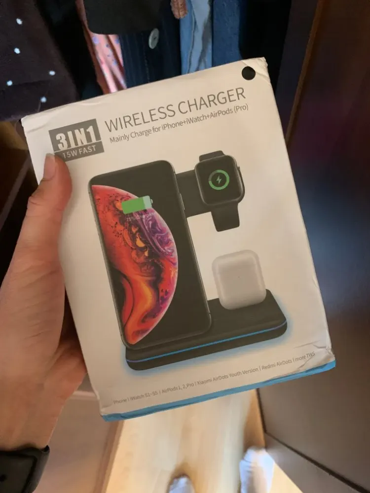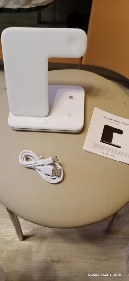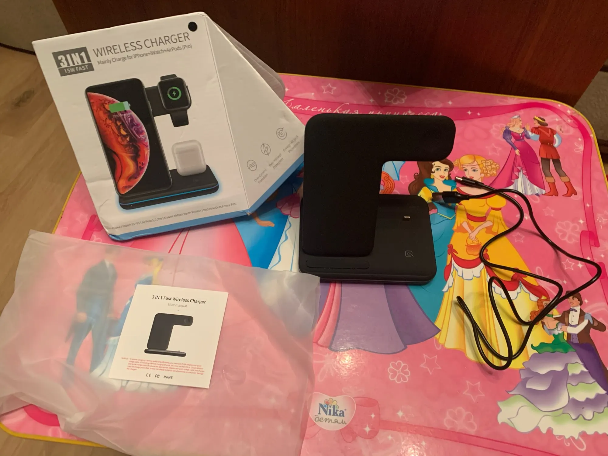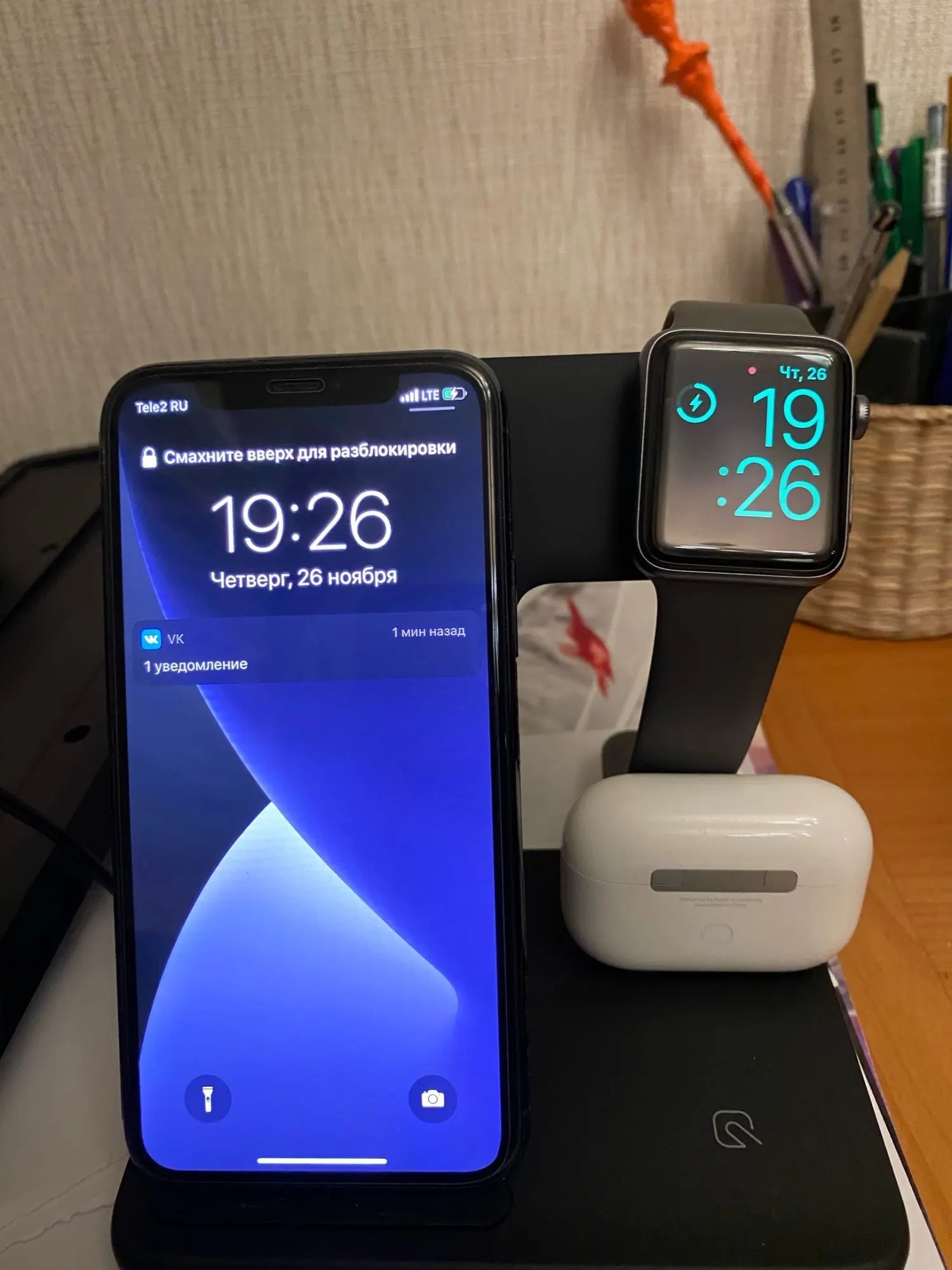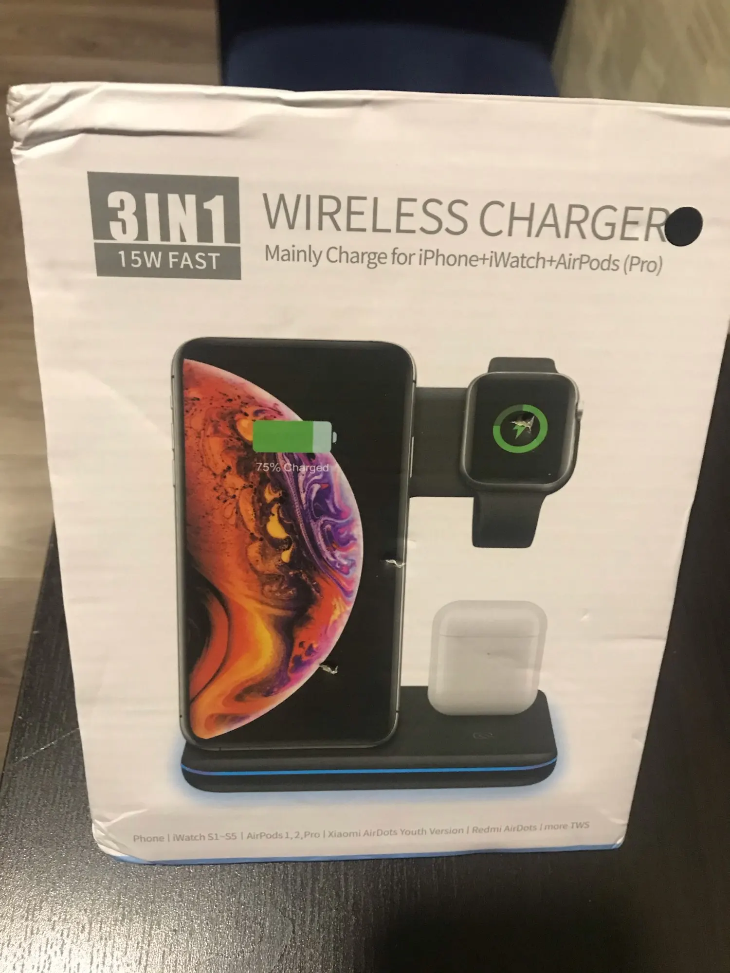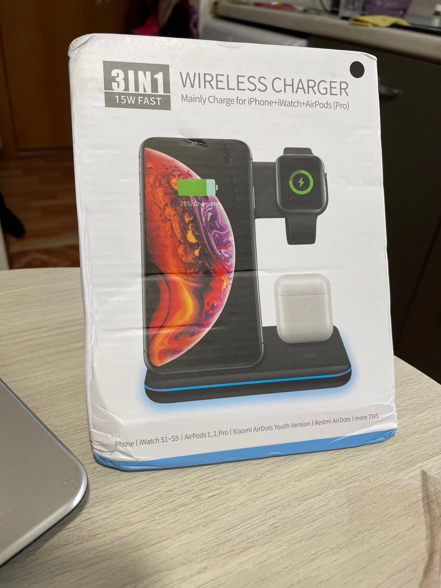 Пришла зарядка в Новосибирск за месяц. Выглядит очень красиво, никаких повреждений, коробка тоже целая. Мне показалось, что все три устройства не зарядишь вместе, только по 2. Но меня это не особо смущает. Заряжает по скорости как оригинальная зарядка, но самое главное — никаких миллионов проводов! Спасибо!