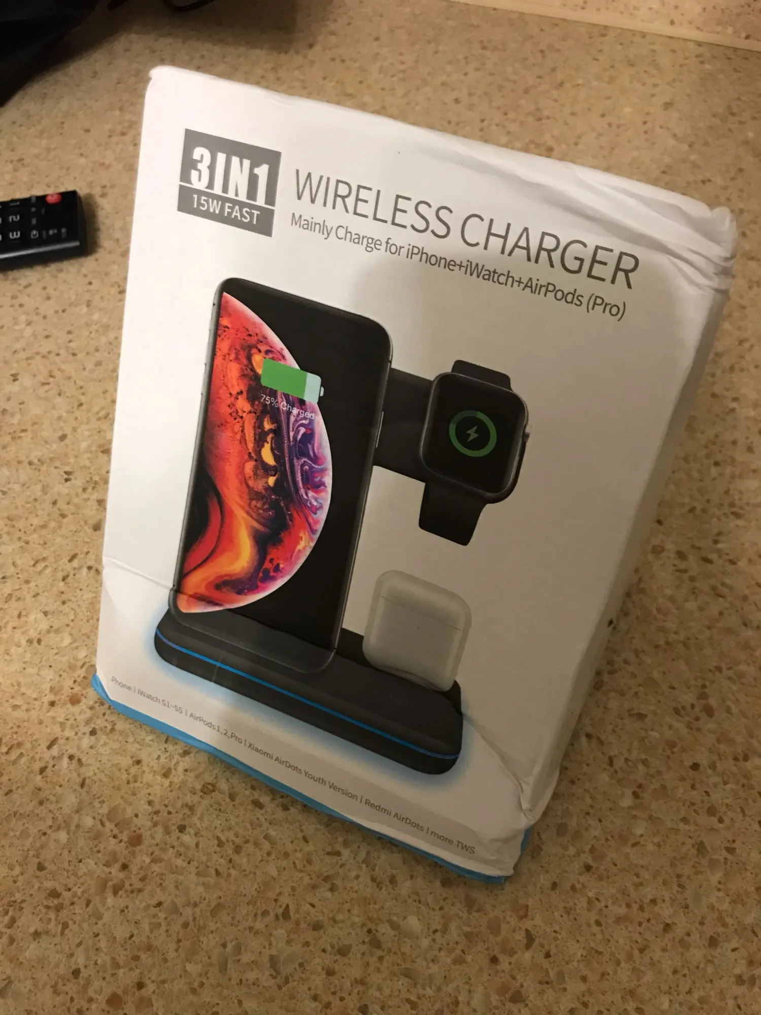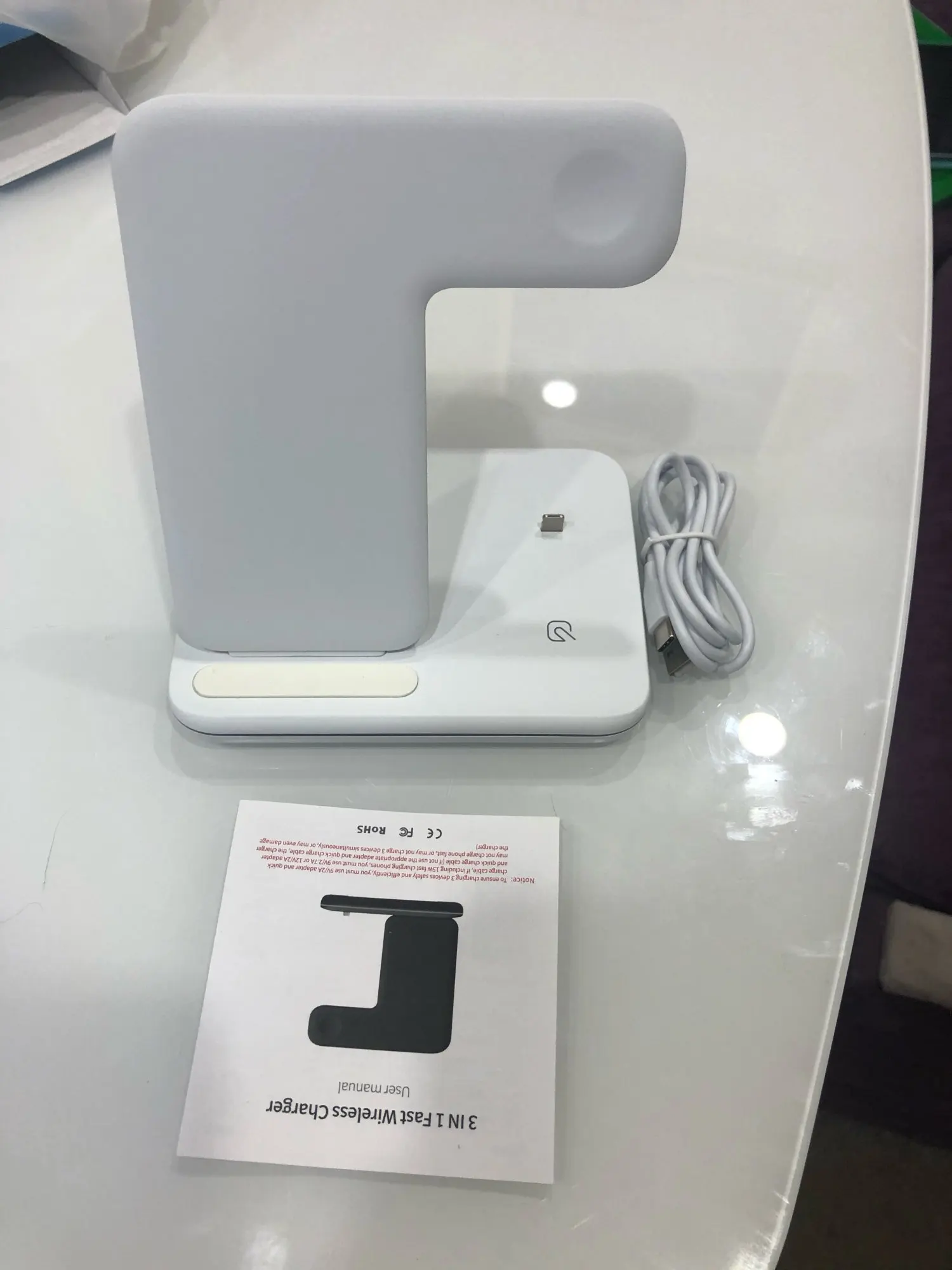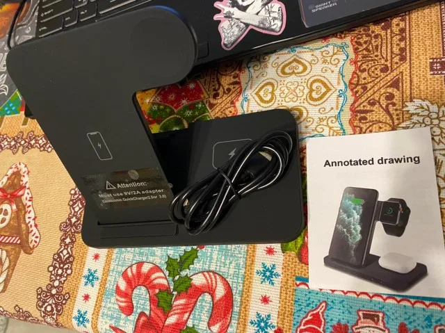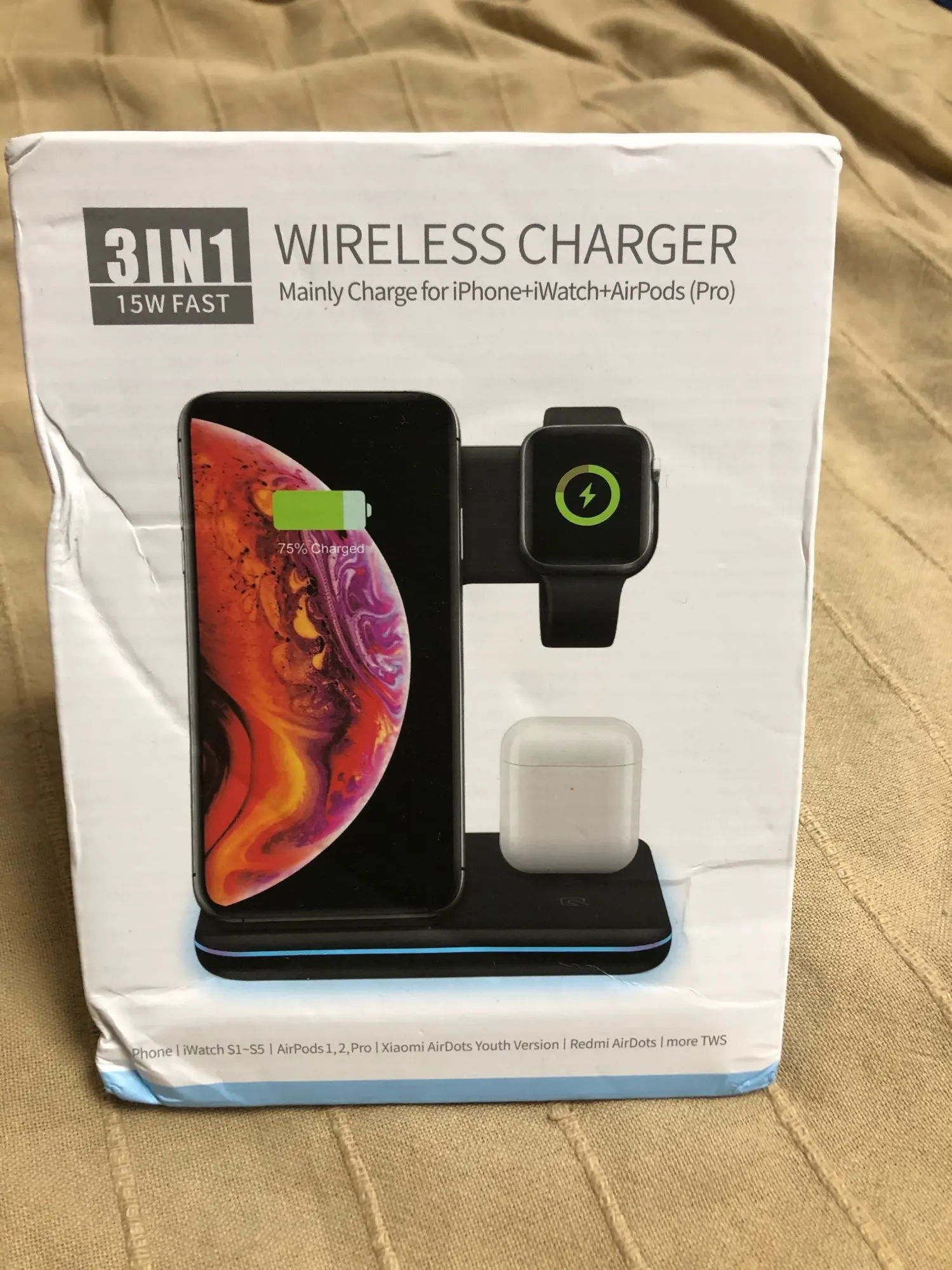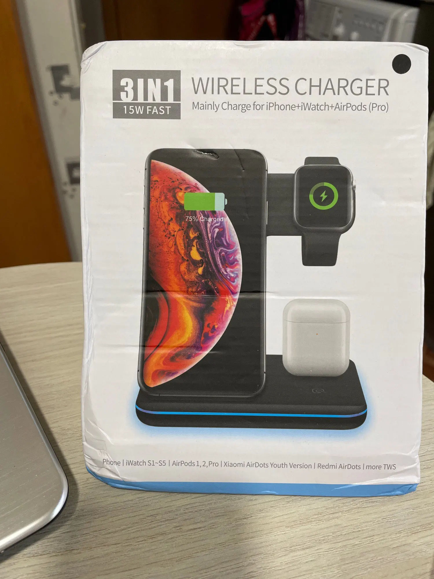 Пришла зарядка в Новосибирск за месяц. Выглядит очень красиво, никаких повреждений, коробка тоже целая. Мне показалось, что все три устройства не зарядишь вместе, только по 2. Но меня это не особо смущает. Заряжает по скорости как оригинальная зарядка, но самое главное — никаких миллионов проводов! Спасибо!