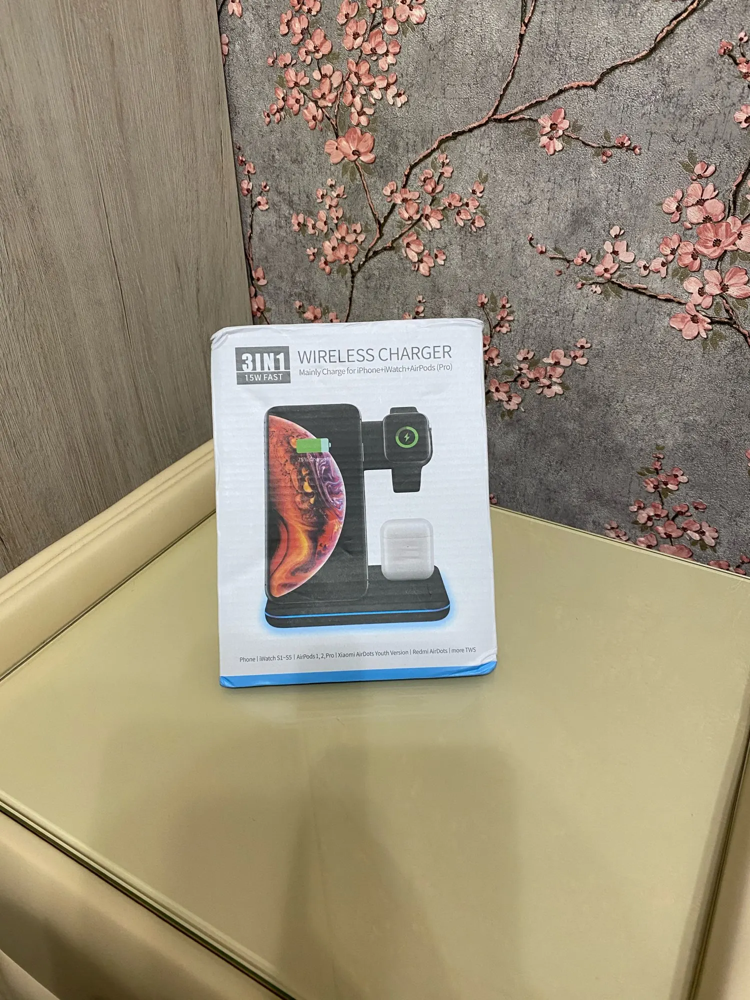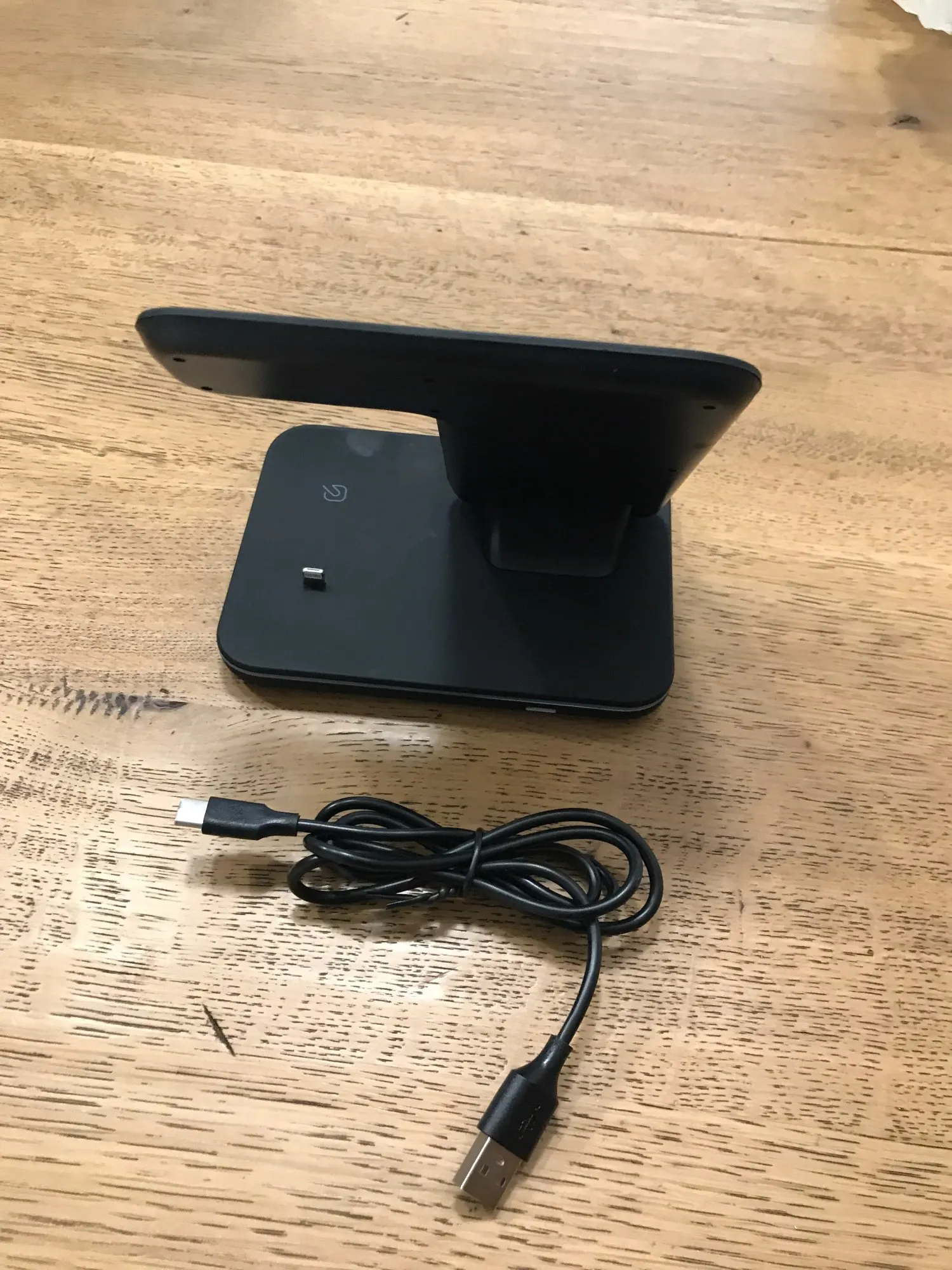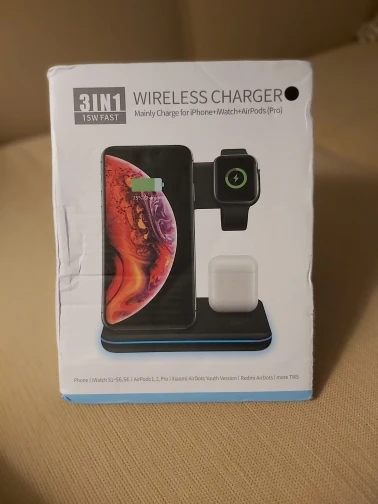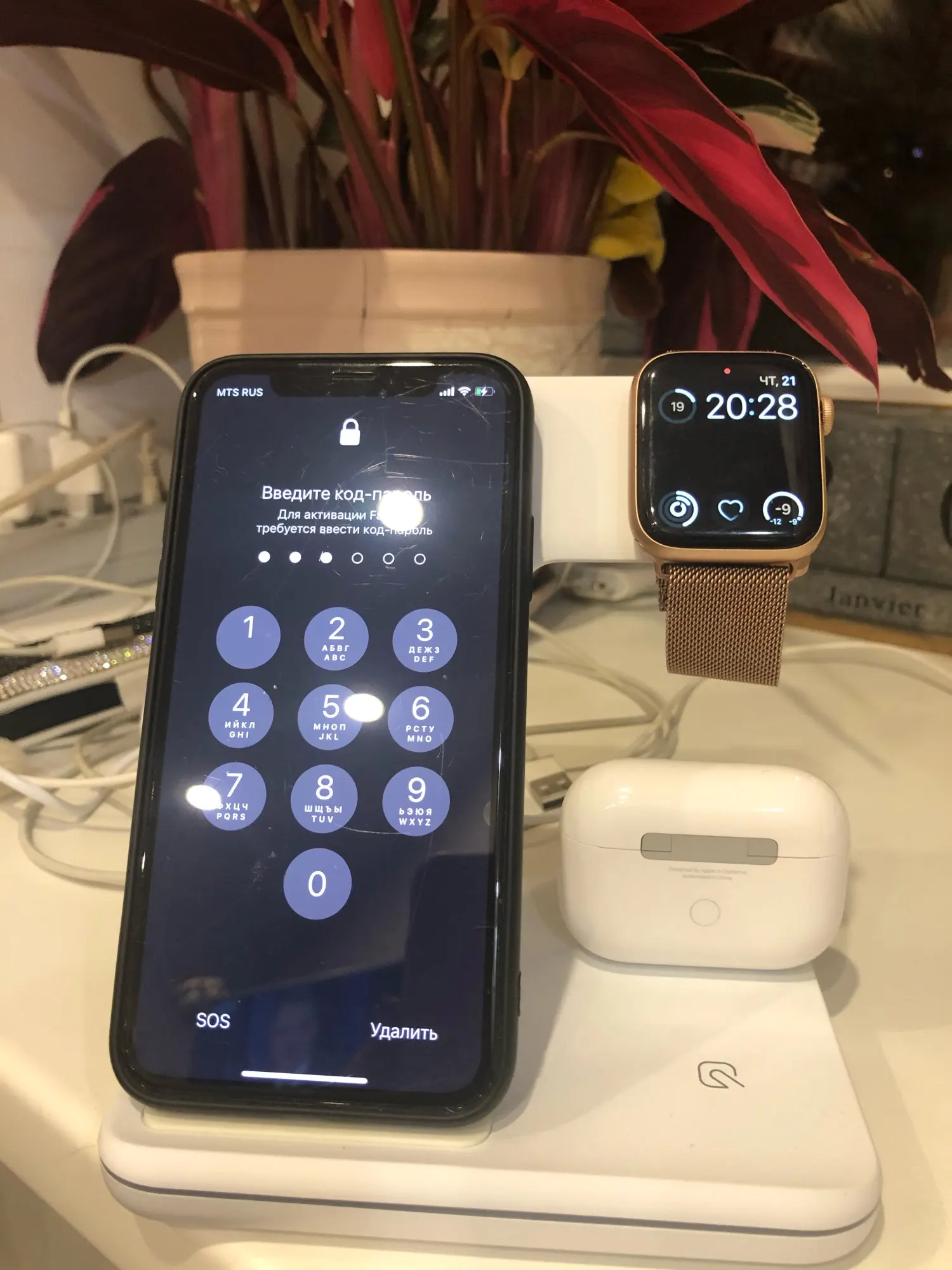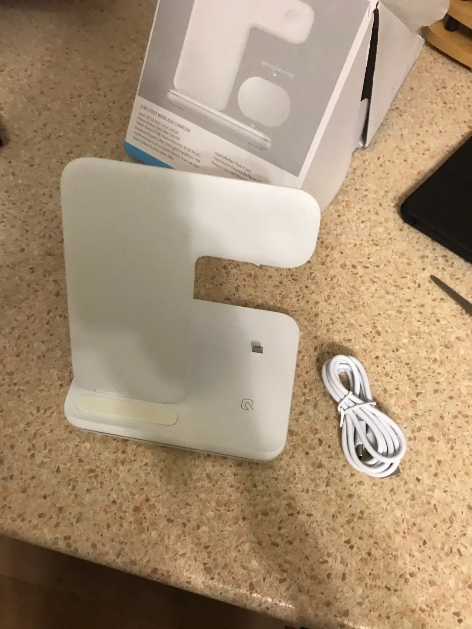 Пришла зарядка в Новосибирск за месяц. Выглядит очень красиво, никаких повреждений, коробка тоже целая. Мне показалось, что все три устройства не зарядишь вместе, только по 2. Но меня это не особо смущает. Заряжает по скорости как оригинальная зарядка, но самое главное — никаких миллионов проводов! Спасибо!