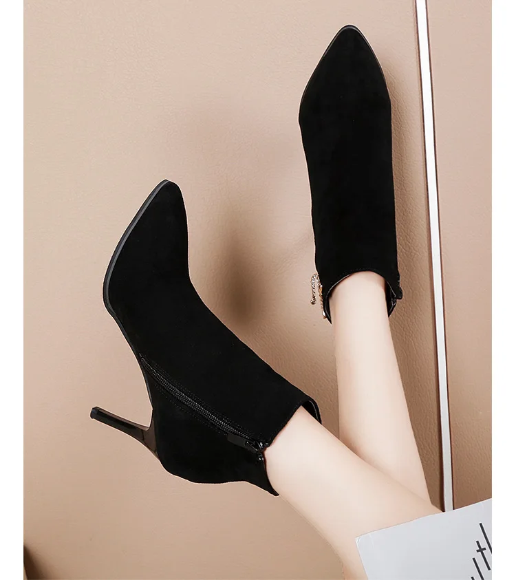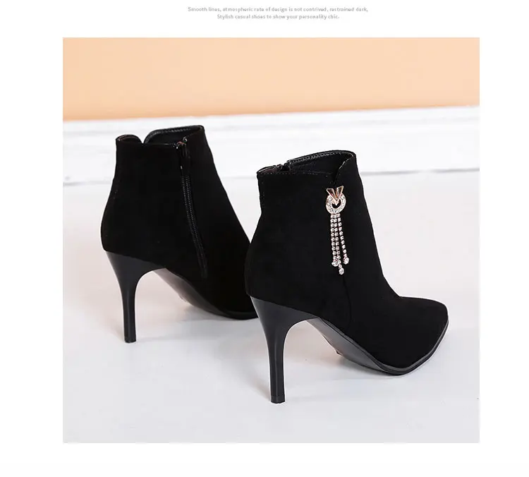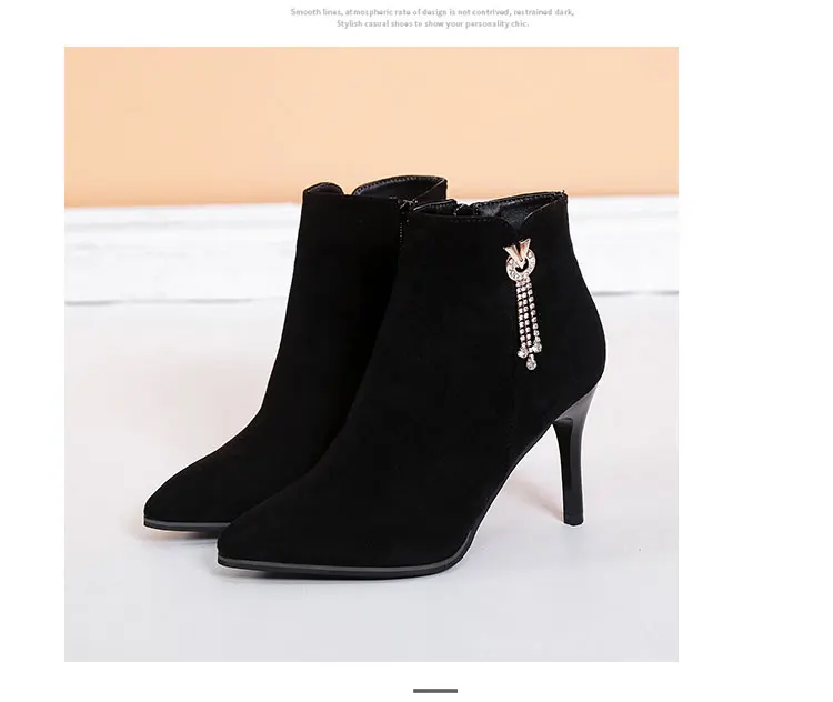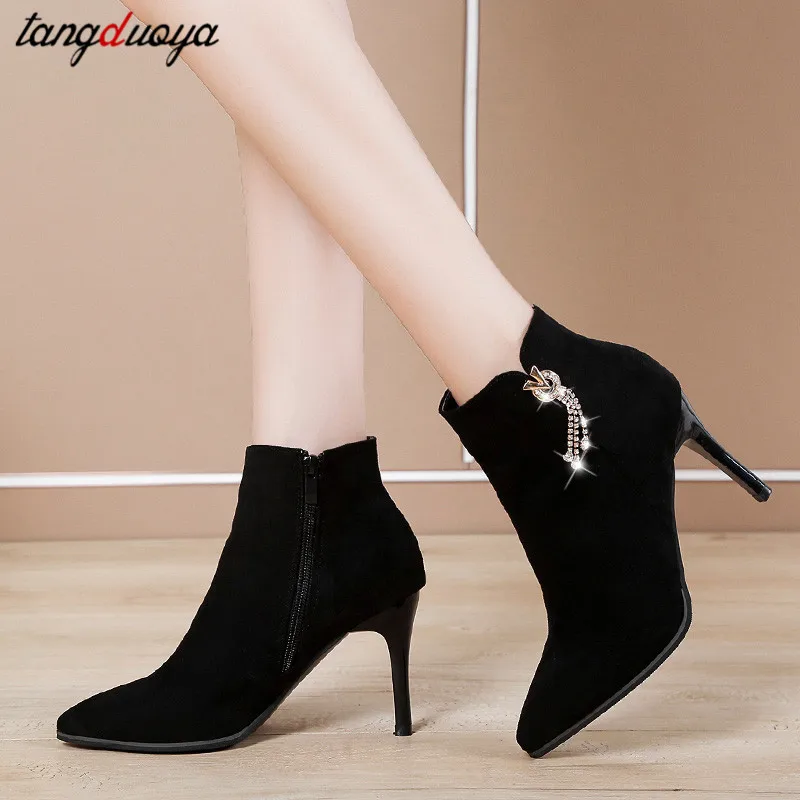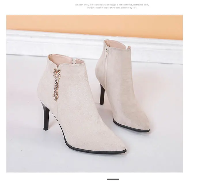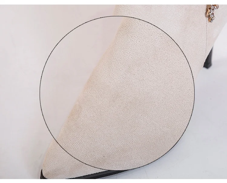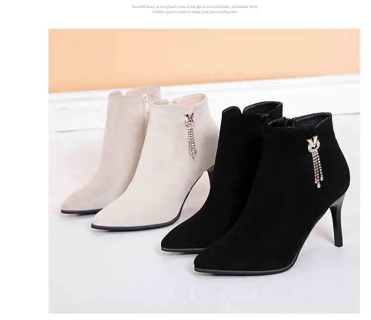 Ботильоны для женщин «Челси»; сезон осень-зима; женская обувь на высоком каблуке; цвет бежевый, черный; ботинки из искусственной замши; стразы; botas mujer