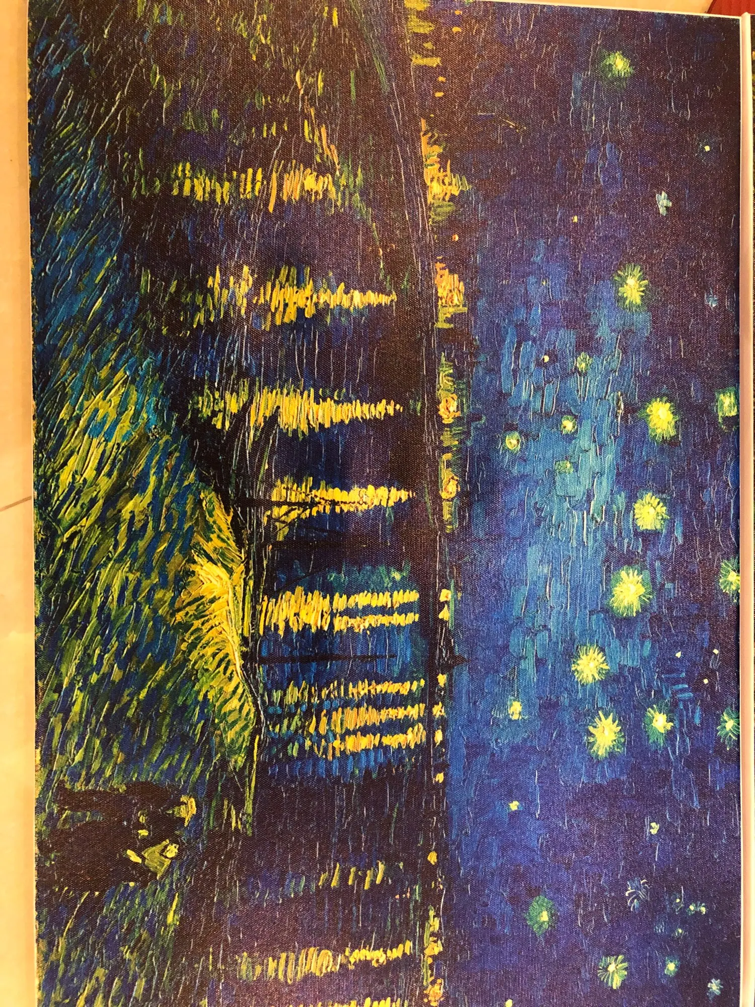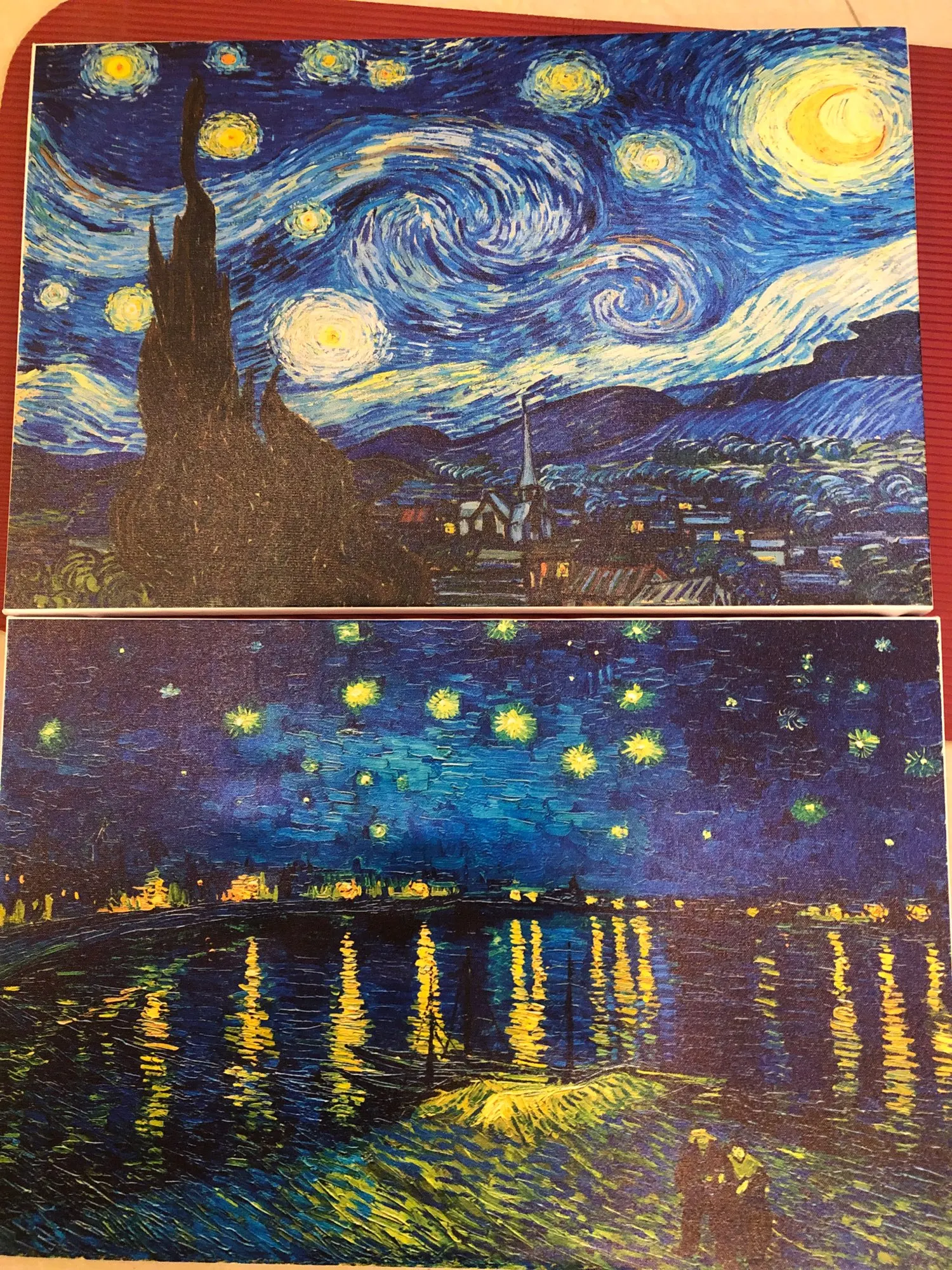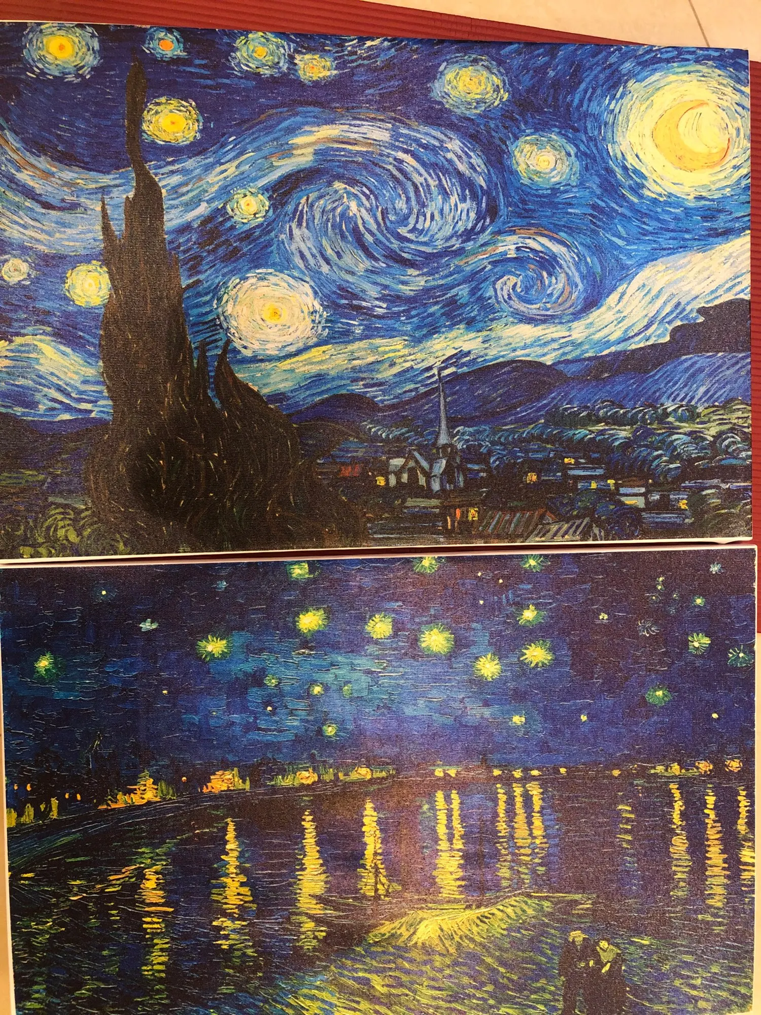 Доставка быстрая - две недели. Упаковка отличная. Размеры 60х41,5. Материал очень похож на кухонную клеёнку средней толщины. Запах достаточно едкий и неприятный, надеюсь это временно. Нити при поджигании плавятся и не горят. Цветопередача, гамма цветов, по моему, близки к идеалу. Разрешение немного разочаровало - похоже на 480р или даже на 360р - не размазано, но недостаточно четко прорисовано (прилагаемые фото сжимаются, на них качество хуже, чем на копии картины). Общее впечатление хорошее - получена неплохая копия очень хорошей, может быть самой любимой картины великого Ван Гога!