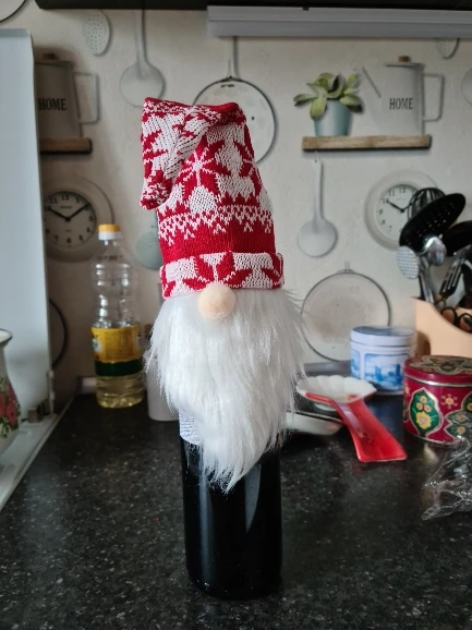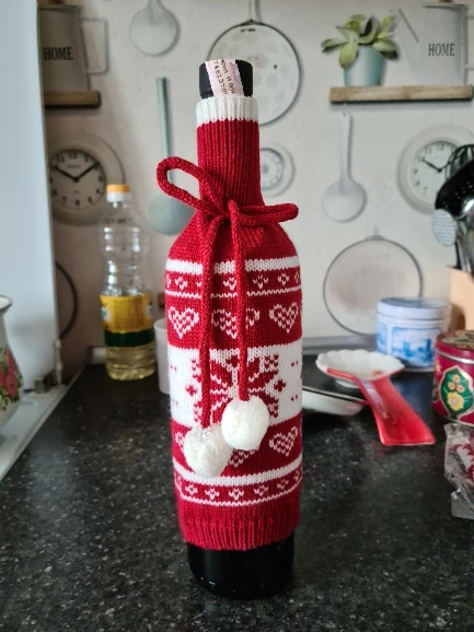 très bonne qualité (bonne finition, tissu épais, fourrure épaisse), les couleurs sont harmonieuses (aux couleurs de noël) = ne convient pas pour des bouteilles d'eau de 1,5 L mais plutôt comme sur la photo à une bouteille de vin. Je recommande
